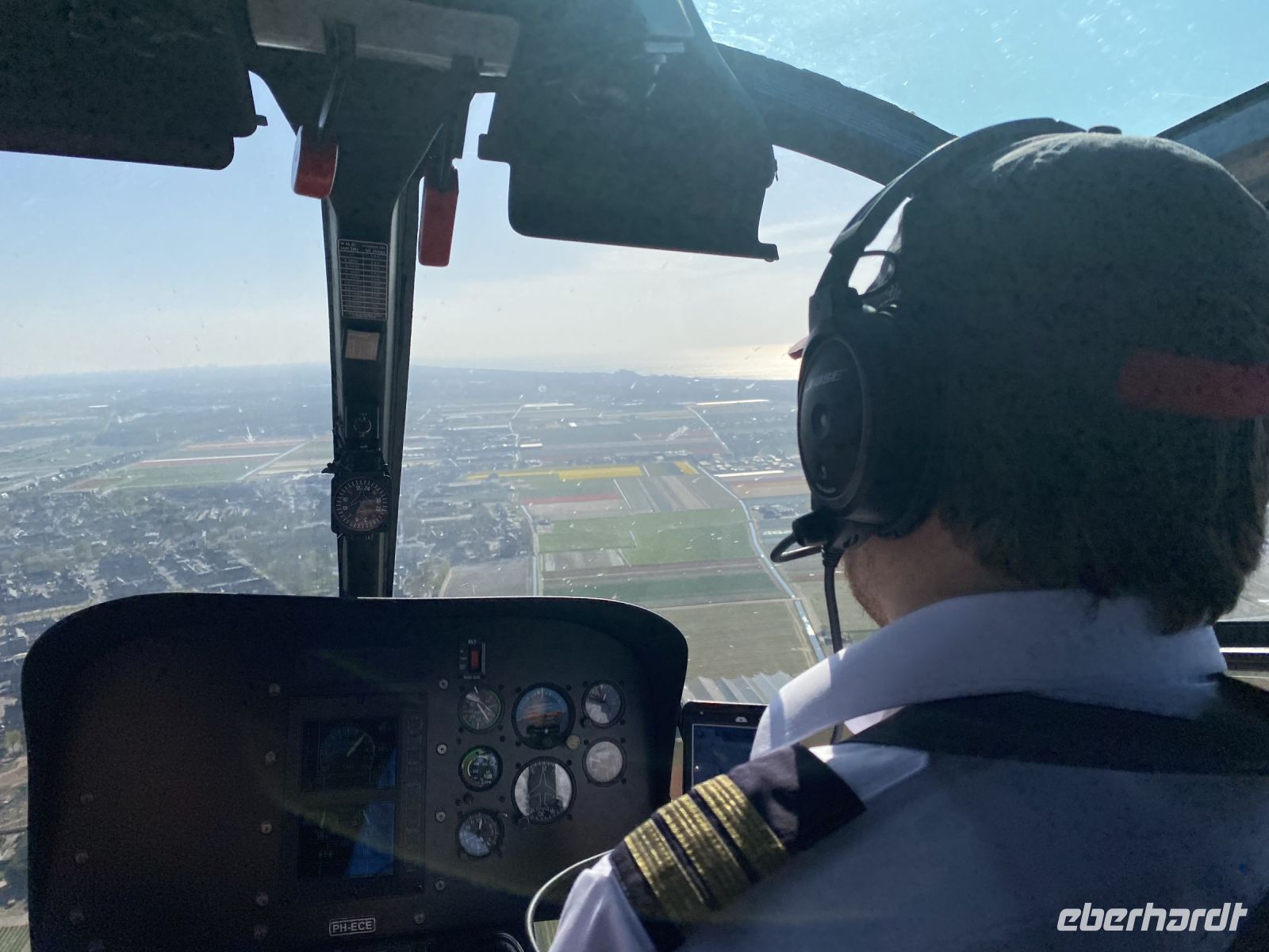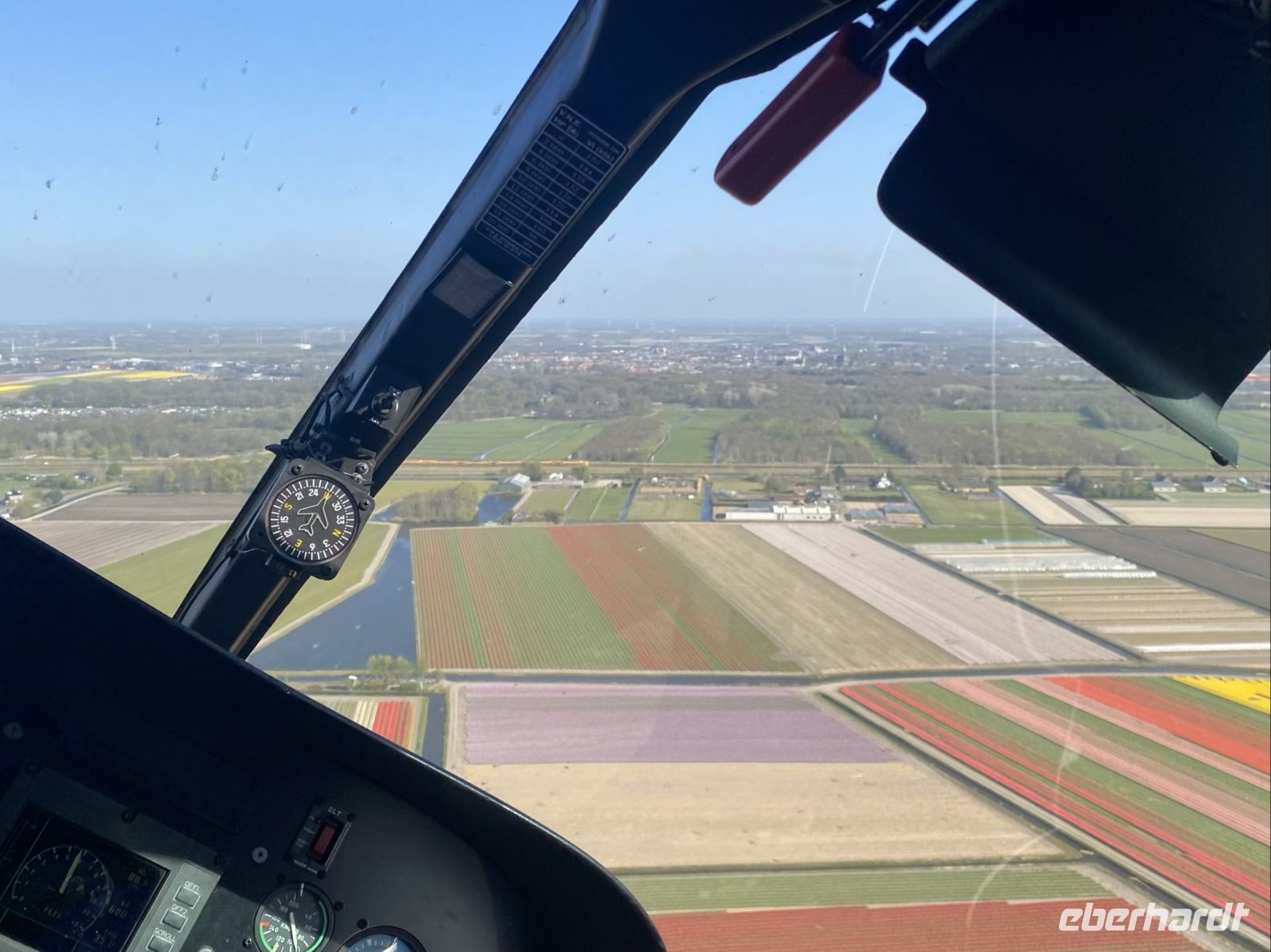Nun erwarten uns auch noch ein bis zwei andere Highlights. Ein Teil der Gruppe ist vollkommen abgehoben und krönt den Tag mit einem Tulpenflug. Ein Eurocopter EC120B Colibri bringt uns in luftige Höhen. Von hier oben sieht man Felder voller Farbenpracht Windmühlen und vorbeifahrende gelben da Züge, was für ein Erlebnis!