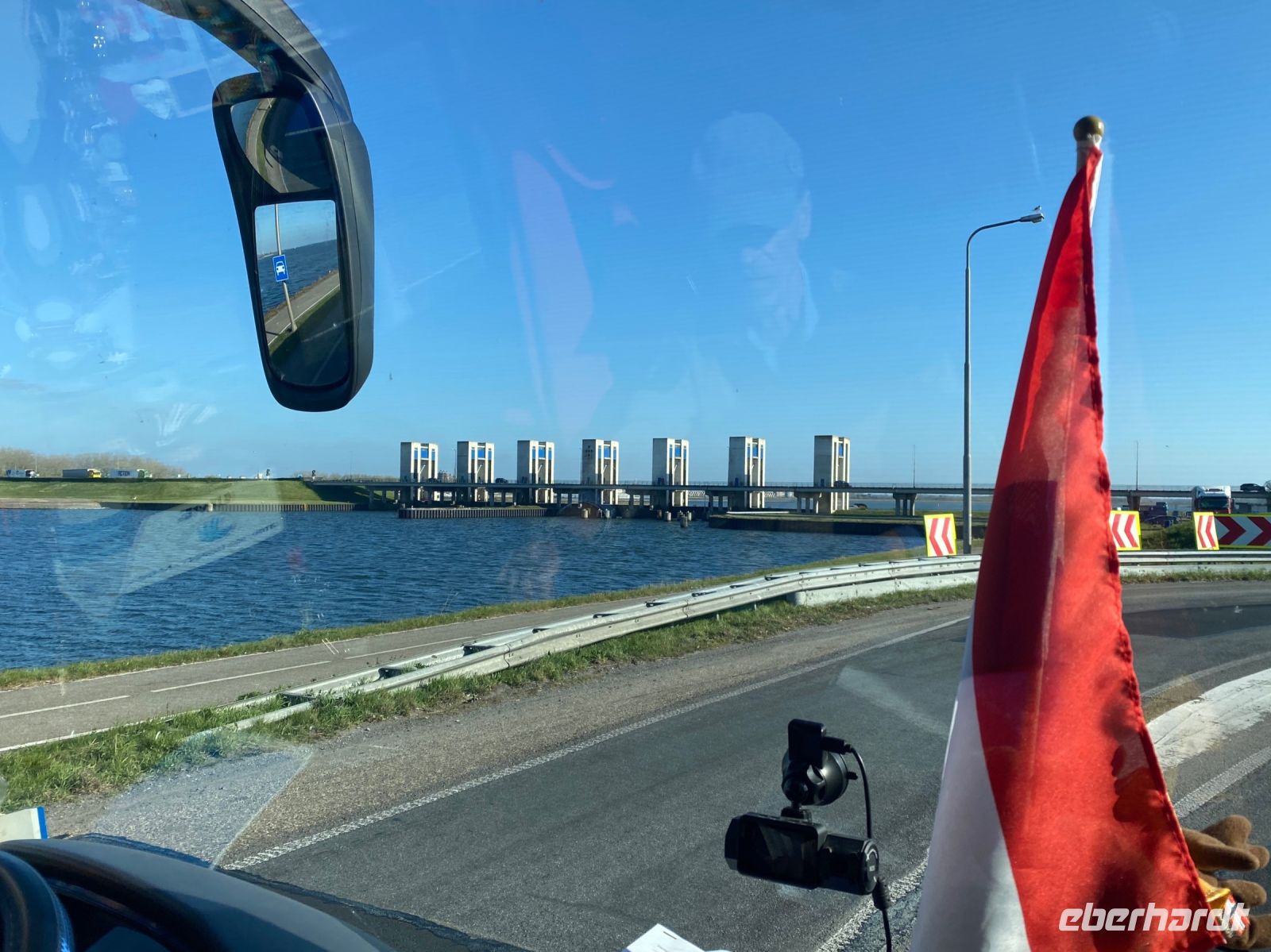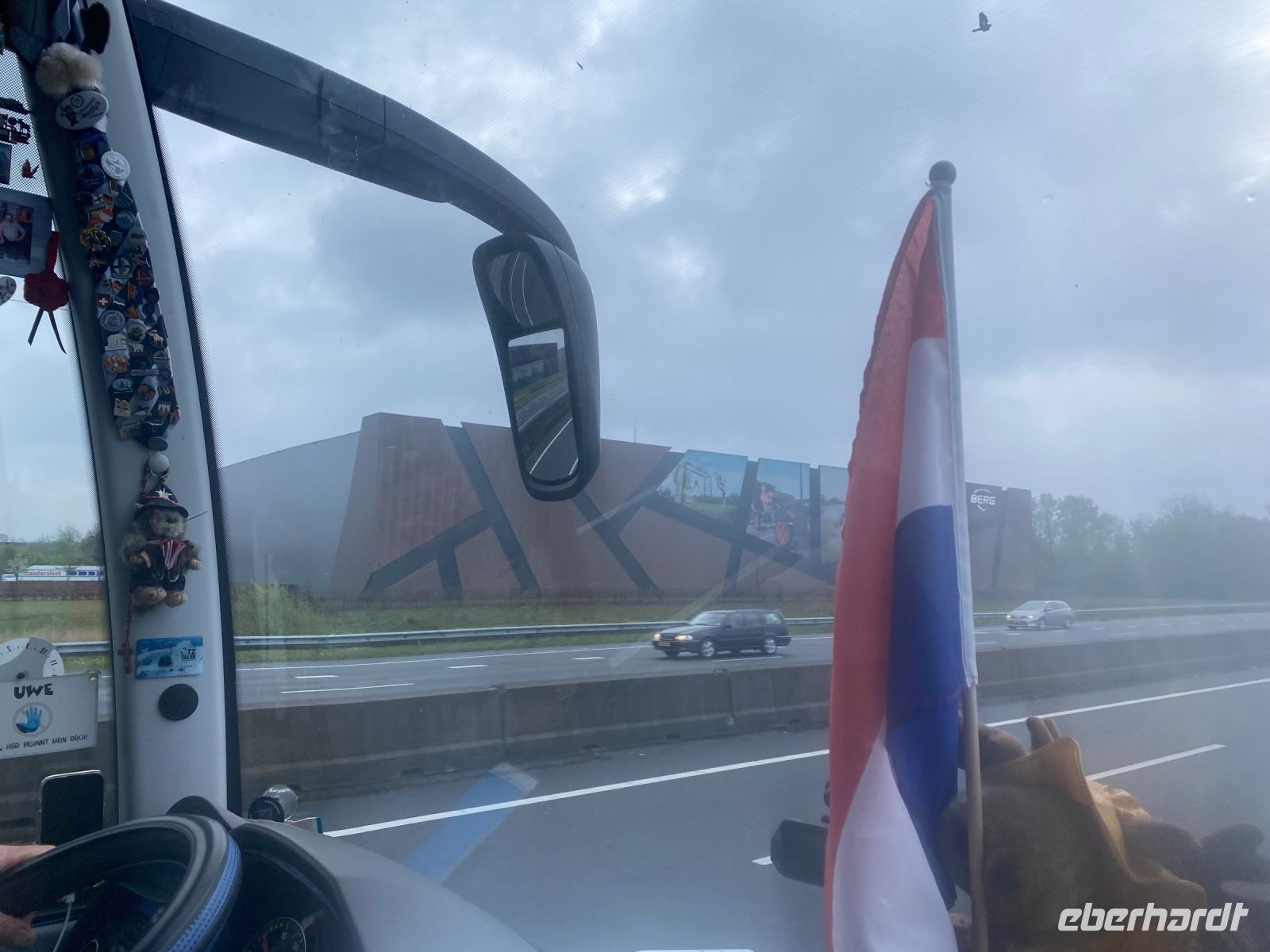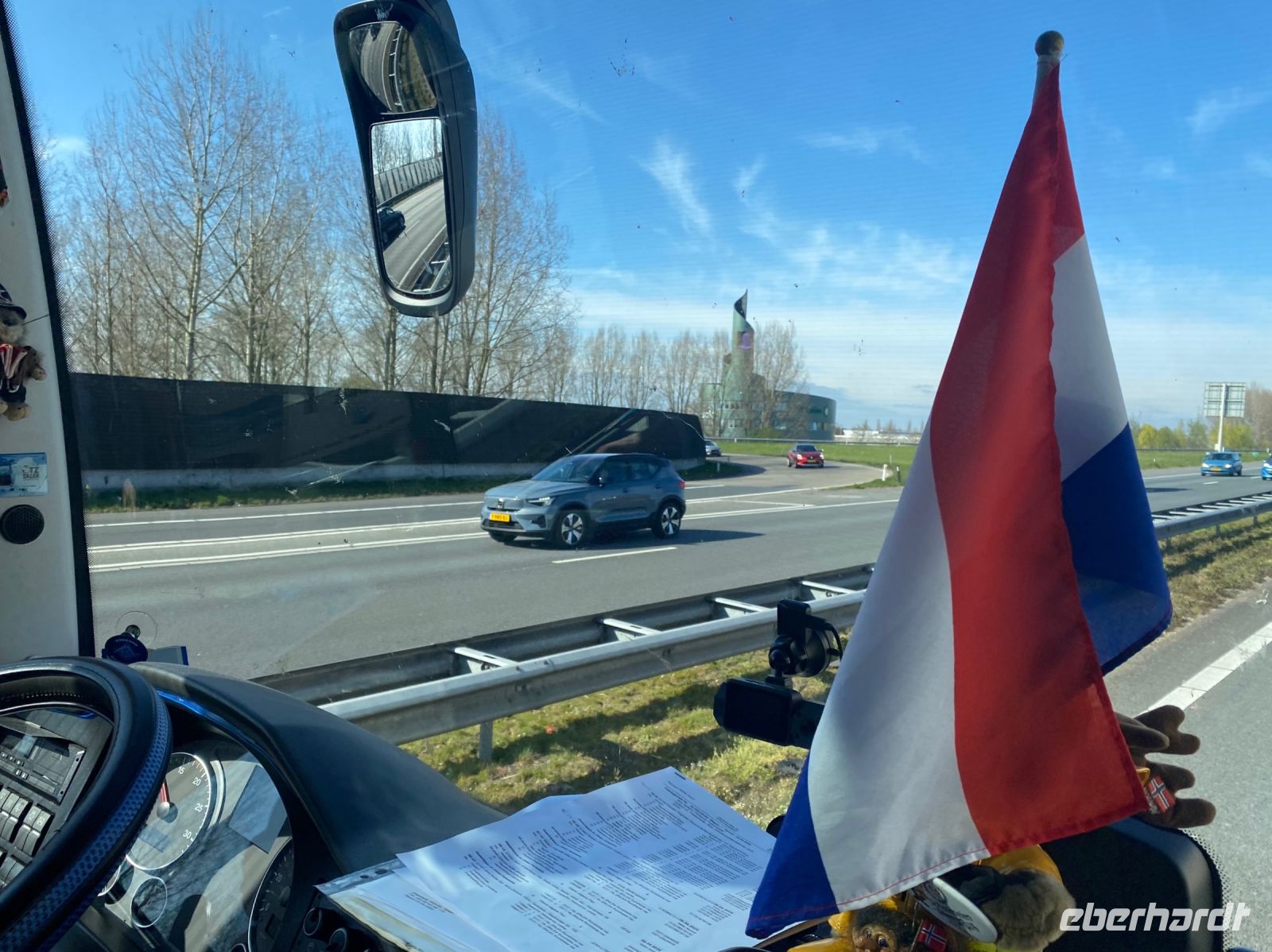 Entspannt geht es weiter und schließlich überqueren wir die Grenze zu den Niederlanden, deren flache Landschaft ihrem Namen gerecht wird. Die niederländische Flagge wird im Bus zur Hymne von Wilhelmus gehisst, wir sind in den Niederlanden – oder in Holland? Der eine Name steht fürs Ganze, so wie manche Länder alle Deutschen als Sachsen bezeichnen!