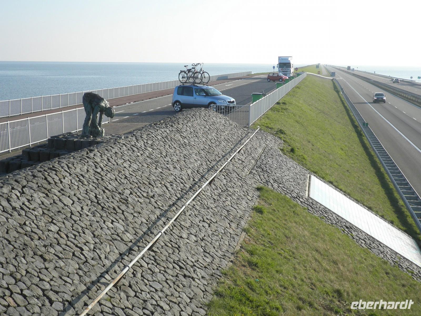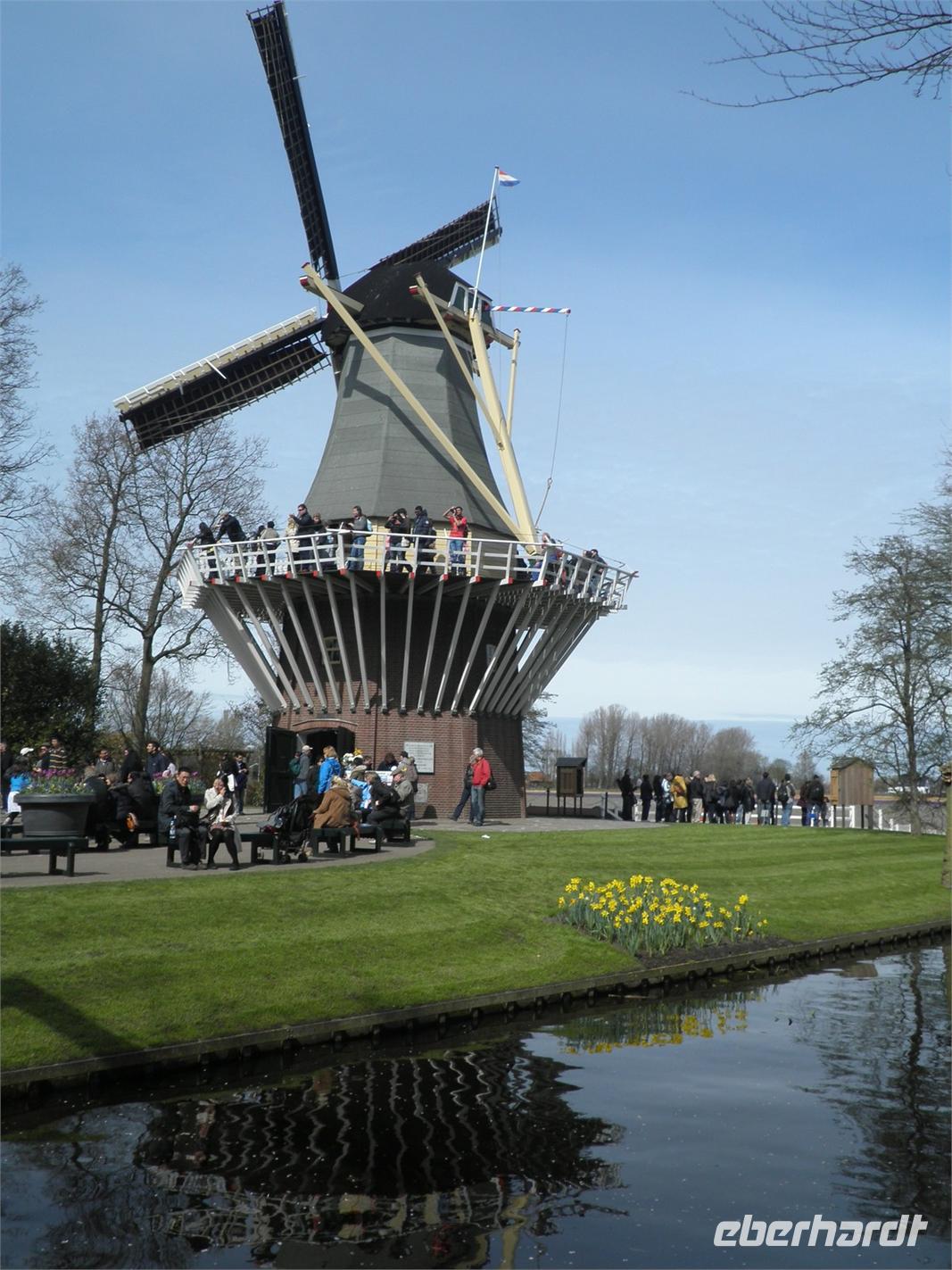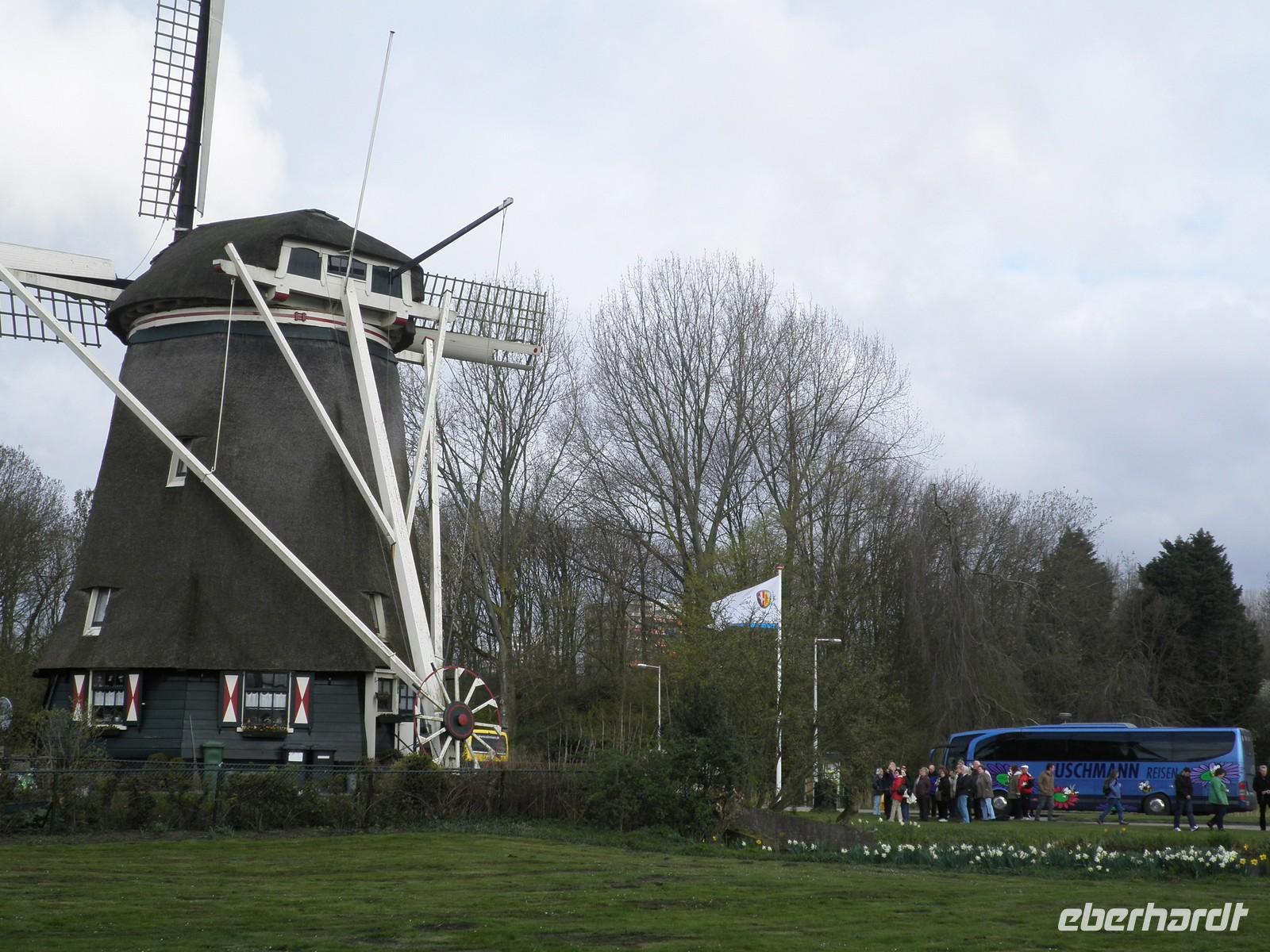 1. Tag: Donnerstag - Anreise Bei etwas trüben Wetter, das uns auch ein paar Tropfen Regen bescherte, ging es am frühen Morgen ab Dresden los. Unterwegs in Richtung Westen hielt unser Bus noch mehrmals an und nahm weitere Reisegäste auf, bis wir ab Neudietendorf alle beisammen waren und unsere Osterreise in die Niederlande beginnen konnte. Die Fahrt verlief reibungslos, wir durchquerten sogar das Ruhrgebiet ohne Probleme auf den Straßen. So kamen wir am späten Nachmittag schon an unserem Hotel Haje Joure in der niederländischen Provinz Friesland an. Kurz zuvor waren wir über den Nordoostpolder gefahren, und hatten den ersten Eindruck davon gewonnen, welche gigantischen Leistungen das Land beim Deichbau und damit dem Gewinn von neuem Land aus der Nordsee vollbracht hat und weiterhin vollbringt. Der Nordoospolder ist ein Gebiet, das einzig und allein durch den Menschen als Land existiert und vorher komplett unter Wasser gelegen hatte. 2. Tag: Freitag - Abschlussdeich, Käsemarkt Alkmaar, Keukenhof Wir wurden geweckt von strahlendem Sonnenschein, der uns aus unseren Betten lockte. Gestärkt von einem guten Frühstück stiegen wir in unseren Bus und waren doch überrascht, dass es trotz der Sonnenstrahlen noch ziemlich kalt war. Unsere Fahrt begann und wir verließen das "Festland" und kamen zum Abschlussdeich, einem gewaltigen Deichbauprojekt. Entlang des Deiches führt eine mehrspurige Schnellstraße, natürlich auch breite bequeme Fahrradwege, die schon an diesem Morgen gut befahren waren. Der Deich ist etwa 30 km lang, an der Stelle, an der die letzte Lücke im Deich geschlossen worden war, steht ein Denkmal für den Wasserbauingeneur Lely. Nur durch seine Berechnungen war es möglich, dieses gewaltige Projekt zu realisieren, er ist somit der "Vater des Abschlussdeiches", auf den die Niederländer zu Recht stolz sind. Auf einer Fußgängerbrücke kann man die Autobahn überqueren und ein Monument zu Ehren der Erbauer des Deiches besteigen. Von dort oben hat man einen schönen Blick über das Wattenmeer und das Jisselmeer.