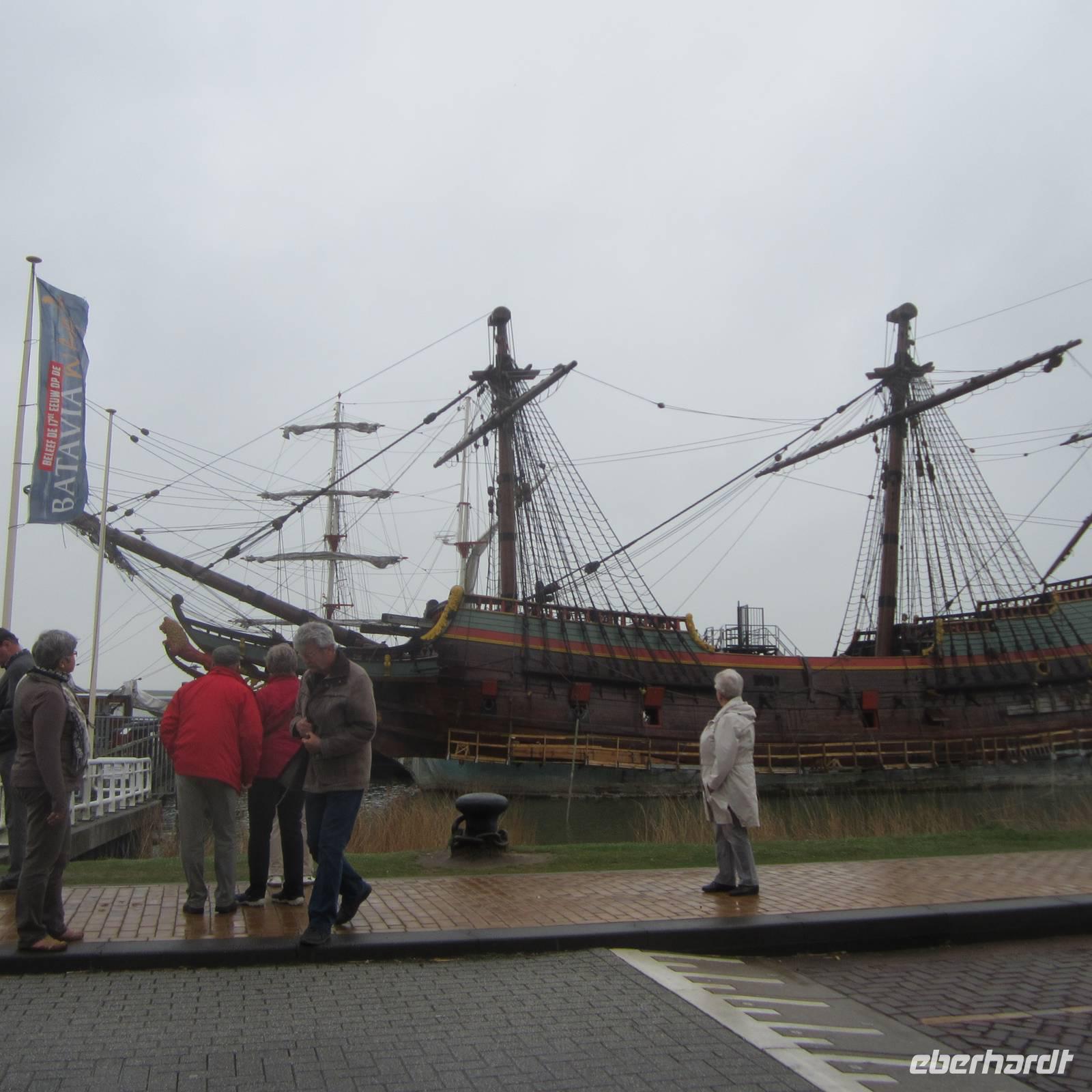 Unsere Fahrt zum Hotel geht  über den Markermaarddik (30km), nach Lelystadt. Zeit ist noch für einen Fotostopp an der Batavia,  dem rekonstruierten Schiff von 1628.
