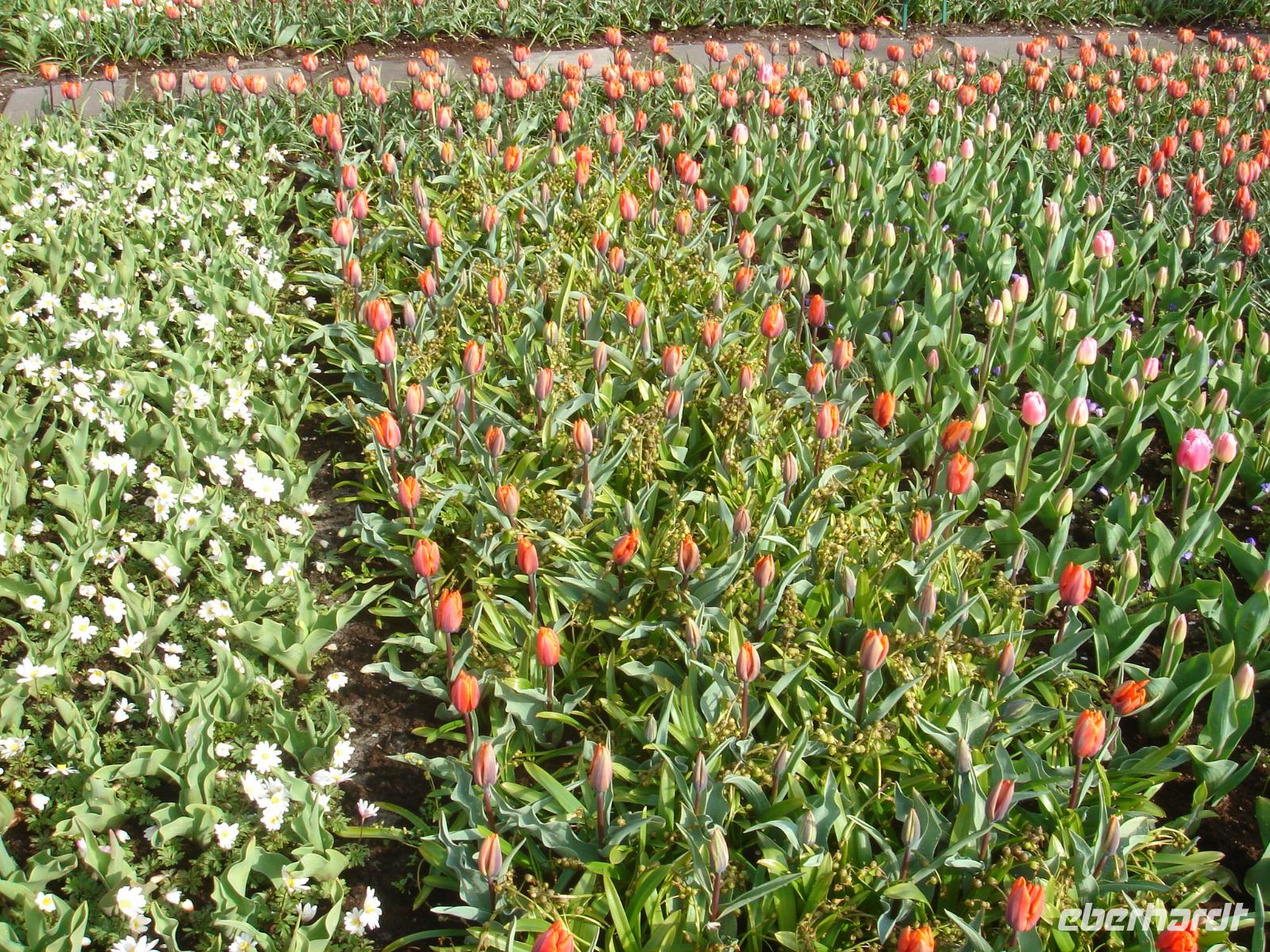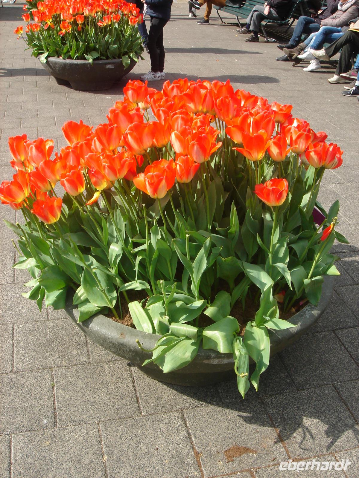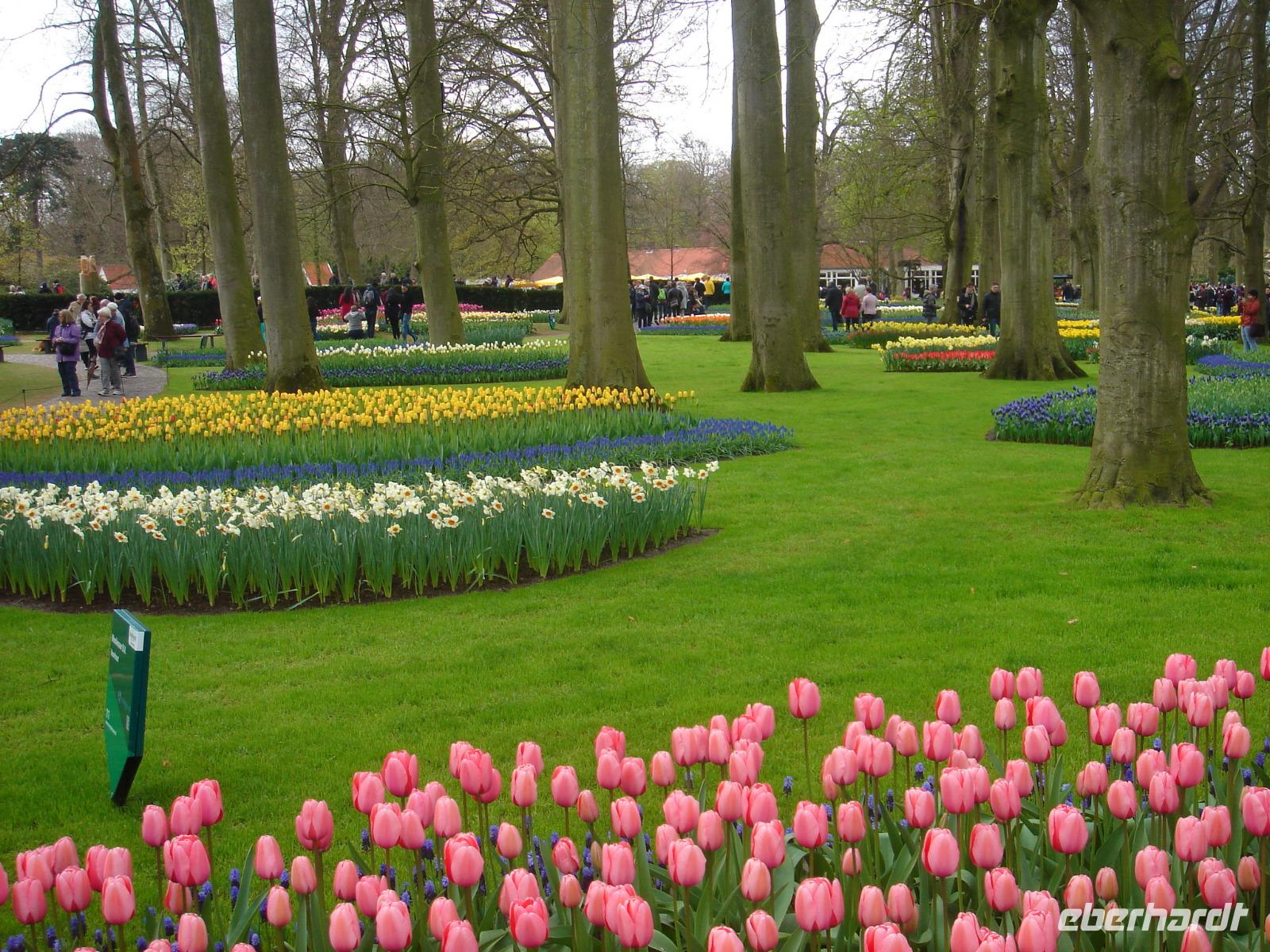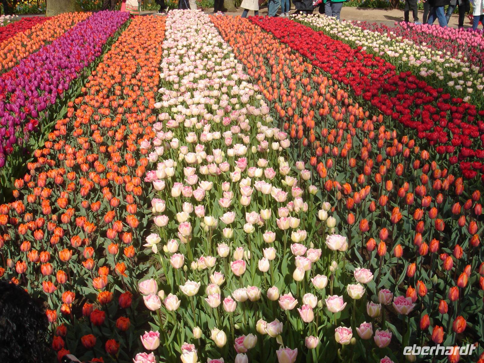 Einer der größten Flughäfen Europas ist Schiphol. Einst ein Schiffsloch, in dem so manches der stolzen niederländischen Ostindienschiffe versank, später trocken gelegt und nun ein wichtiges Drehkreuz in Europa. An diesem Flughafen fuhren wir am Morgen vorbei. Stefan berichtete uns, dass einige Firmen zur Tulpenblühzeit gar mit den Gärtnereibetrieben um den Flughafen herum Geschäfte machen und ihre Firmenlogos überdimensional groß auf den Feldern anpflanzen lassen. Startende und landende Passagiere des Flughafens Schiphol sehen diese Logos dann von Bord aus und vielleicht steigt so der eine oder andere Gewinn der beauftragenden Firmen. Dazu hörten wir das Lieg „Tulpen aus Amsterdam", gesungen von Wilma, und freuten uns bereits auf unseren Tulpenausflug auf den Keukenhof, den wir wenig später erreichten. Auf diesem Hof eine geführte Wanderung zu unternehmen, ist so gut wie unmöglich. So stattete uns Stefan mit Eintrittskarten, einigen Hinweisen und Gartenplänen aus und wir schauten uns selbst auf den kilometerlangen Wegen und in den Hallen nahebei um, nahmen die eine oder andere Idee zur Gartengestaltung mit nach Hause und wunderten uns schon sehr, wie auch bei diesem nicht so recht einschätzbaren Wetter die Tulpen hervorragend blühen konnten. Rund 4,5 Millionen Tulpen hätten wir sehen können, wenn wir jeden Winkel des Hofes besichtigten. Es war einfach herrlich. Zwischendurch nahmen wir hier oder da an den vielen Ständen oder gastronomischen Einrichtungen einen kleinen Imbiss ein und waren dann nach dem Mittag wieder pünktlich am Bus. Wenige Meter vom Keukenhof entfernt fuhren wir noch zu einem Tulpenzwiebelmarkt und nahmen einige hoffentlich bald blühende Zwiebeln mit nach Hause, ehe es weiter gen Scheveningen ging. Früher war dieser Ort ein kleines Dorf, heute ist er ein wichtiger Badeort und wurde nach Den Haag eingemeindet. Neben der Uferpromenade mit dem herrlichen Kurhaus und dem einladenden Pier befindet sich hier auch ein großes Casino sowie das UN-Gefängnis. Wir hofften, dass beides nichts miteinander zu tun hatte und genossen die Zeit auf der Promenade bei frischem Fisch oder einfach nur etwas Ruhe am Sandstrand mit Möwen und kleinen Bars. Später ging es wieder zurück zum Bus und nach einem etwas unser Inneres erwärmenden Kaffee aus der Bordküche fuhren wir zurück zu unserem Hotel in Amersfoord, wo der lange und ereignisreiche Tag später am Abend ausklang.