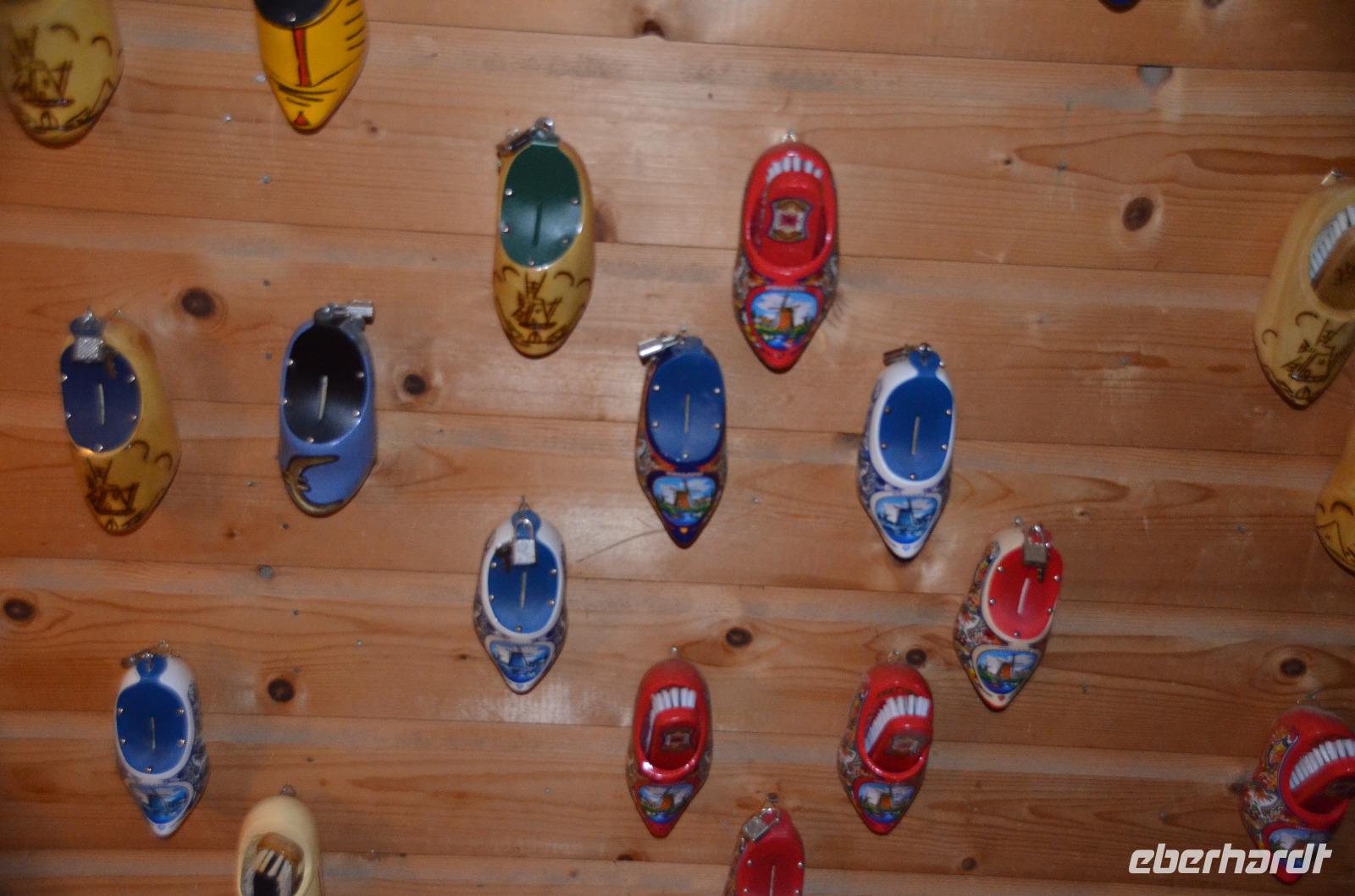 Er führt uns durch die Käserei, zeigt uns die Herstellung und lässt uns kosten. Anschließend wird die Holzschuhmacherei erklärt und vorgeführt. Die anschließende Einkaufsmöglichkeit nutzen wir natürlich auch gern. Draußen geht ein Platzregen nieder.