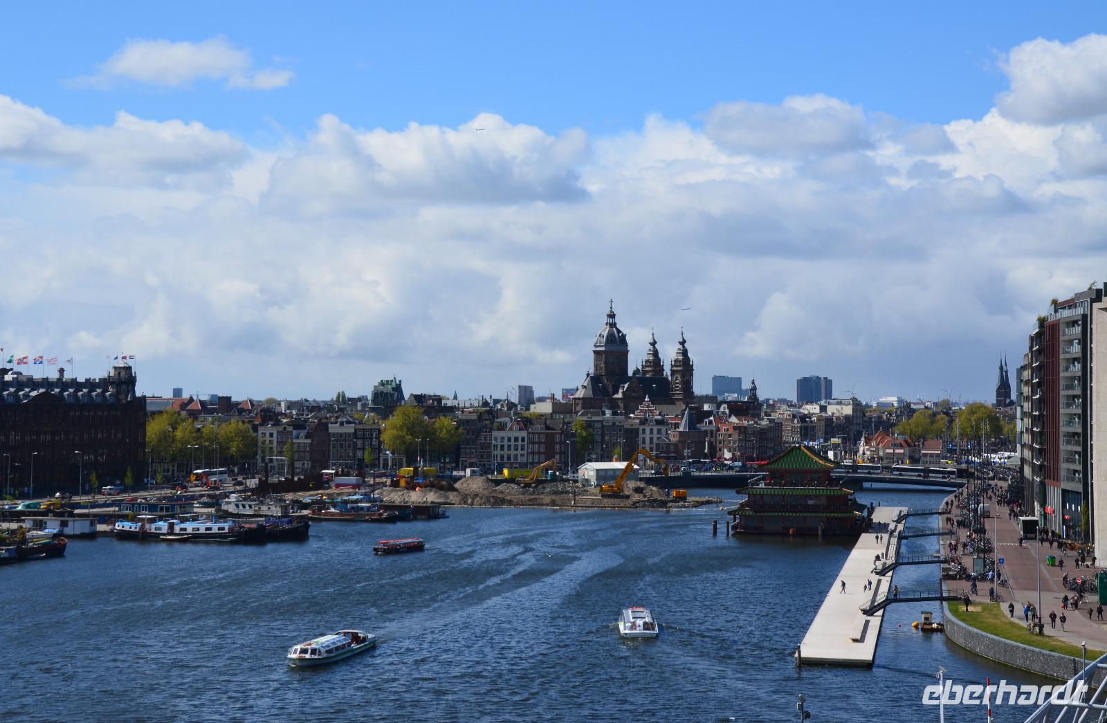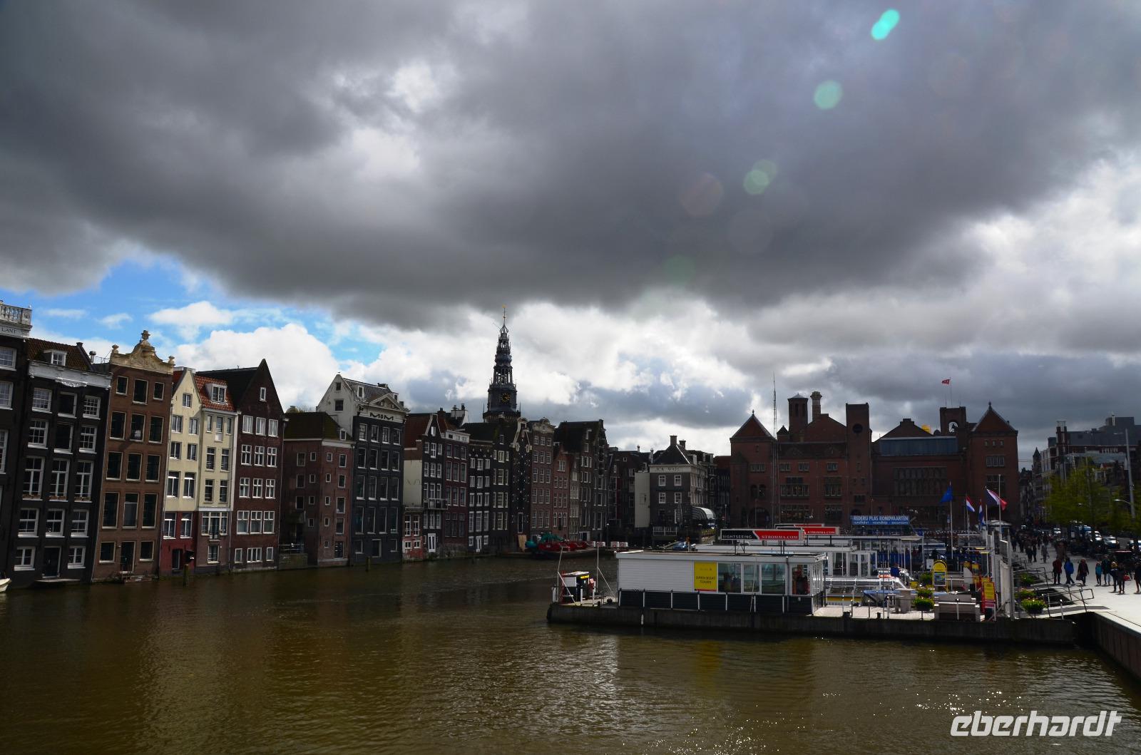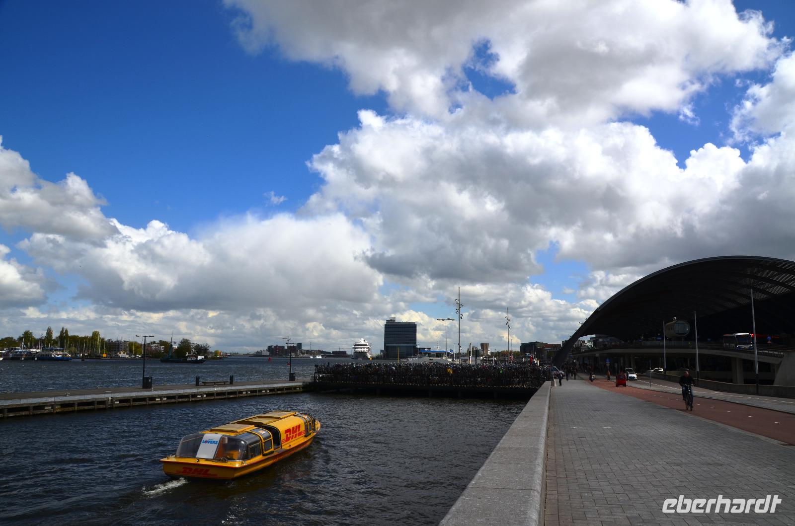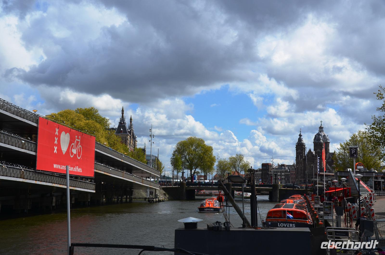 Später, in Amsterdam scheint wieder die Sonne. Am Ausstieg vor der St. Nikolas Kirche an der Prins Hendrikkade; sind wir direkt im Zentrum der Großstadt. Die prunkvolle Südfassade des Bahnhofsgebäudes strahlt zu uns herüber. Von hier ist es nur ein kurzer Weg auf der Fußgängerzone entlang des Hauptbahnhofs zum westlichen Hafenbecken mit den Schiffsanlegern der Lofers-Grachtenfahrten.