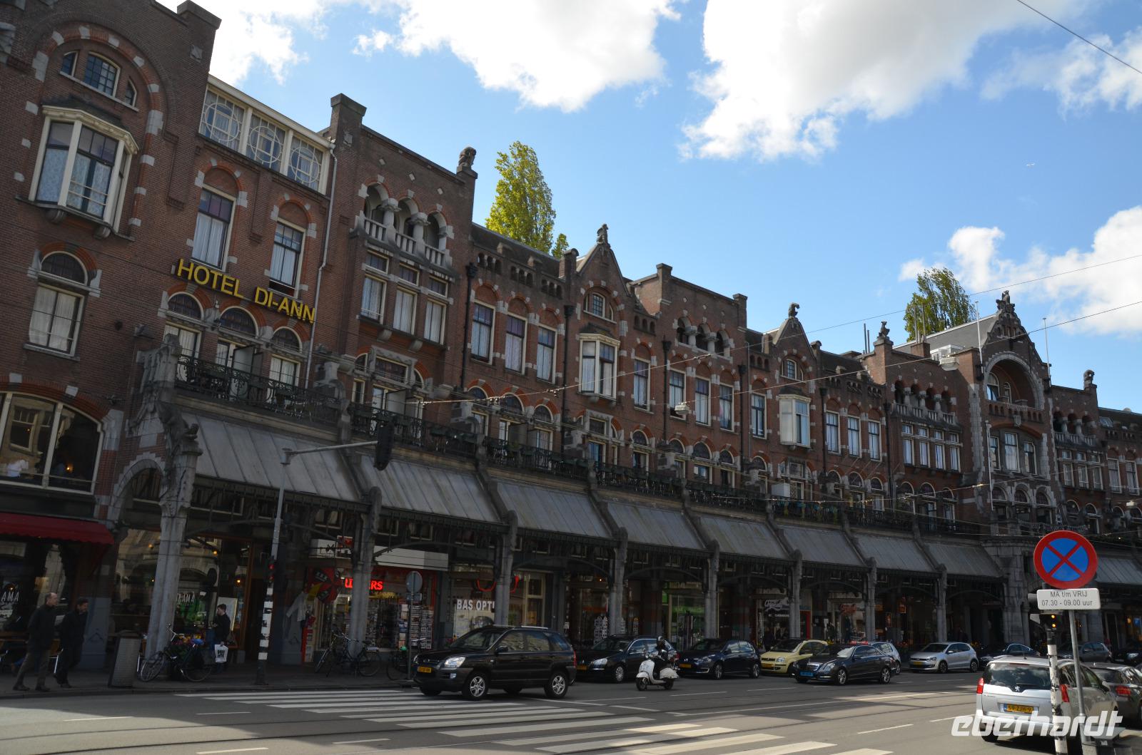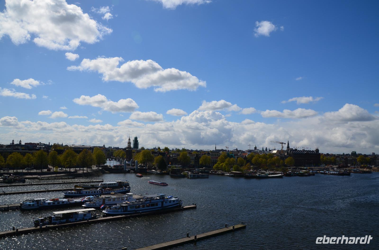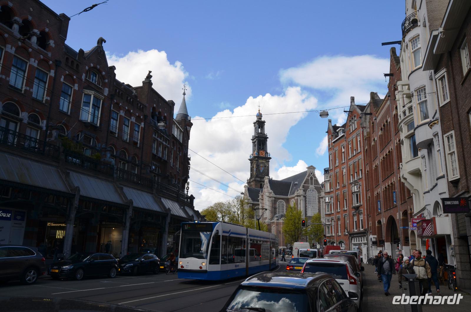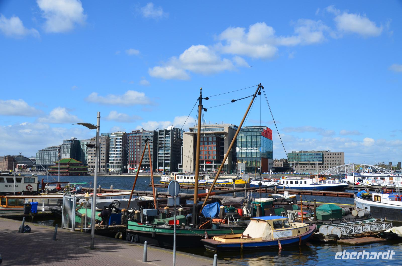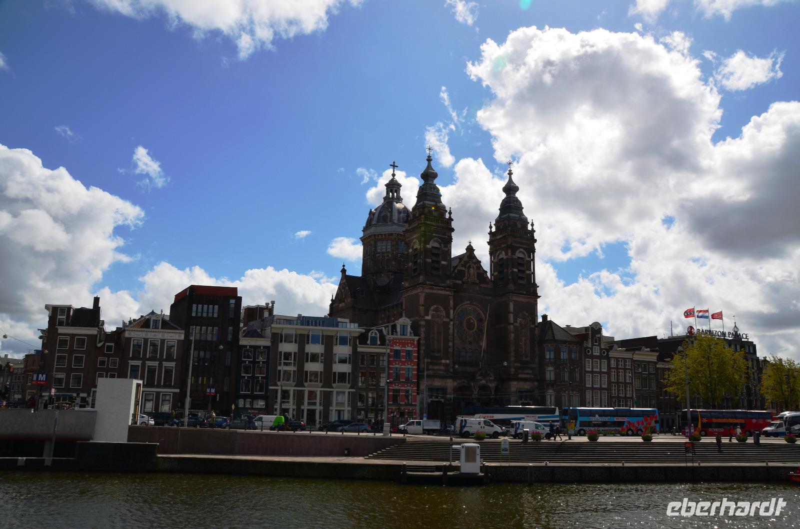 Später, in Amsterdam scheint wieder die Sonne. Am Ausstieg vor der St. Nikolas Kirche an der Prins Hendrikkade; sind wir direkt im Zentrum der Großstadt. Die prunkvolle Südfassade des Bahnhofsgebäudes strahlt zu uns herüber. Von hier ist es nur ein kurzer Weg auf der Fußgängerzone entlang des Hauptbahnhofs zum westlichen Hafenbecken mit den Schiffsanlegern der Lofers-Grachtenfahrten.