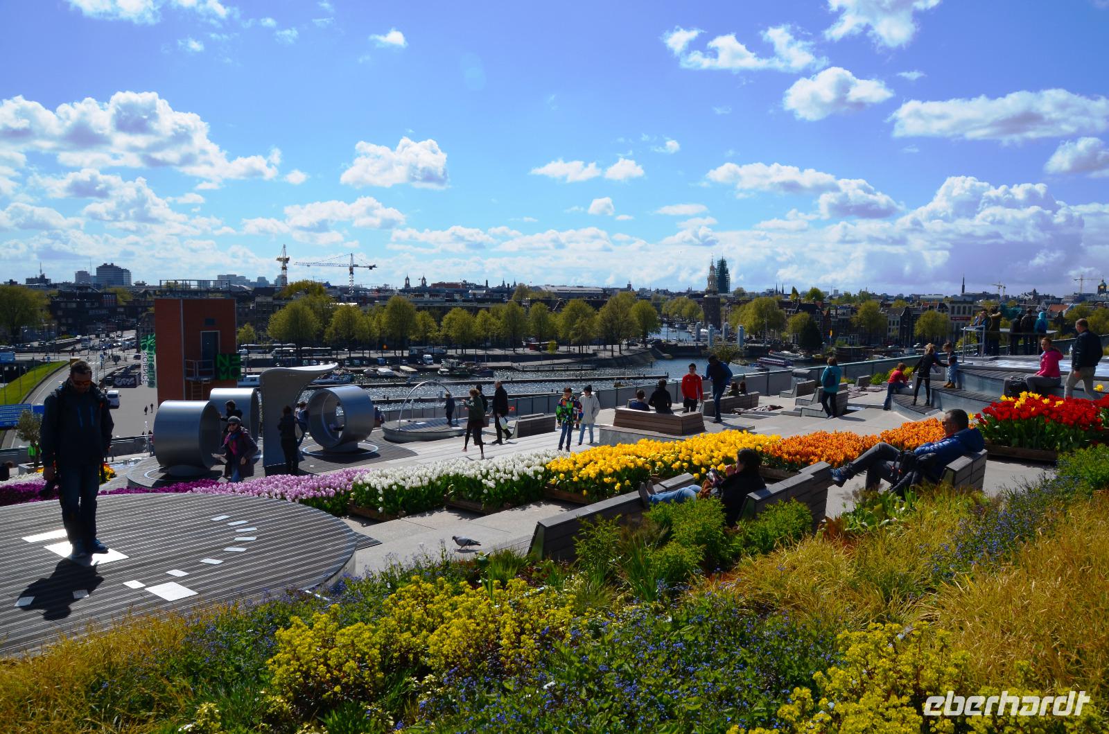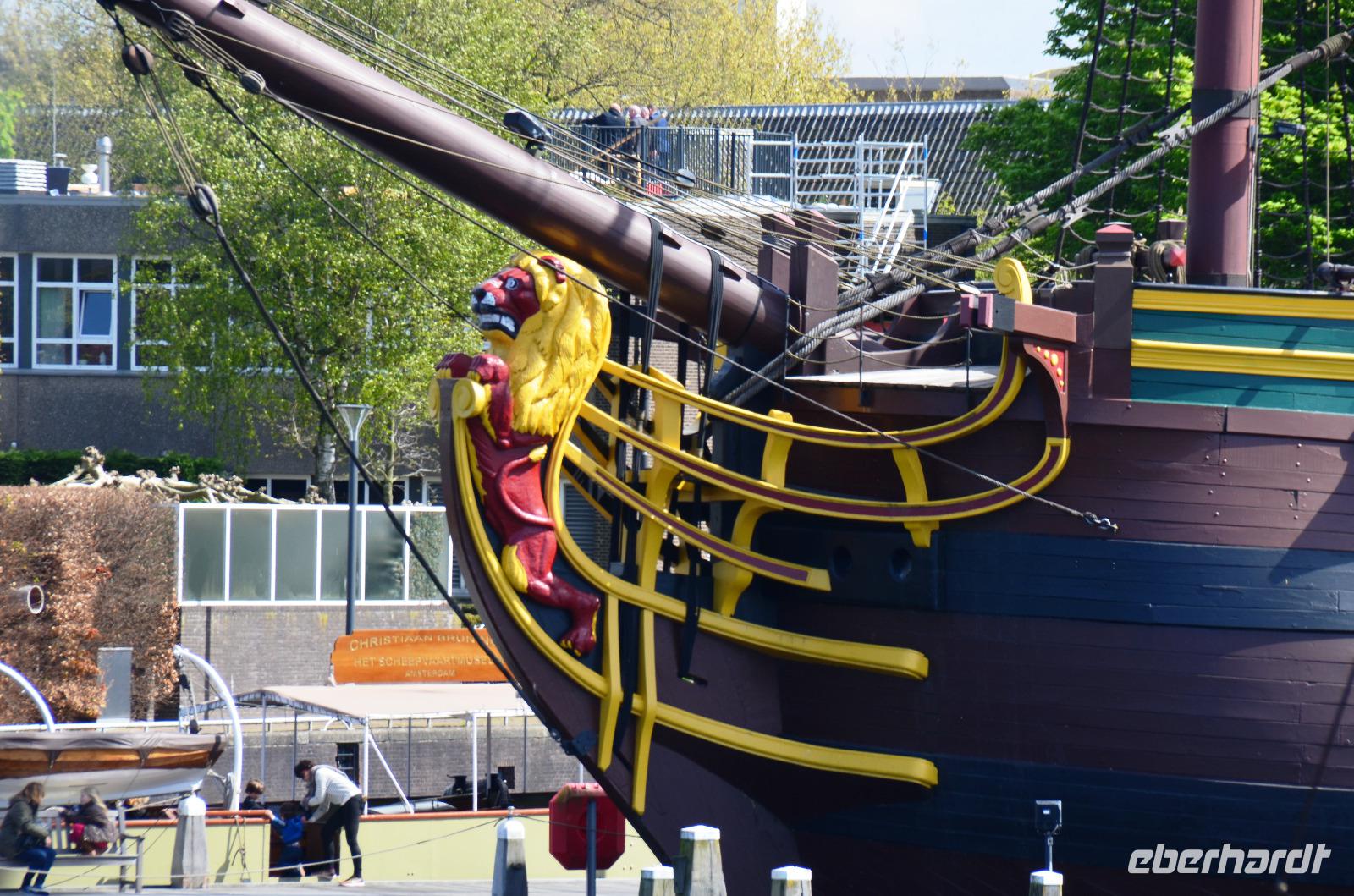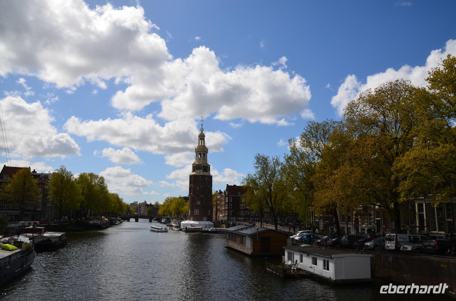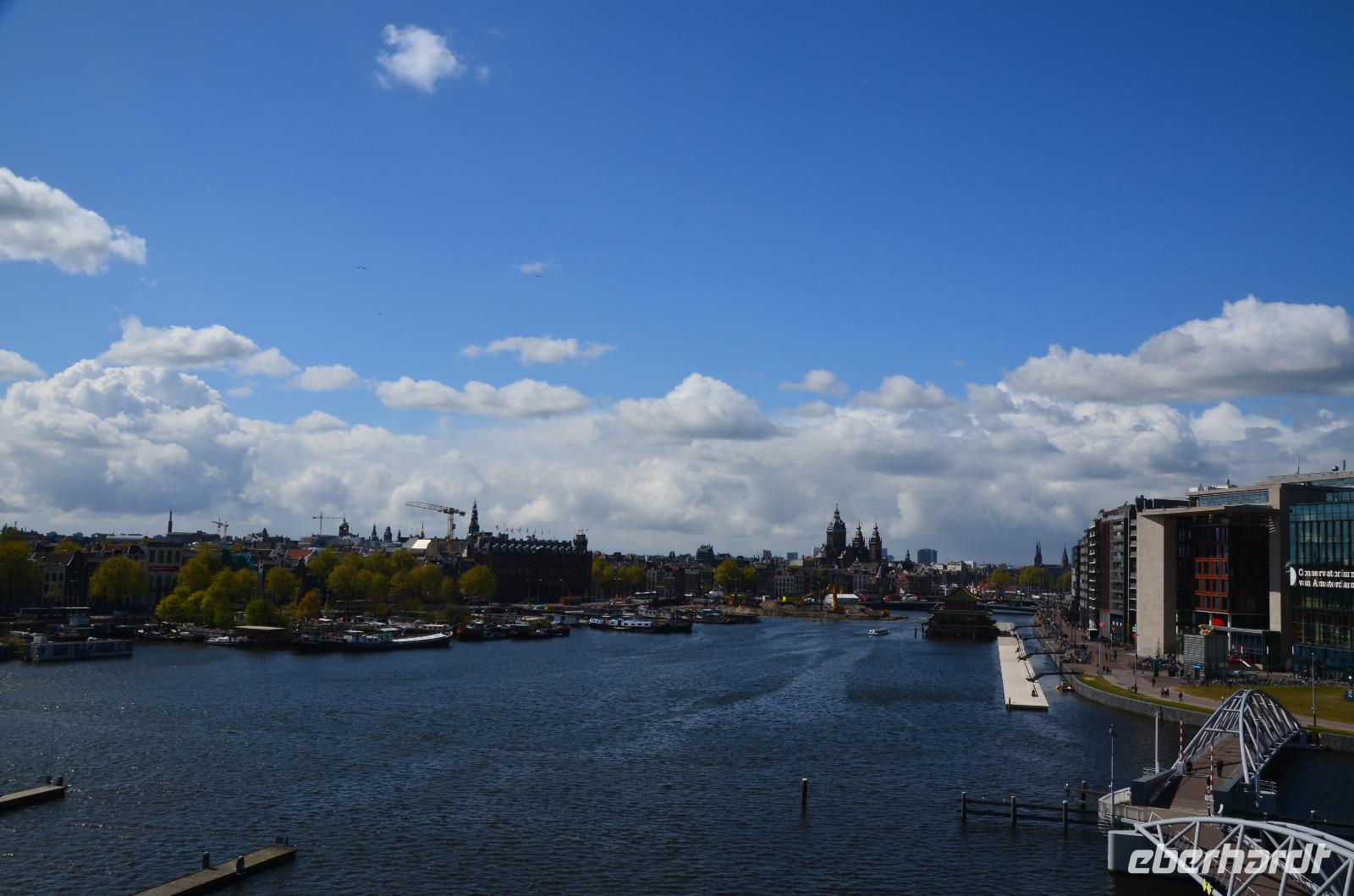 Später, in Amsterdam scheint wieder die Sonne. Am Ausstieg vor der St. Nikolas Kirche an der Prins Hendrikkade; sind wir direkt im Zentrum der Großstadt. Die prunkvolle Südfassade des Bahnhofsgebäudes strahlt zu uns herüber. Von hier ist es nur ein kurzer Weg auf der Fußgängerzone entlang des Hauptbahnhofs zum westlichen Hafenbecken mit den Schiffsanlegern der Lofers-Grachtenfahrten.