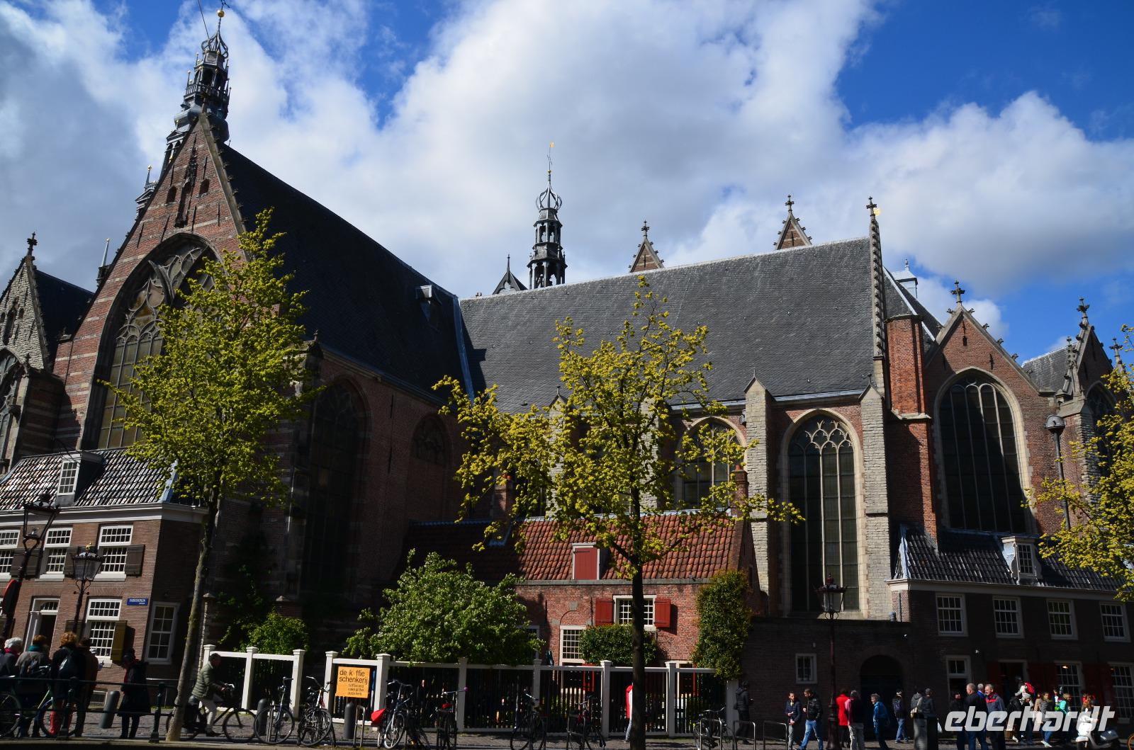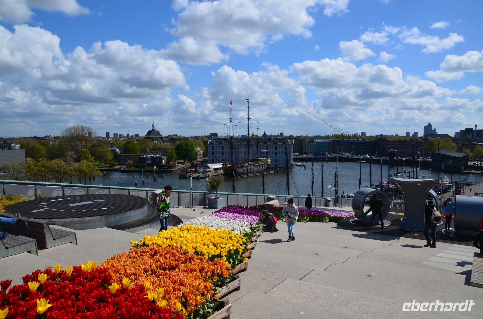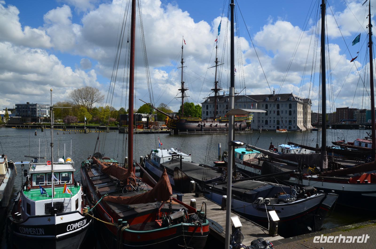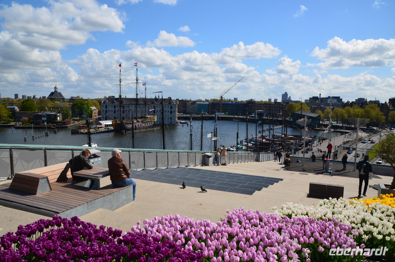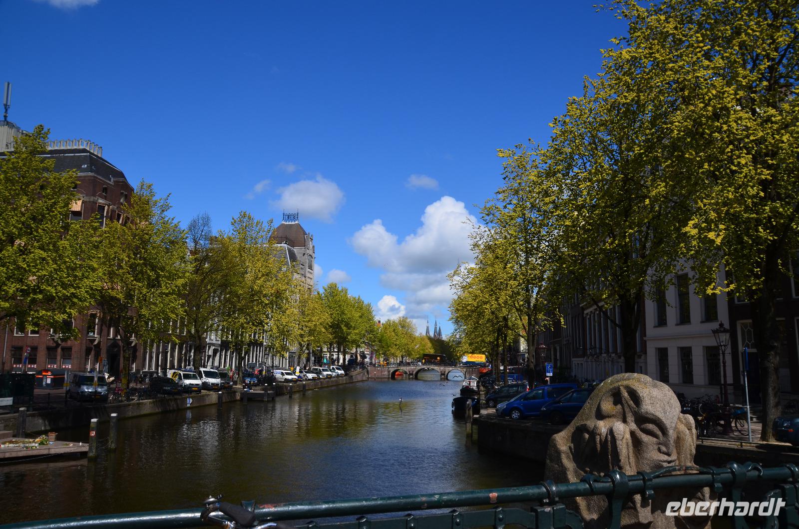 Später, in Amsterdam scheint wieder die Sonne. Am Ausstieg vor der St. Nikolas Kirche an der Prins Hendrikkade; sind wir direkt im Zentrum der Großstadt. Die prunkvolle Südfassade des Bahnhofsgebäudes strahlt zu uns herüber. Von hier ist es nur ein kurzer Weg auf der Fußgängerzone entlang des Hauptbahnhofs zum westlichen Hafenbecken mit den Schiffsanlegern der Lofers-Grachtenfahrten.