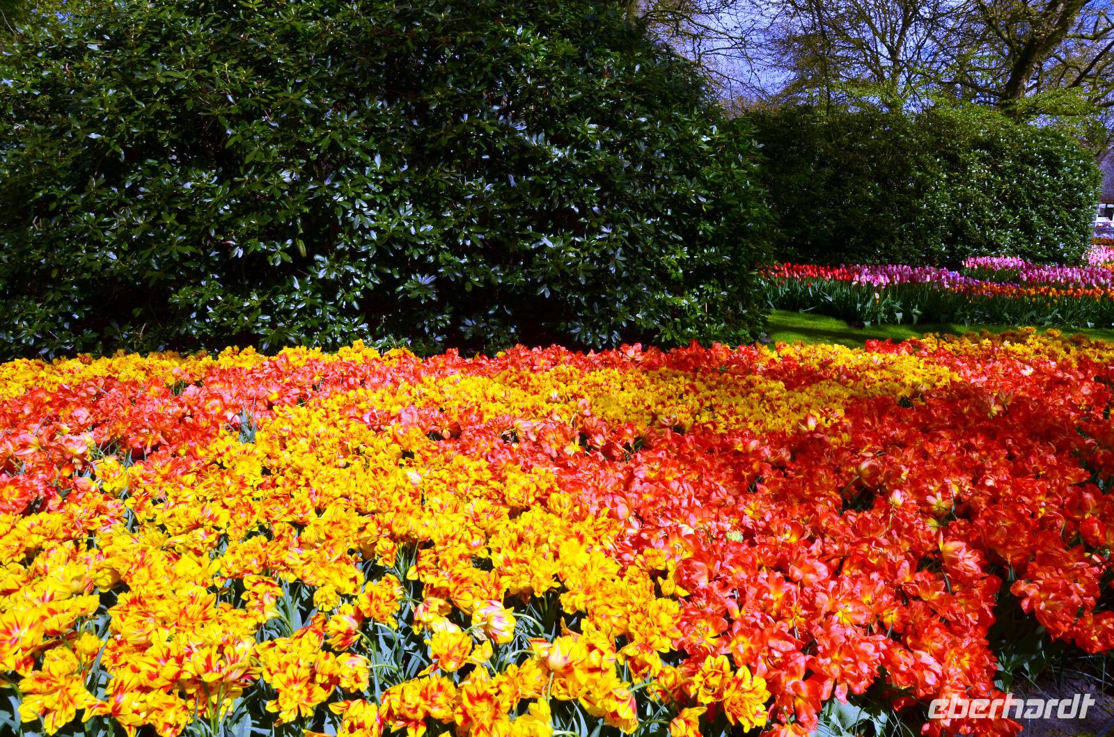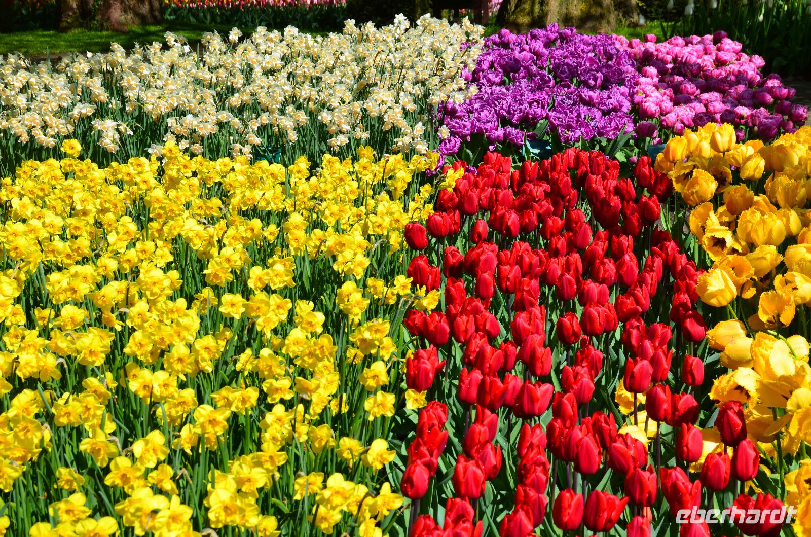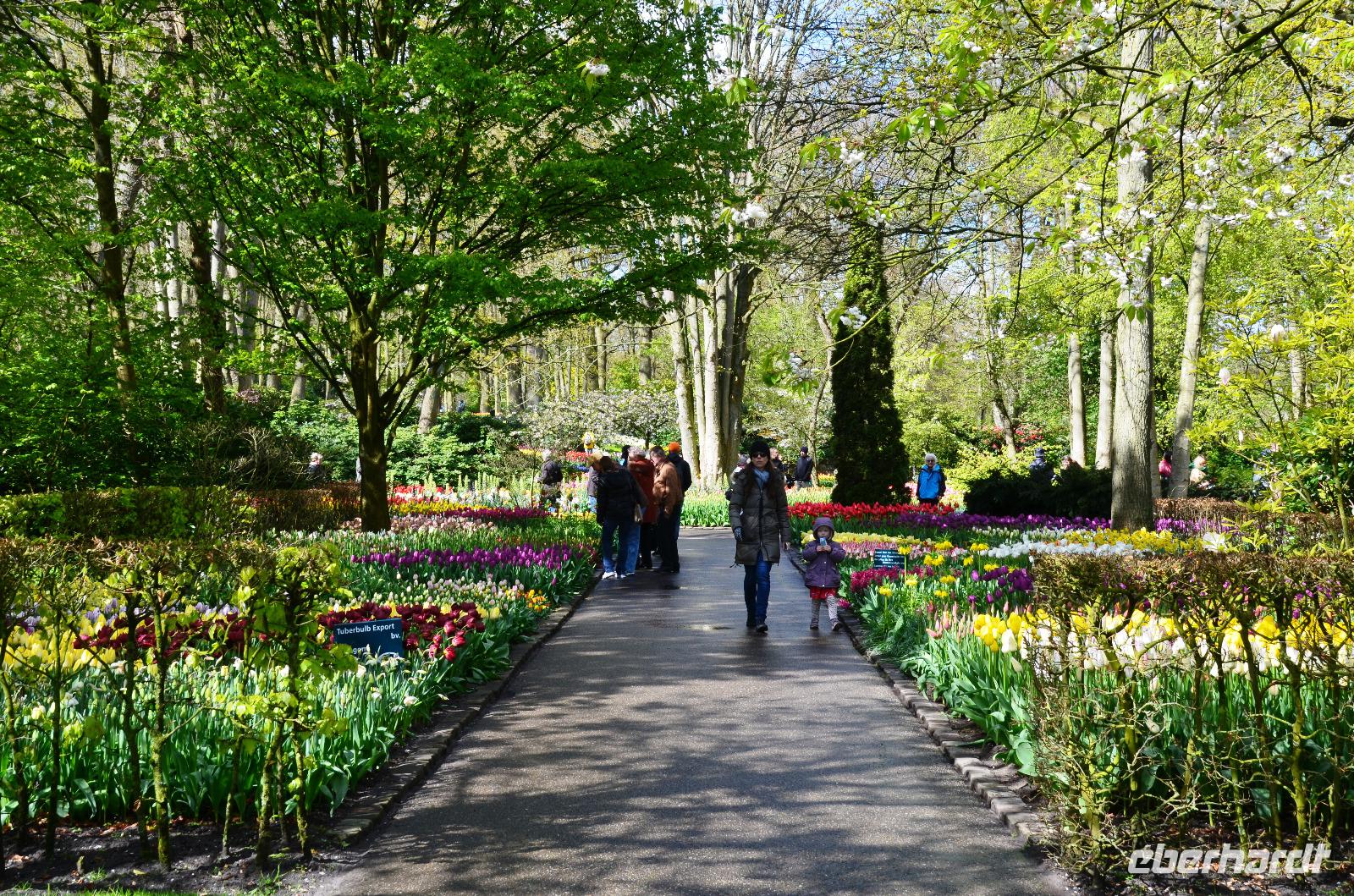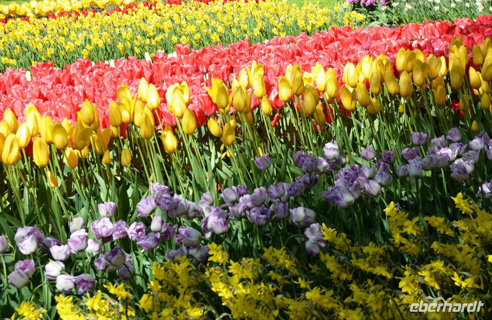 Ab 07:00 Uhr frühstücken wir und fahren dann erneut nach Westen, hinein nach Holland, um Amsterdam herum, vorbei am Flughafen nach Lisse, zum Keukenhof, Hollands berühmtesten Blumengarten. Am Keukenhof ist alles bestens organisiert. Wir werden zum Busparkplatz eingewiesen, erhalten schnell unsere Tickets, dazu Übersichtspläne und schon kann die Besichtigung beginnen, natürlich individuell, damit jeder seinen Interessen folgen kann.
