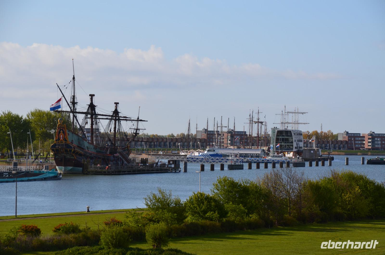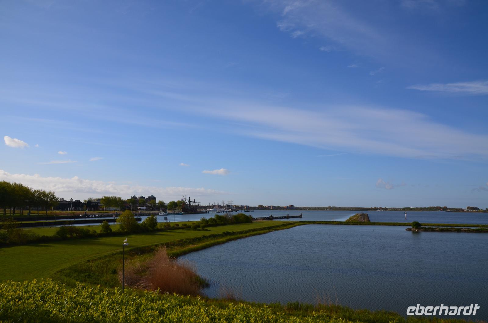Nach leckerem Frühstück geht es nach Lelystad, das nach dem berühmten Deichbauer Lely benannt ist. Über den Houtribdijk geht es Richtung Hoorn in Westfriesland. Nach den Schleusen von Batavia Stad machen wir einen Fotostopp. Von hier kann man die 120 m lange Schleusenanlage und die gewaltige Deichanlage gut sehen.