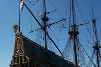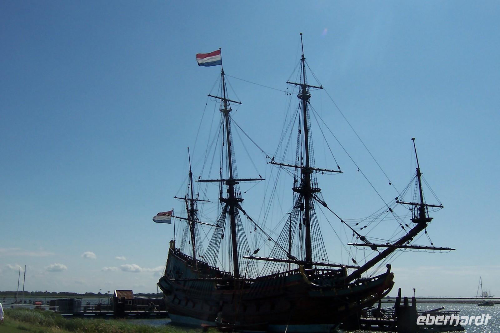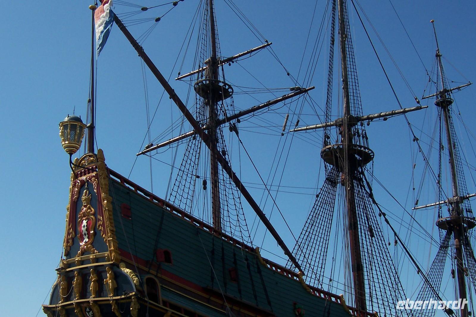 Bevor es zu einem kurzen Halt an der Bataviawerft geht. Fotografiert wird das rekonstruierte historische Schiff Batavia von 1628, das einst bis Australien fuhr und vor der westaustralischen Küste sank.