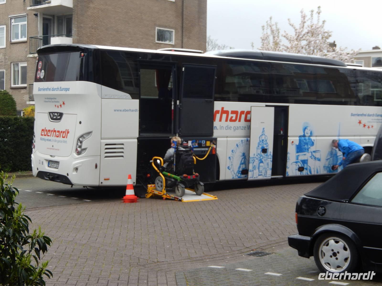 Pünktlich halb sechs am frühen Morgen steuert uns Bus-Chauffeur Jens den behindertengerechten 4- Sterne-Reisebus der Firma Satra Eberhardt zum Flughafen Dresden, dem Startort fast aller Eberhardt-Reisen. Hier steigen fünf Gäste zu, die entweder den Sparzustieg nutzen oder den Haustür-Transfer-Service, den Eberhardt bei seinen barrierefreien Reisen mit inkludiert hat. Nachdem alles Gepäck verladen und alle Rollstühle verstaut sind, treten wir überpünktlich unsere Reise an, die uns in unser Nachbarland Niederlande führen soll. An unserem nächsten Zustieg in Chemnitz steigt dann auch unseren Reiseleiter Jörg Nesse sowie weitere Gäste auf den Bus. Am Hersmdorfer Kreuz begrüßen wir dann unseren zweiten Rollibusfahrer, Steffen, welcher uns auf dem Rest der Tour fahren wird. Nach einem weiteren Zustieg ist die Gruppe bestehend aus 17 Reisegästen komplett. Über die A2