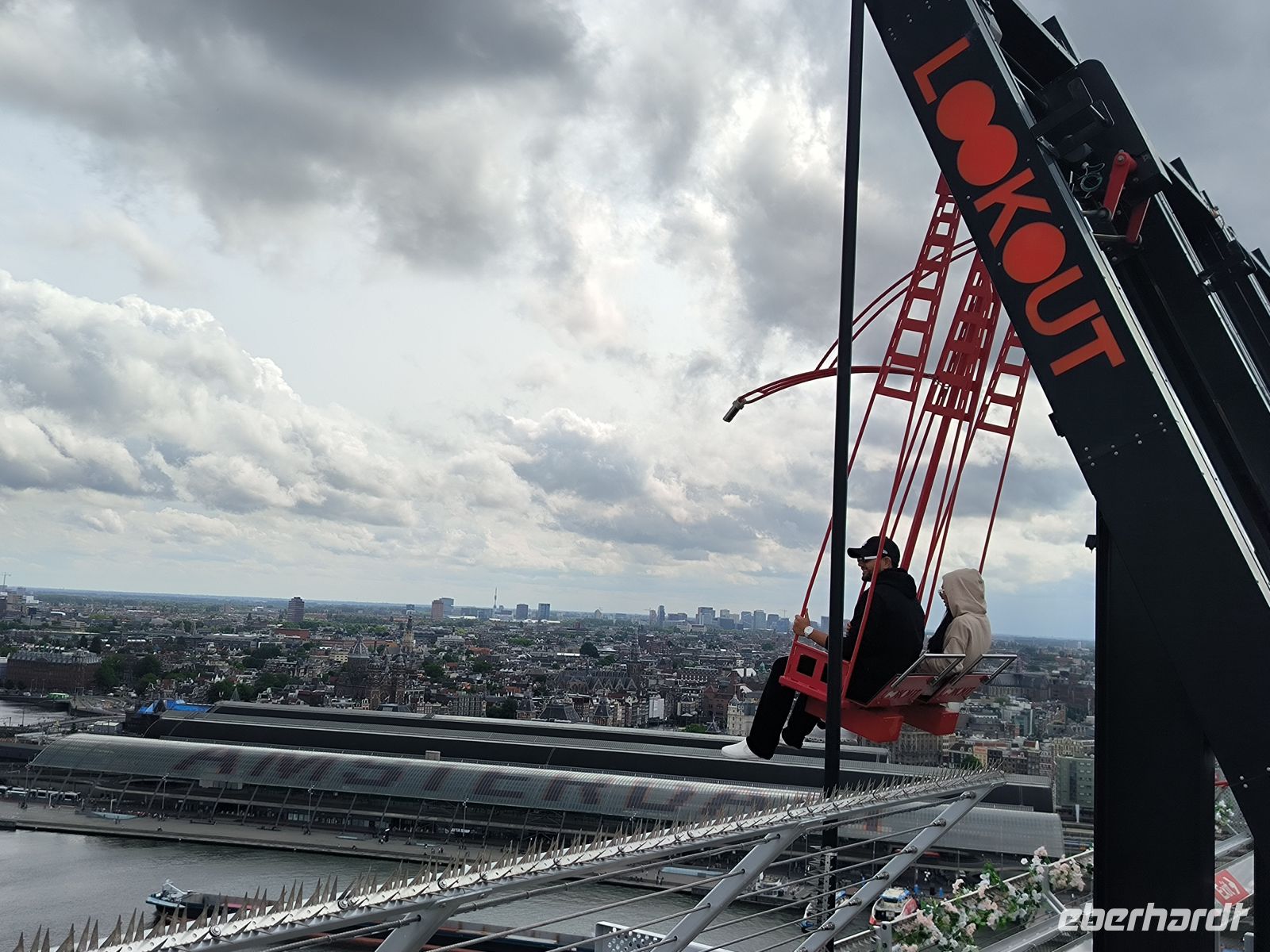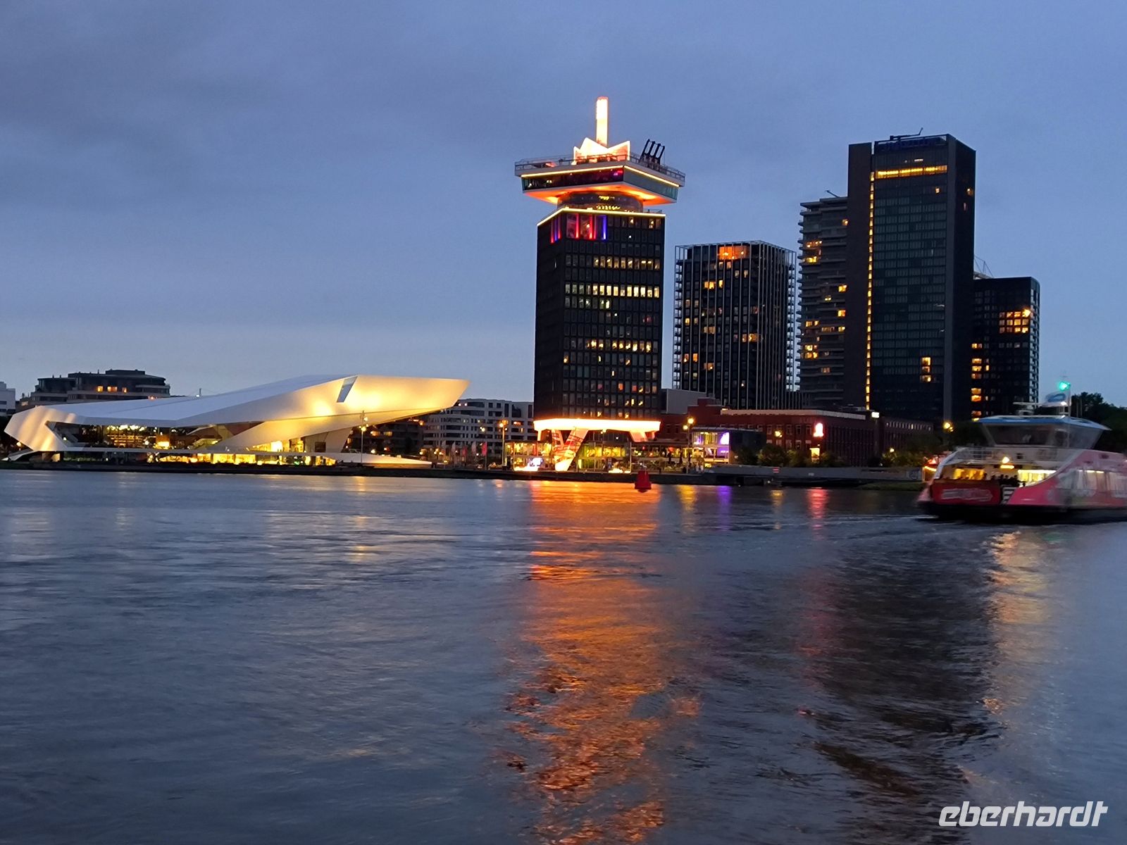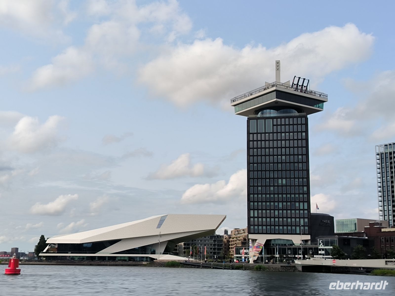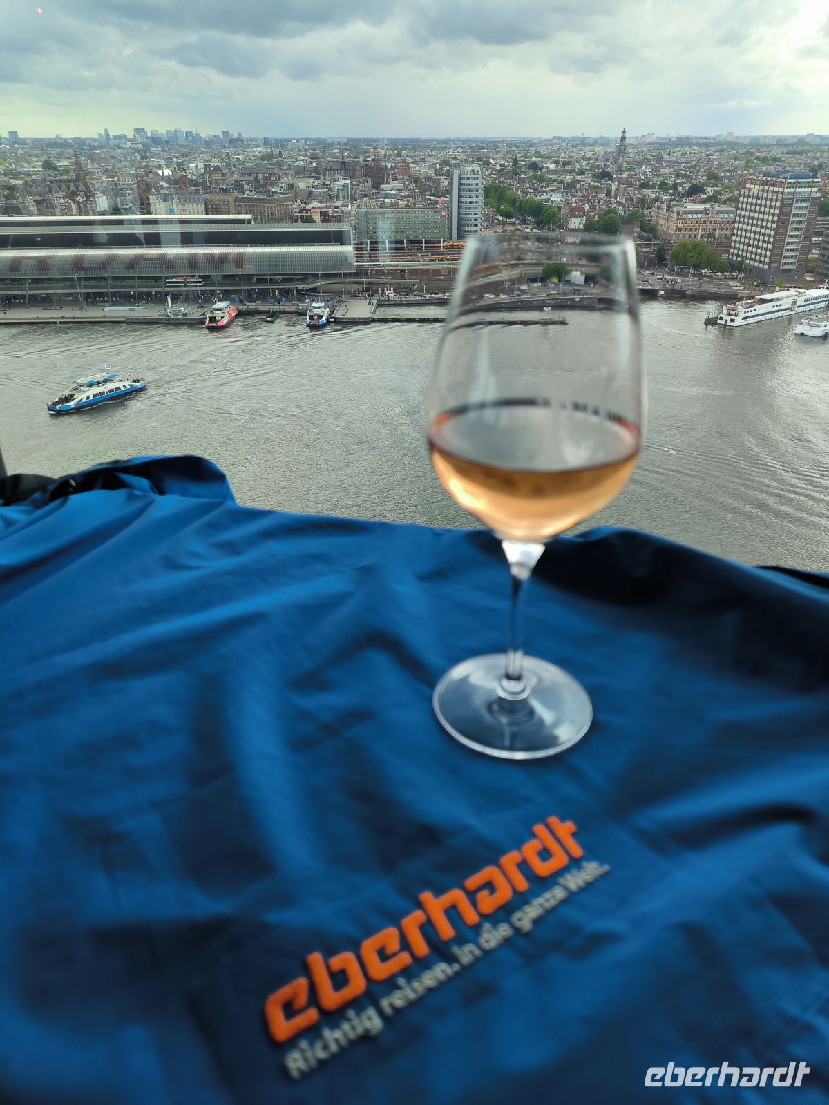 Wir folgen dem Vorschlag von Reiseleiterin Heike, an diesem Nachmittag zunächst Amsterdam von oben zu entdecken. Mit der Straßenbahn Linie 26 geht es zum Hauptbahnhof. Dort können wir mit der kostenfreien Fähre übersetzen. Schon von weitem sehen wir unser Ziel, den „A’dam Tower“, der neben dem futuristischen Eye-Filmmuseum steht. Der Fahrstuhl bringt uns in nur 20 Sekunden nach oben und wir haben einen phantastischen Ausblick über die Stadt. Das Wasser, die Centraal Station, der Königspalast und sogar die Wolken sind nur noch Deko am Himmel. Der richtige Ort also, um ein erstes Getränk – unser Welcome-Drink – zu genießen.