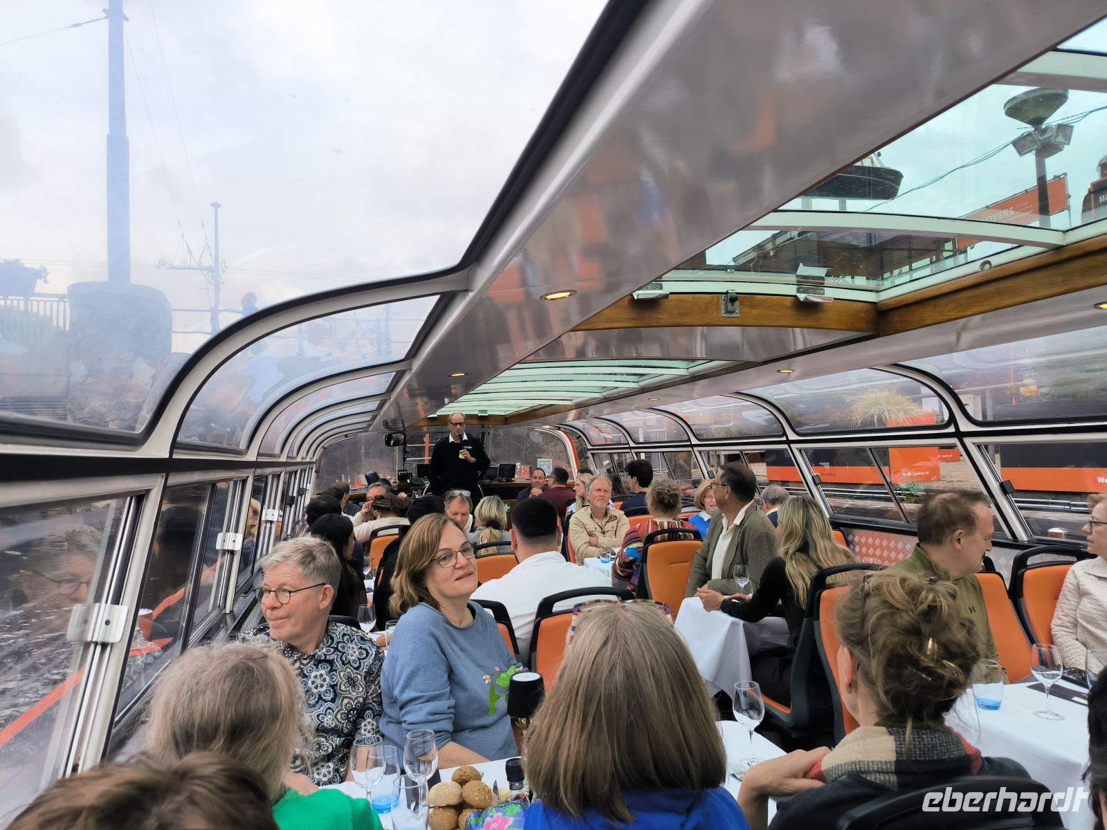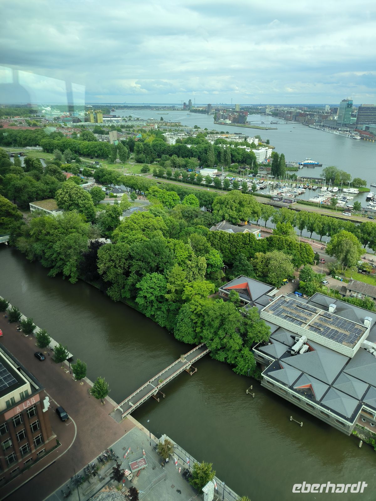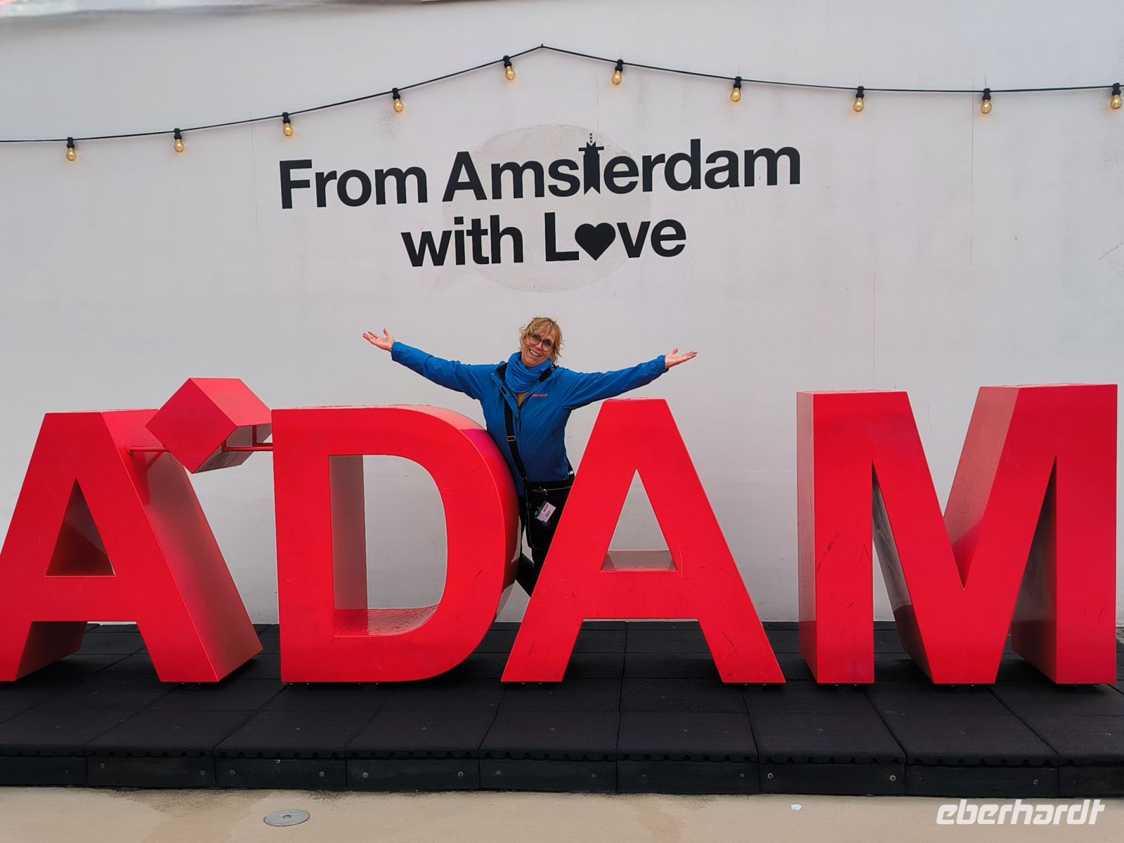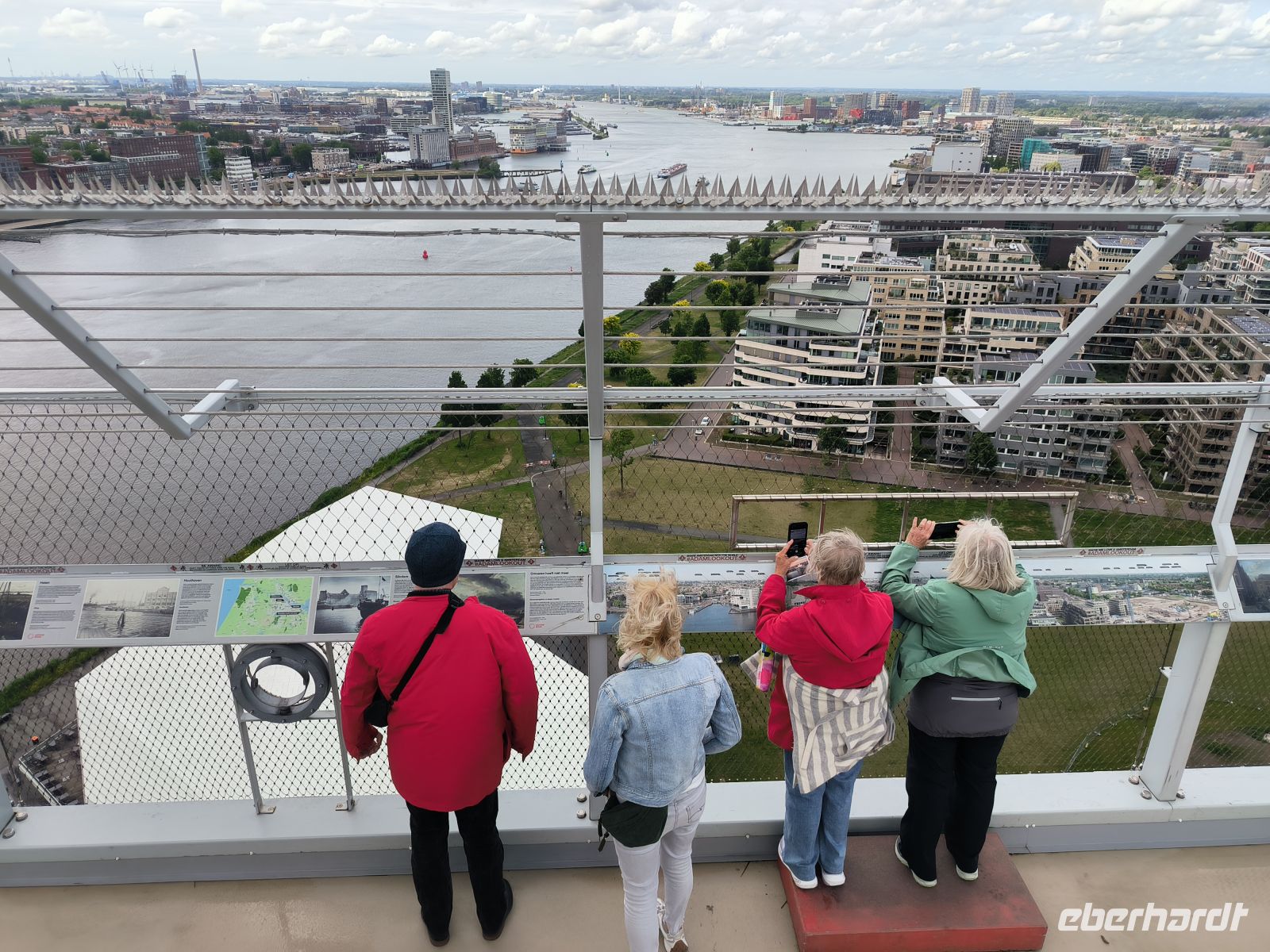 Wir folgen dem Vorschlag von Reiseleiterin Heike, an diesem Nachmittag zunächst Amsterdam von oben zu entdecken. Mit der Straßenbahn Linie 26 geht es zum Hauptbahnhof. Dort können wir mit der kostenfreien Fähre übersetzen. Schon von weitem sehen wir unser Ziel, den „A’dam Tower“, der neben dem futuristischen Eye-Filmmuseum steht. Der Fahrstuhl bringt uns in nur 20 Sekunden nach oben und wir haben einen phantastischen Ausblick über die Stadt. Das Wasser, die Centraal Station, der Königspalast und sogar die Wolken sind nur noch Deko am Himmel. Der richtige Ort also, um ein erstes Getränk – unser Welcome-Drink – zu genießen.
