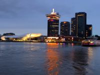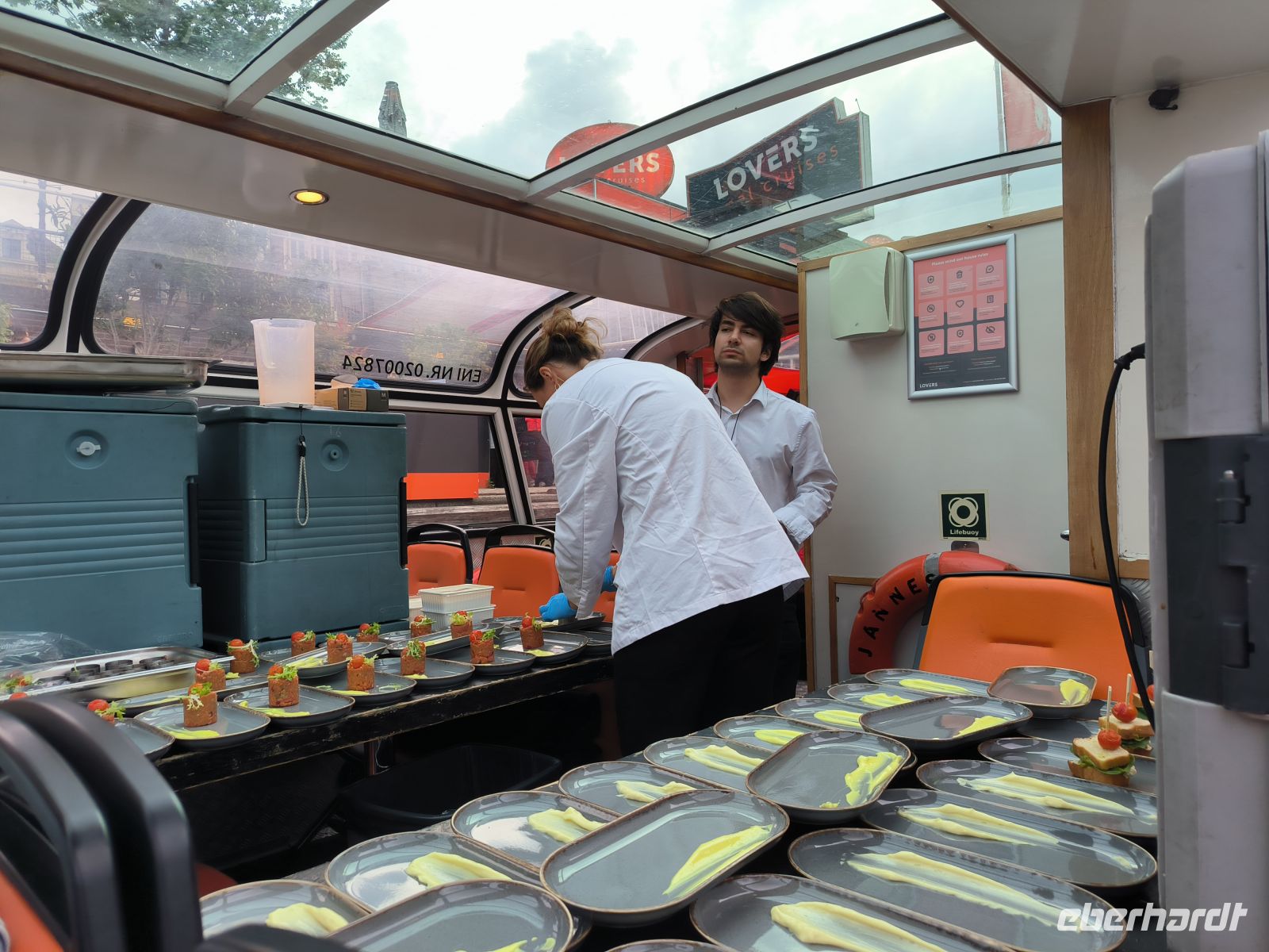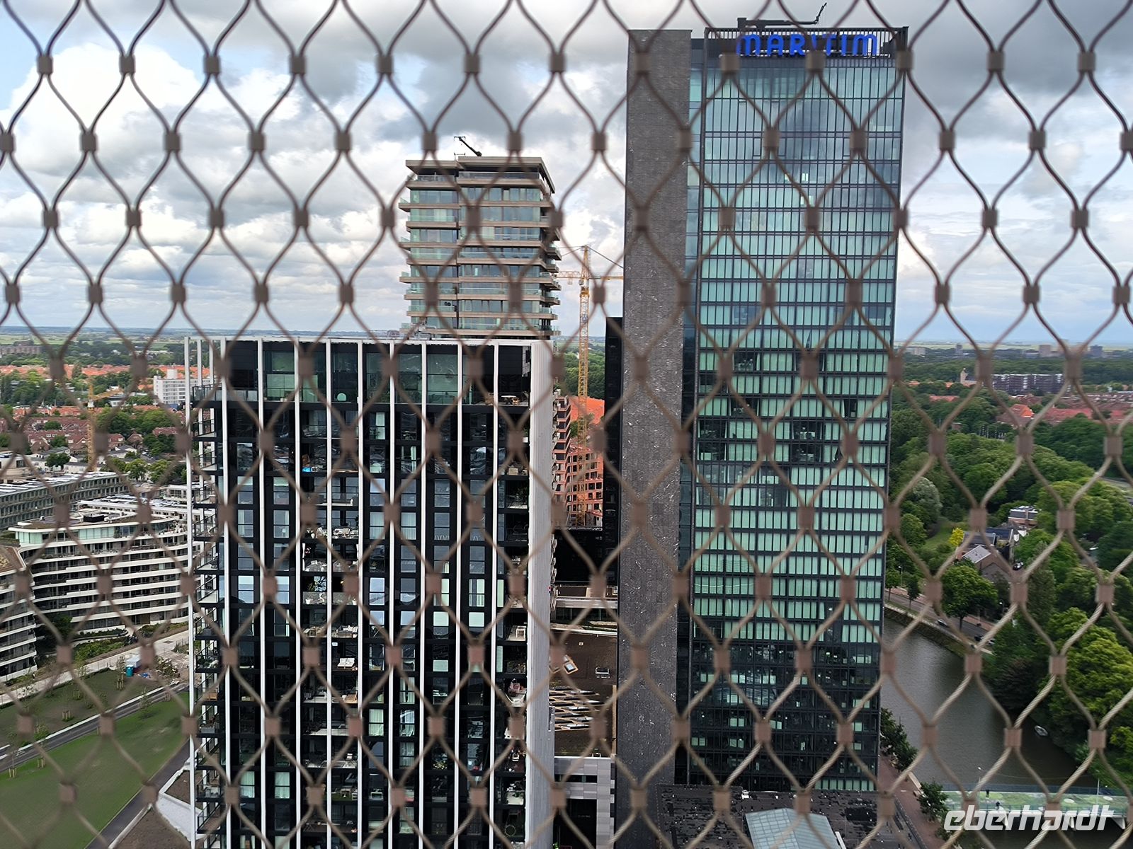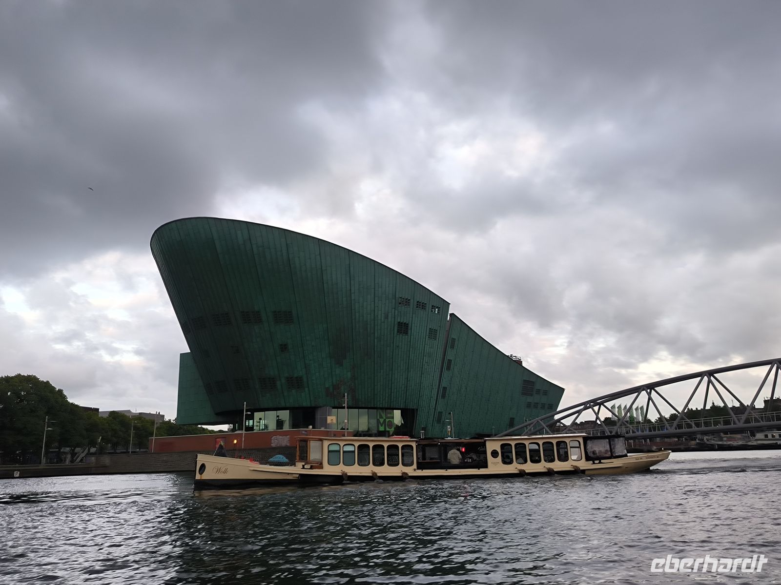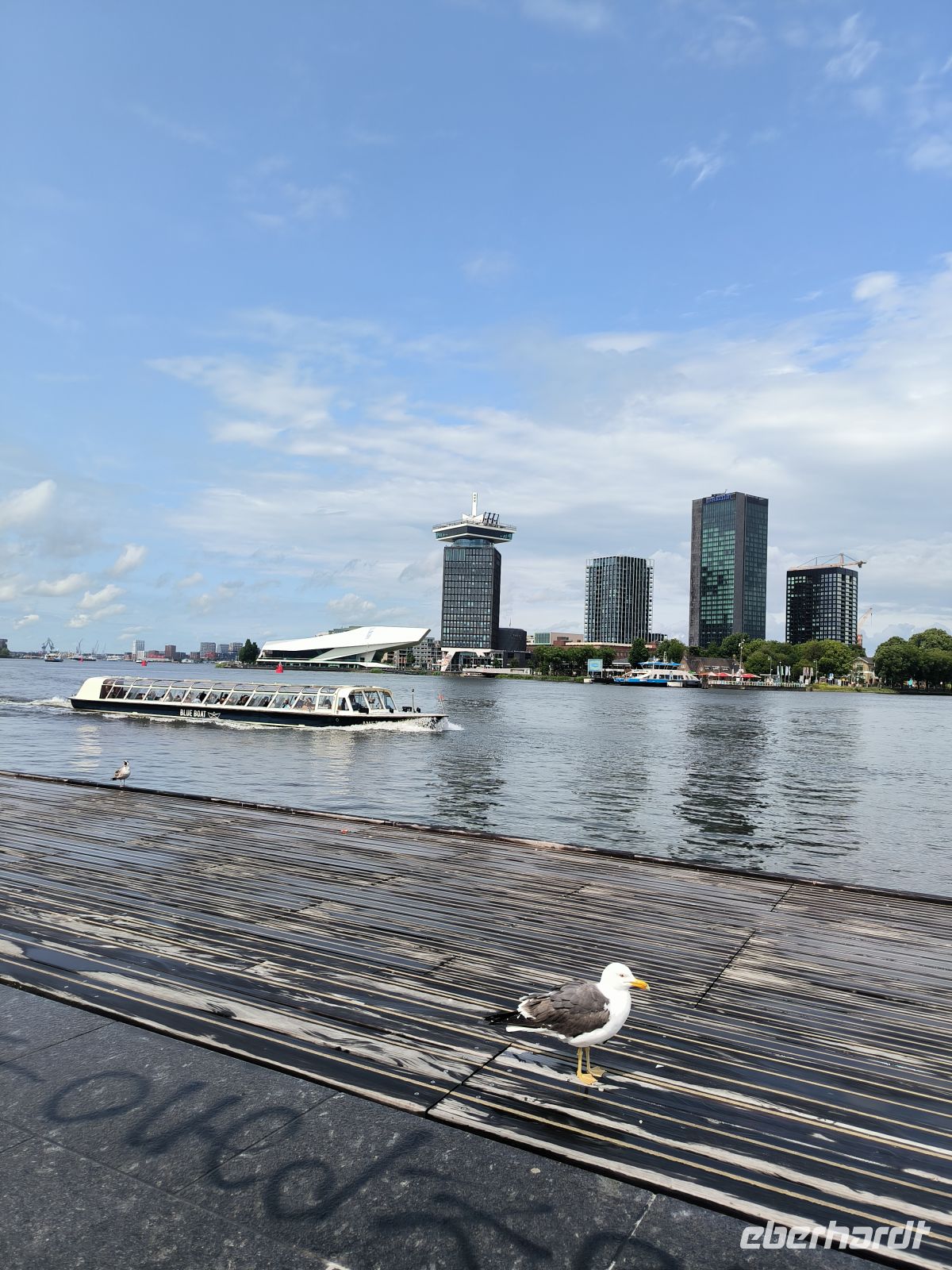 Wir folgen dem Vorschlag von Reiseleiterin Heike, an diesem Nachmittag zunächst Amsterdam von oben zu entdecken. Mit der Straßenbahn Linie 26 geht es zum Hauptbahnhof. Dort können wir mit der kostenfreien Fähre übersetzen. Schon von weitem sehen wir unser Ziel, den „A’dam Tower“, der neben dem futuristischen Eye-Filmmuseum steht. Der Fahrstuhl bringt uns in nur 20 Sekunden nach oben und wir haben einen phantastischen Ausblick über die Stadt. Das Wasser, die Centraal Station, der Königspalast und sogar die Wolken sind nur noch Deko am Himmel. Der richtige Ort also, um ein erstes Getränk – unser Welcome-Drink – zu genießen.