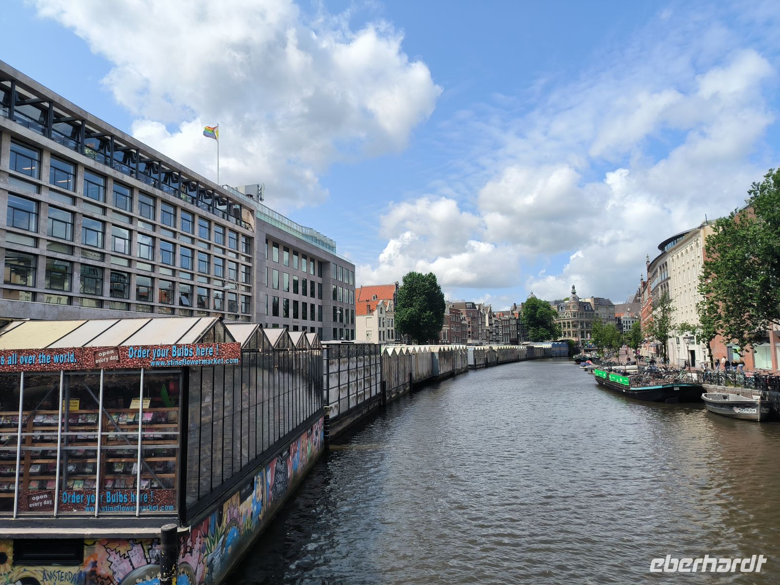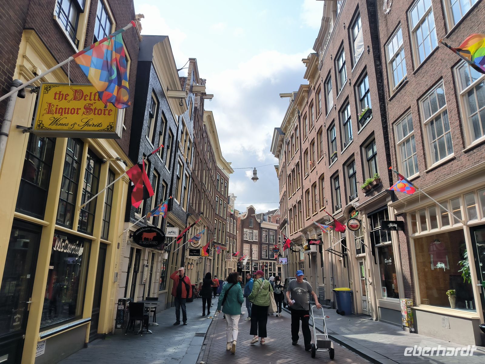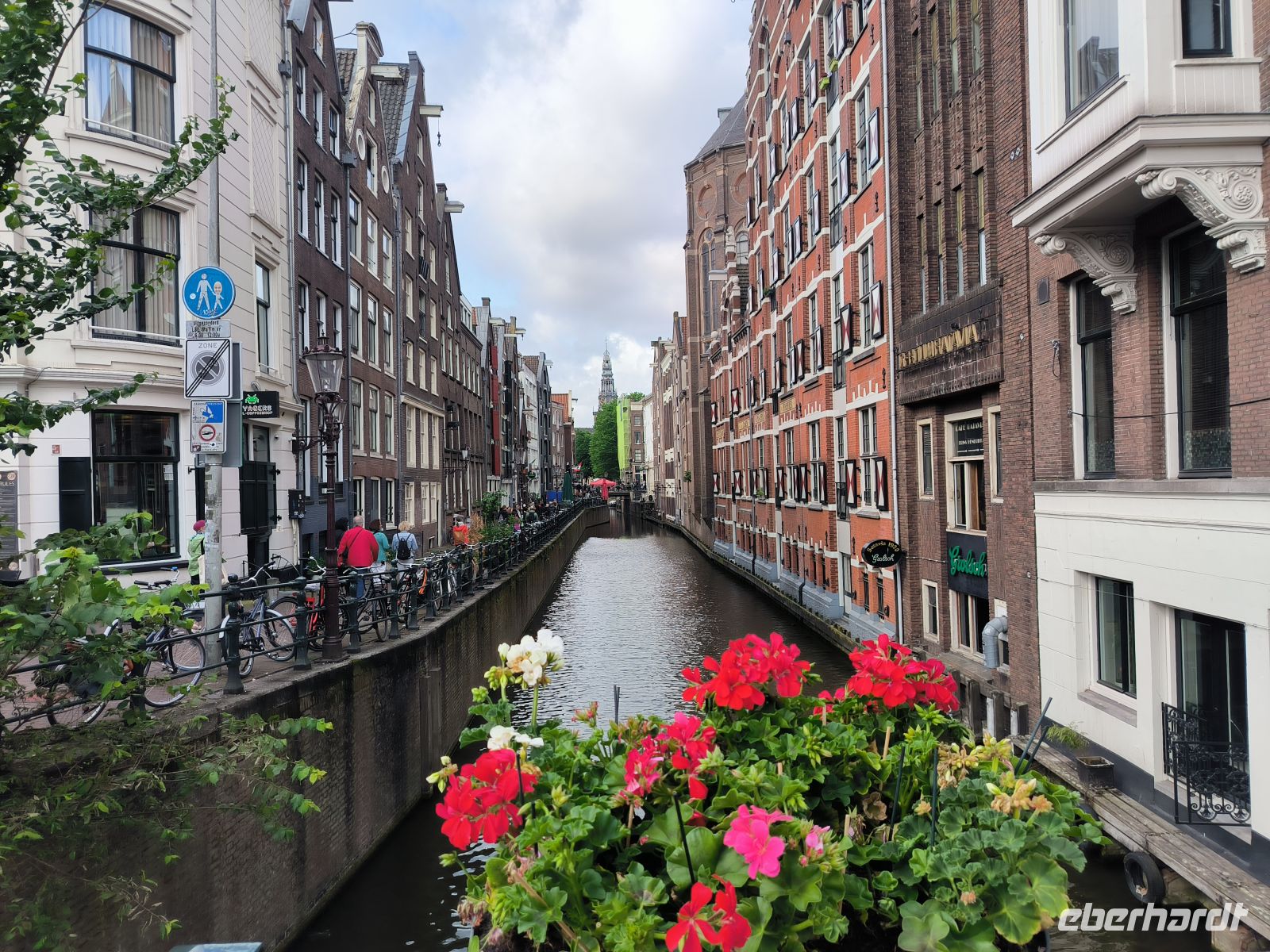 Martina erklärt uns auch die Bedeutung der Amsterdamer Flagge, die wir überall entdecken. Das Wappen von Amsterdam besteht aus einem roten Schild mit drei weißen Kreuzen auf einem schwarzen Streifen. Diese stehen für die drei Plagen: Flut, Feuer und Pest. Oberhalb des Schilds befindet sich die Kaiserkrone von Österreich und daneben zwei goldene Löwen. Aus vielen Ecken oder Coffee-Shops weht uns immer wieder ein verdächtiger Duft um die Nase.