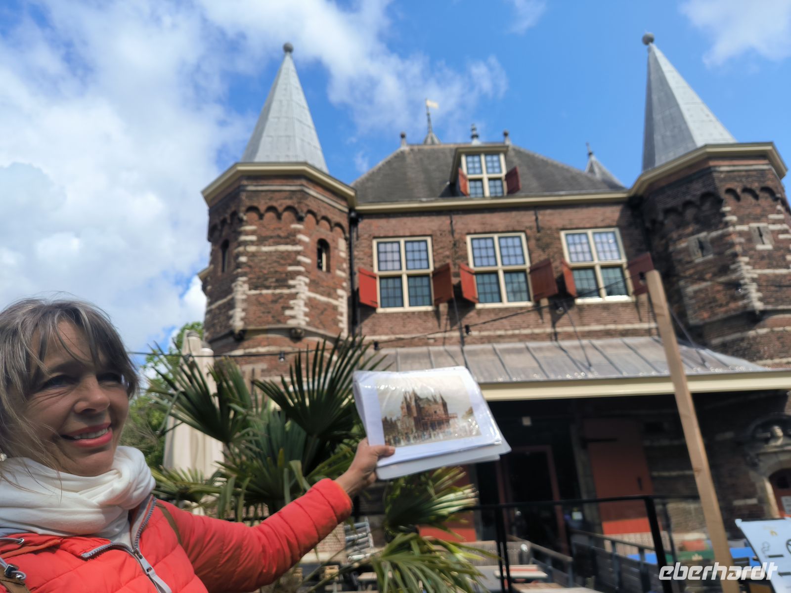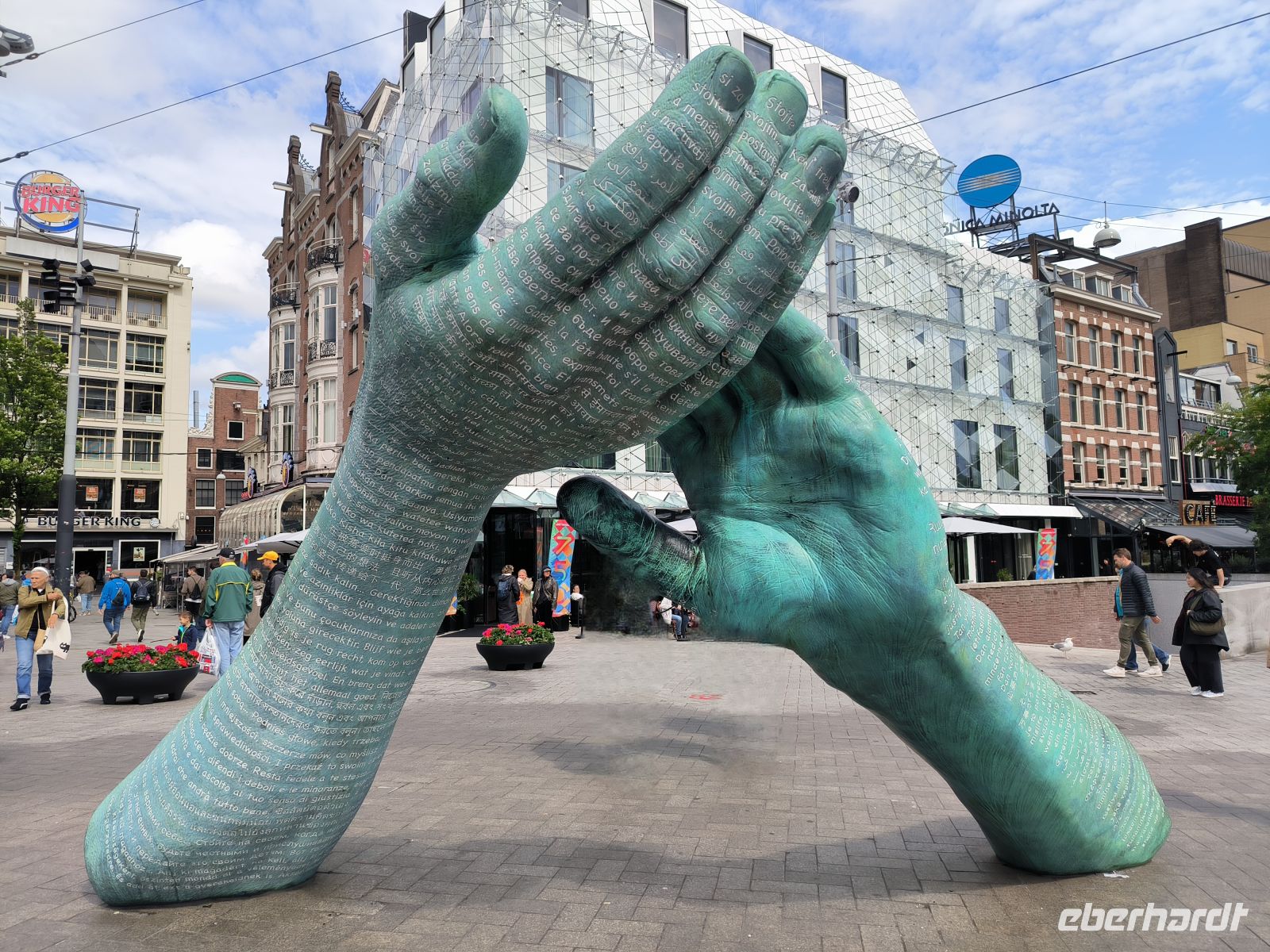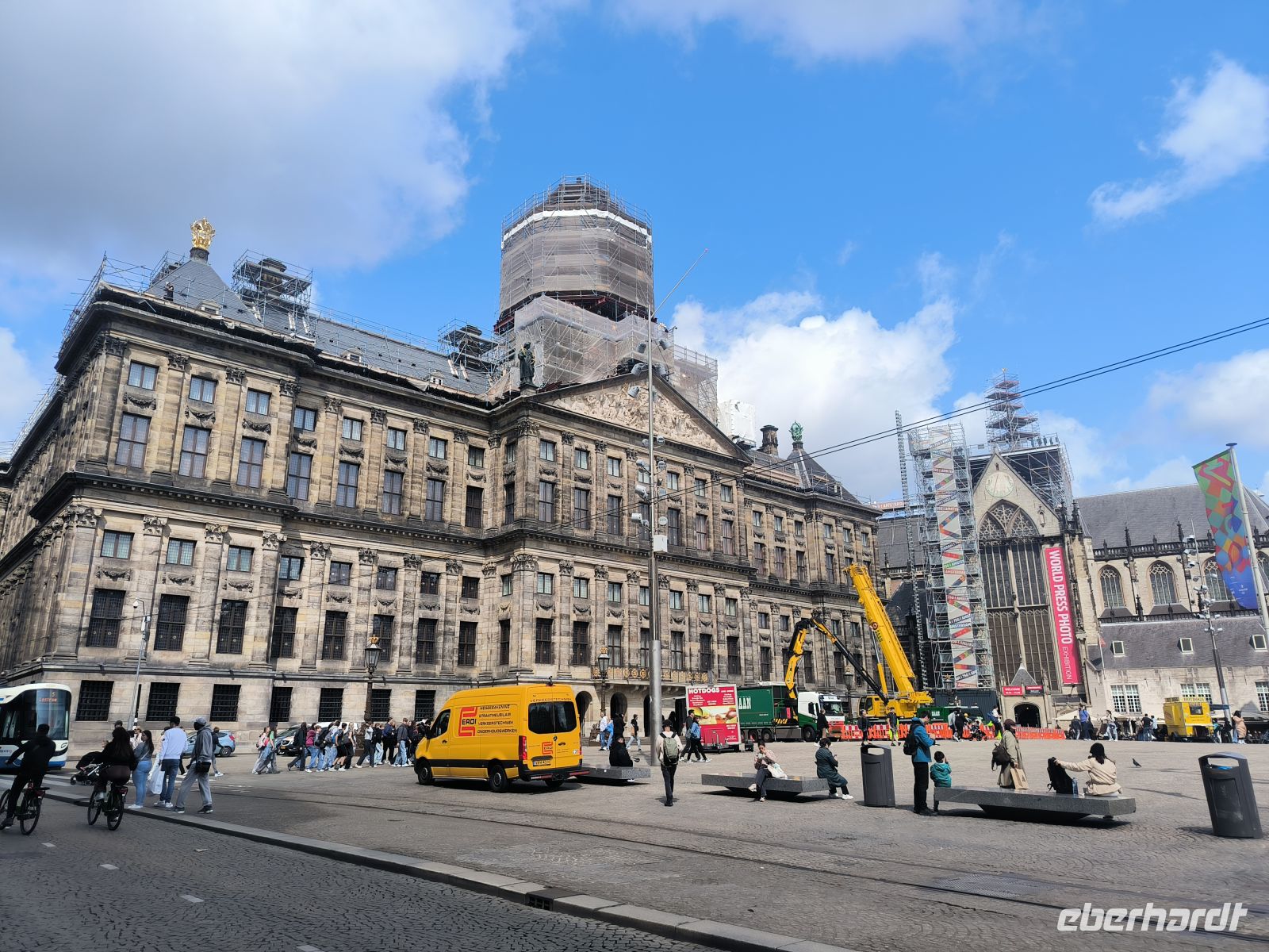 Den Weg mit der Straßenbahn zum Bahnhof kennen wir ja schon und so sind wir pünktlich am Treffpunkt mit unserer Stadtführerin Martina. Sie wird uns in zwei Stunden die wichtigsten und schönsten Plätze ihrer Wahlheimat zeigen. Unweit vom Bahnhof befindet sich das Rotlichtviertel. So früh am Morgen wähnt man sich aber in einer ganz normalen Geschäftsstraße, wo jetzt die Straßenkehrer für Lärm und Sauberkeit sorgen. Wir passieren den Nieuw Markt und den Dam. Hier befindet sich inmitten der pulsierenden Metropole der Königspalast, auch Paleis op de Dam oder Koninklijk Paleis genannt. Leider wird es uns aktuell nicht selbst möglich sein, in die spannende und prunkvolle Welt des Jahrhunderte alten niederländischen Königshauses einzutauchen. Direkt neben dem Königspalast liegt die Nieuwe Kerk (Neue Kirche), in der seit 1814 die niederländischen Monarchen gekrönt werden. Hier fanden auch die Trauungen der königlichen Hochzeiten statt, wie die Heirat von Willem-Alexander und Máxima im Jahr 2002.