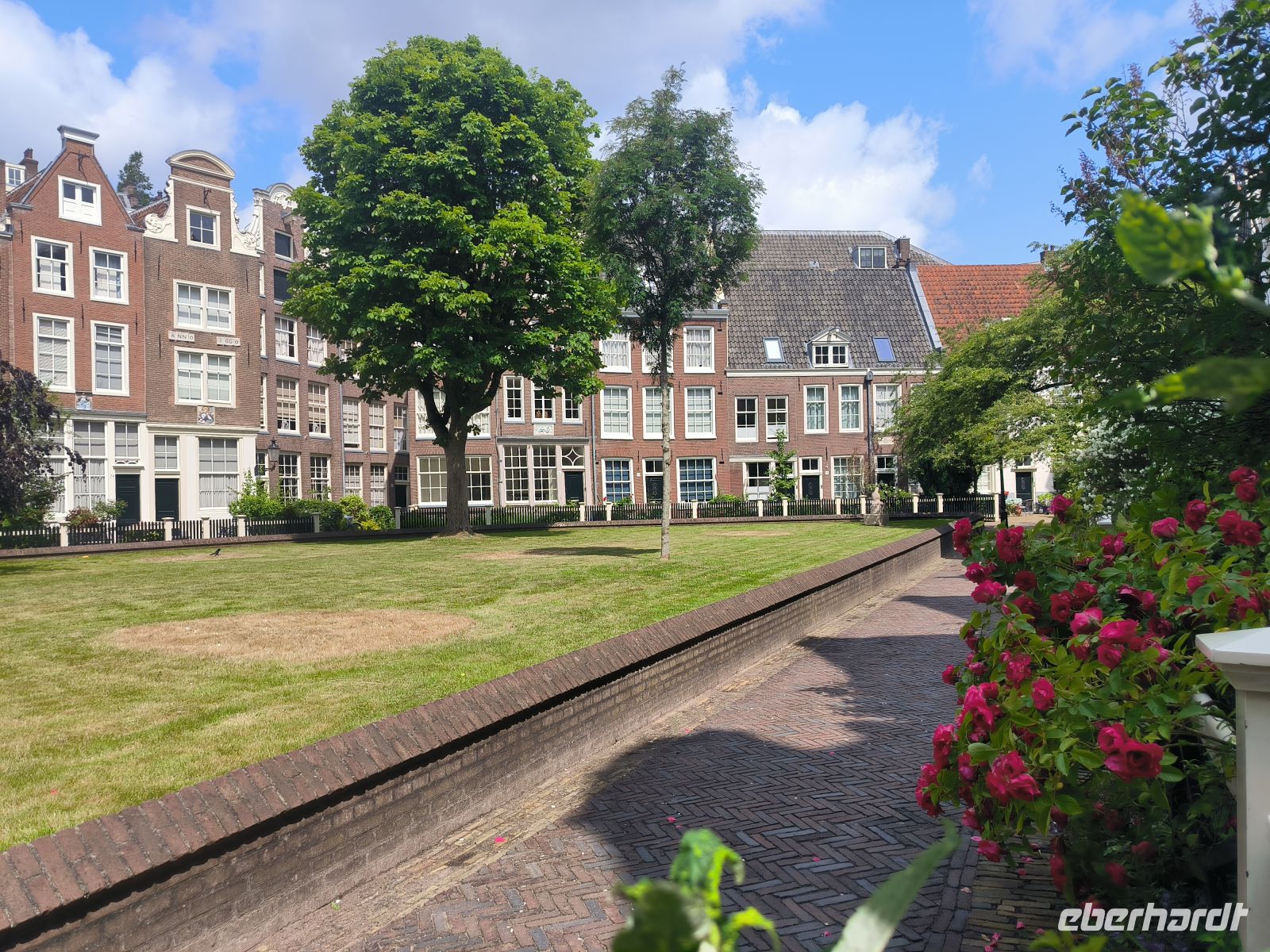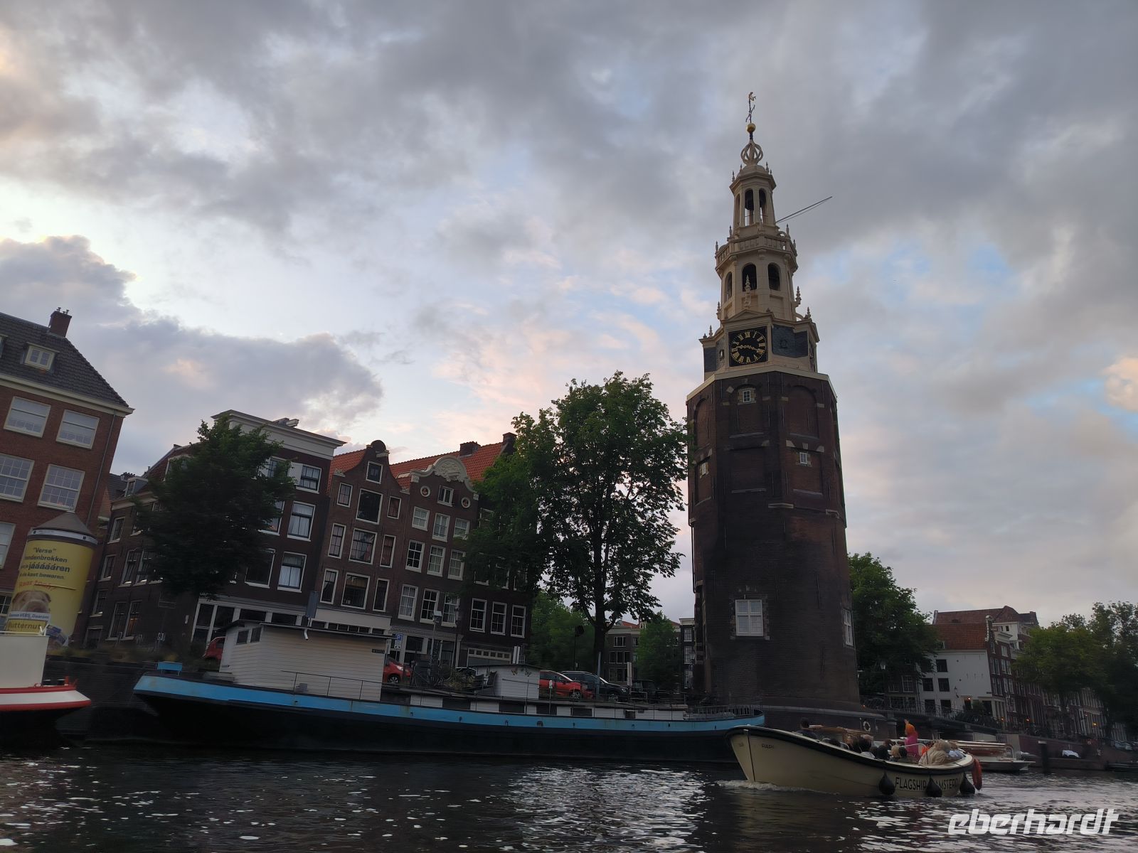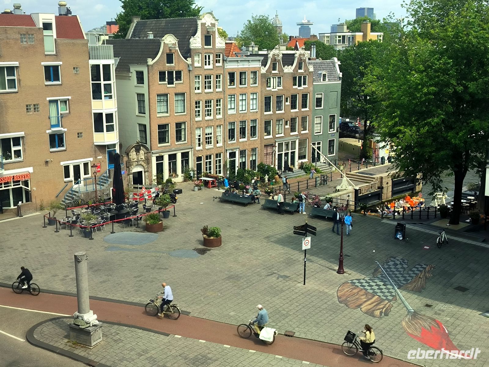 Den Weg mit der Straßenbahn zum Bahnhof kennen wir ja schon und so sind wir pünktlich am Treffpunkt mit unserer Stadtführerin Martina. Sie wird uns in zwei Stunden die wichtigsten und schönsten Plätze ihrer Wahlheimat zeigen. Unweit vom Bahnhof befindet sich das Rotlichtviertel. So früh am Morgen wähnt man sich aber in einer ganz normalen Geschäftsstraße, wo jetzt die Straßenkehrer für Lärm und Sauberkeit sorgen. Wir passieren den Nieuw Markt und den Dam. Hier befindet sich inmitten der pulsierenden Metropole der Königspalast, auch Paleis op de Dam oder Koninklijk Paleis genannt. Leider wird es uns aktuell nicht selbst möglich sein, in die spannende und prunkvolle Welt des Jahrhunderte alten niederländischen Königshauses einzutauchen. Direkt neben dem Königspalast liegt die Nieuwe Kerk (Neue Kirche), in der seit 1814 die niederländischen Monarchen gekrönt werden. Hier fanden auch die Trauungen der königlichen Hochzeiten statt, wie die Heirat von Willem-Alexander und Máxima im Jahr 2002.