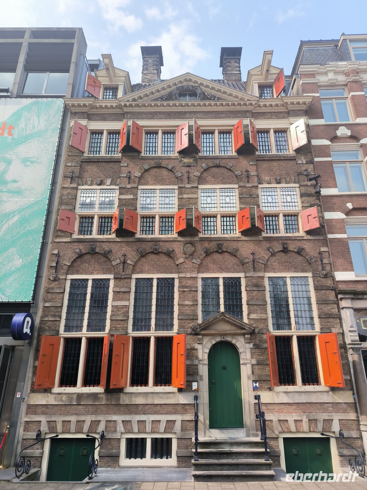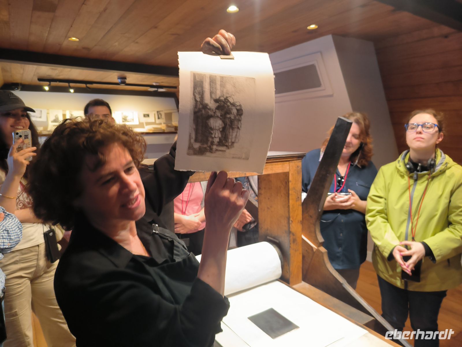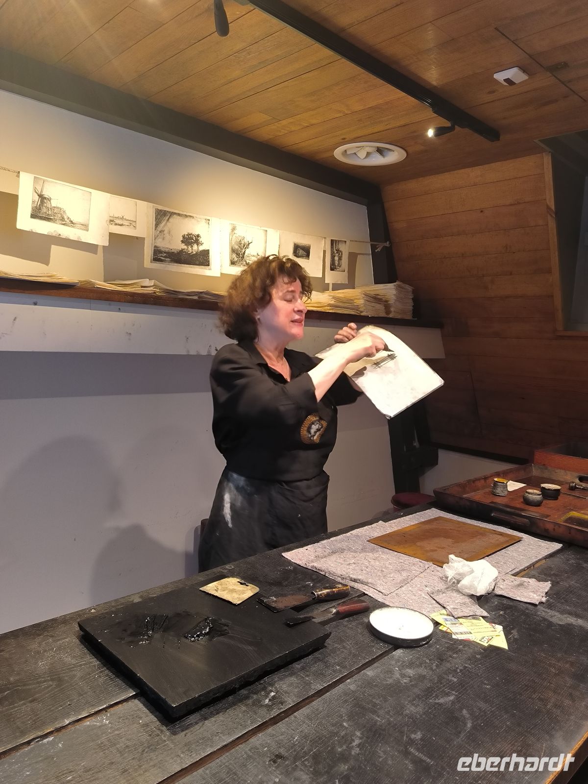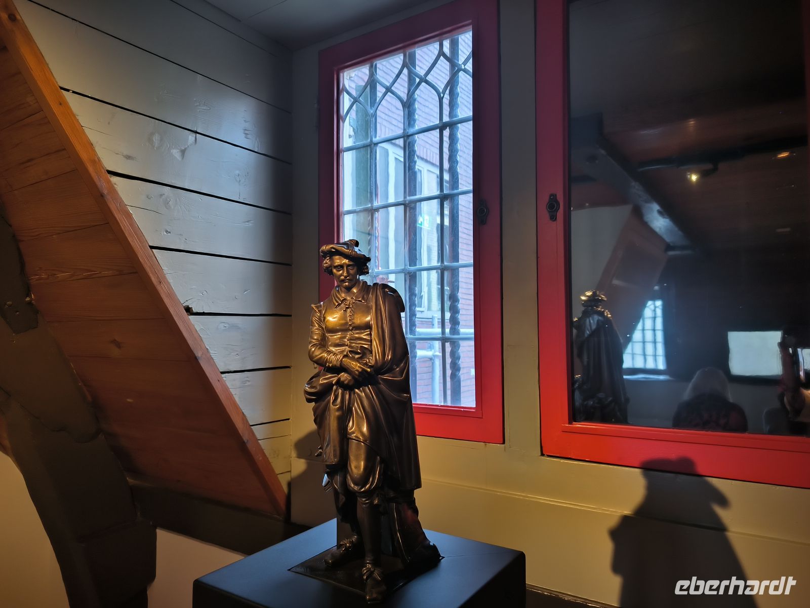 Rembrandts Geist und Genius erleben wir in dem Haus, in dem er 19 kreative Jahre, davon drei mit seiner geliebten Frau Saskia, verbrachte. Das Museum Het Rembrandthuis wurde 1911 mit Radierungen Rembrandts, Gemälde seiner Zeitgenossen und einer Rekonstruktion der Hauseinrichtung zu Rembrandts Lebzeiten eröffnet. Der am 7. Mai 1998 eröffnete Neubau direkt daneben bietet Platz für zwei Ausstellungsgalerien, die Verwaltung und die Bibliothek mit dem „Rembrandt Information Center“. Die Sammlung umfasst mit 260 der 290 Radierungen Rembrandts einen fast kompletten Überblick über Rembrandts Wirken in dieser Kunstgattung. Daneben besitzt es zudem auch einige der Druckplatten. z.B. Radierungen Abrahams Opfer, (15,6 × 13,1 cm) aus dem Jahr 1655, und Die Ruinen des Alten Rathauses von Amsterdam, Die Flucht nach Ägypten, David und Goliath und der vierte Zustand der Radierung Die drei Kreuze, Selbstporträt mit buschigem Haar und Die Landschaft mit den drei Bäumen. Wir haben die große Freude, eine Live Vorführung von Rembrandts Radierungs-Technik erleben zu können. Natürlich nicht mit einem Original Druckstock. Diese liegen gut verwahrt in einer Vitrine. Ebenso wie einige Original-Drucke mit einer Lederabdeckung geschützt sind.