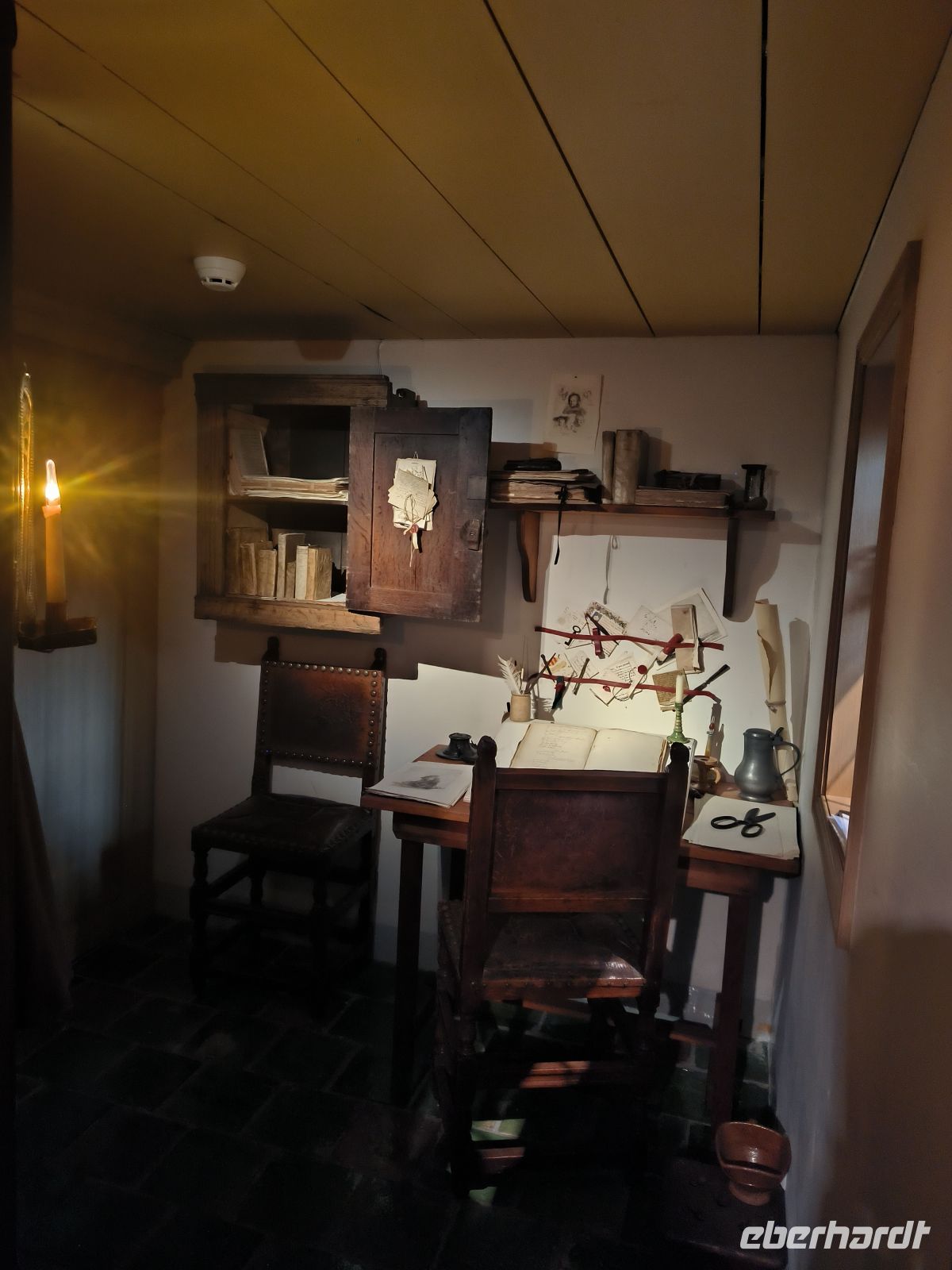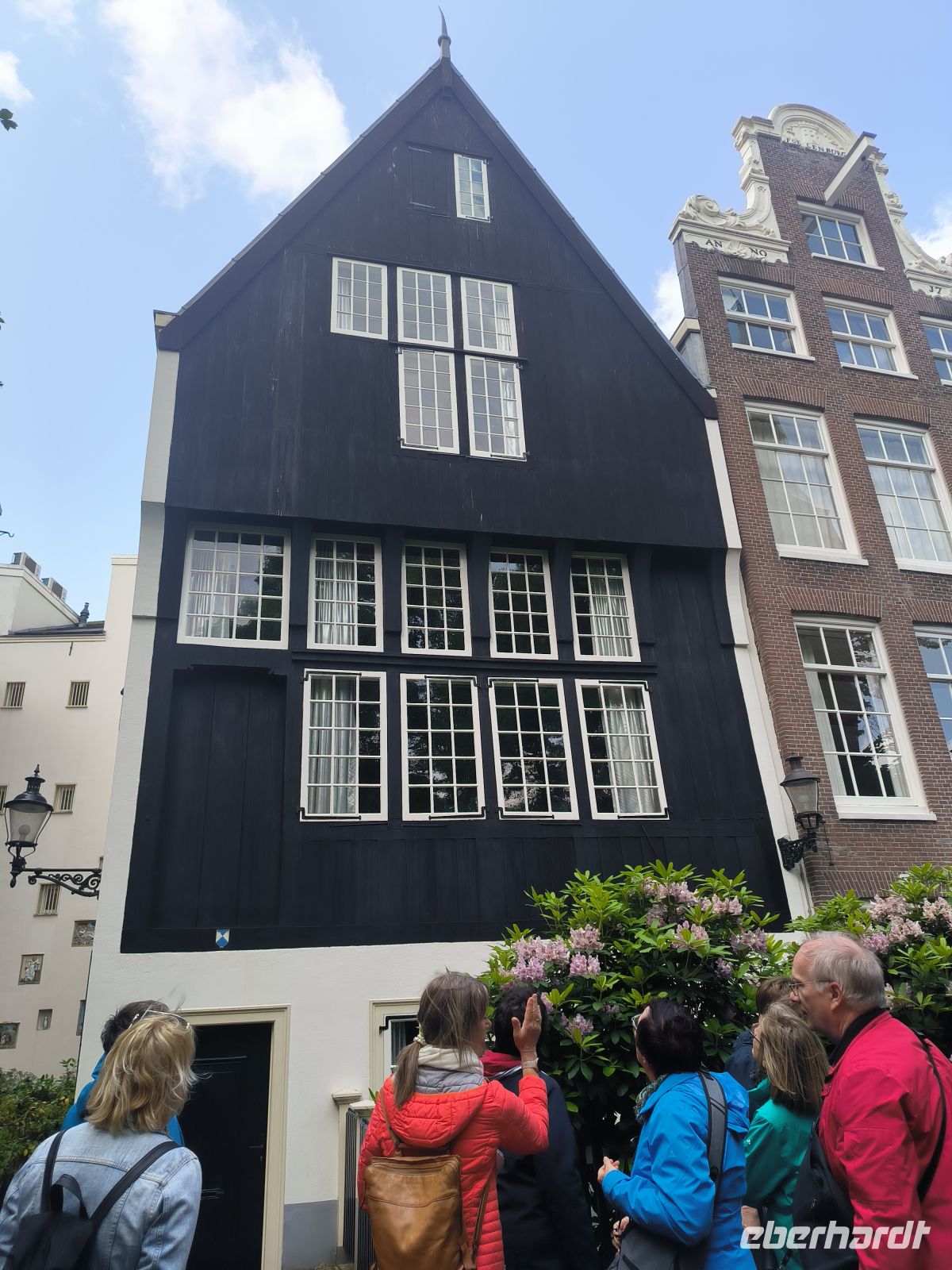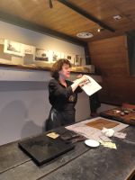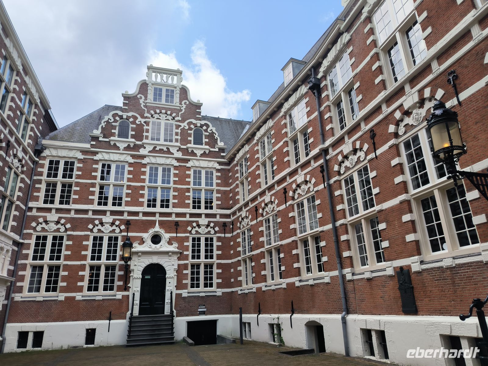 Rembrandts Geist und Genius erleben wir in dem Haus, in dem er 19 kreative Jahre, davon drei mit seiner geliebten Frau Saskia, verbrachte. Das Museum Het Rembrandthuis wurde 1911 mit Radierungen Rembrandts, Gemälde seiner Zeitgenossen und einer Rekonstruktion der Hauseinrichtung zu Rembrandts Lebzeiten eröffnet. Der am 7. Mai 1998 eröffnete Neubau direkt daneben bietet Platz für zwei Ausstellungsgalerien, die Verwaltung und die Bibliothek mit dem „Rembrandt Information Center“. Die Sammlung umfasst mit 260 der 290 Radierungen Rembrandts einen fast kompletten Überblick über Rembrandts Wirken in dieser Kunstgattung. Daneben besitzt es zudem auch einige der Druckplatten. z.B. Radierungen Abrahams Opfer, (15,6 × 13,1 cm) aus dem Jahr 1655, und Die Ruinen des Alten Rathauses von Amsterdam, Die Flucht nach Ägypten, David und Goliath und der vierte Zustand der Radierung Die drei Kreuze, Selbstporträt mit buschigem Haar und Die Landschaft mit den drei Bäumen. Wir haben die große Freude, eine Live Vorführung von Rembrandts Radierungs-Technik erleben zu können. Natürlich nicht mit einem Original Druckstock. Diese liegen gut verwahrt in einer Vitrine. Ebenso wie einige Original-Drucke mit einer Lederabdeckung geschützt sind.