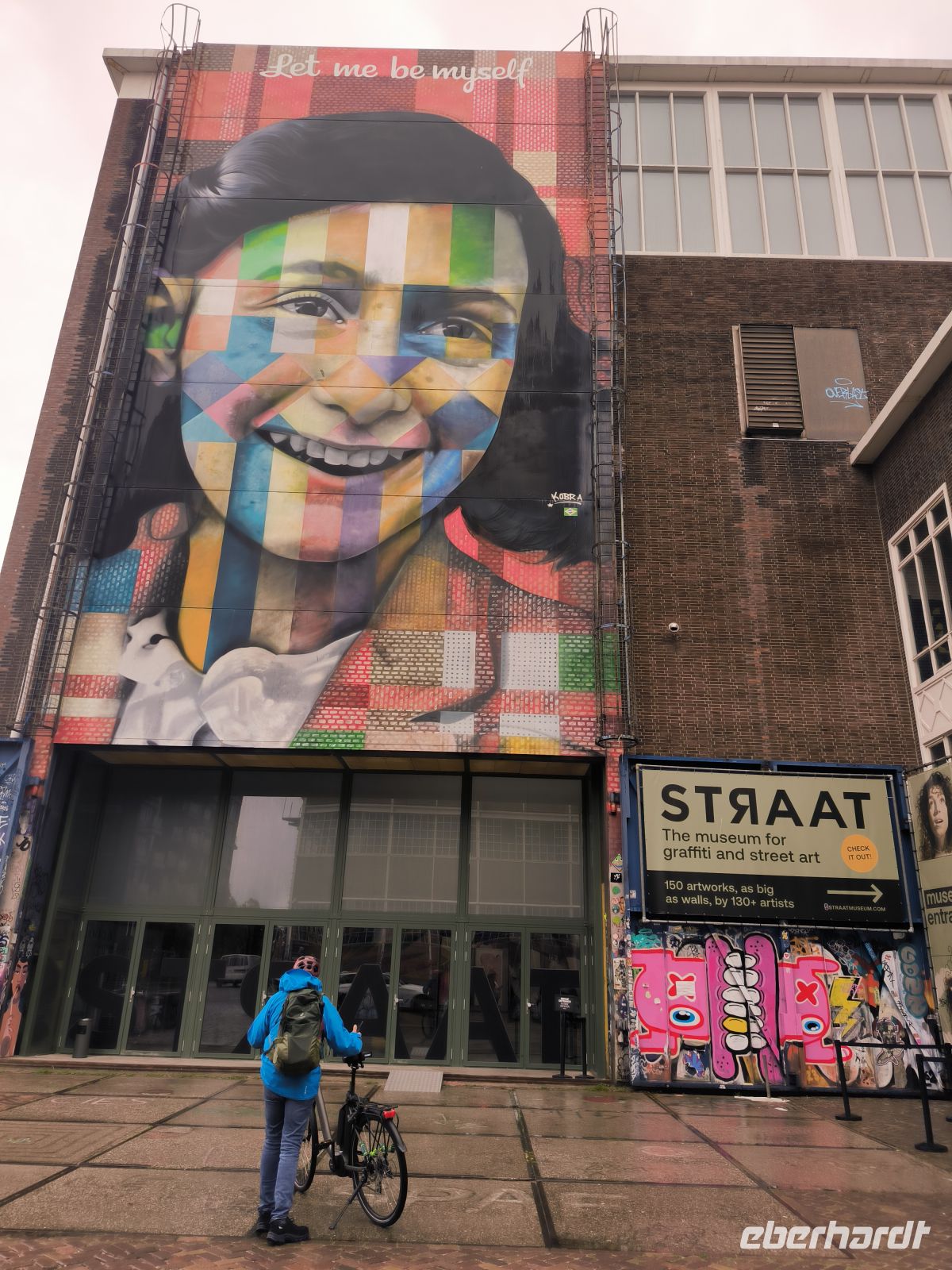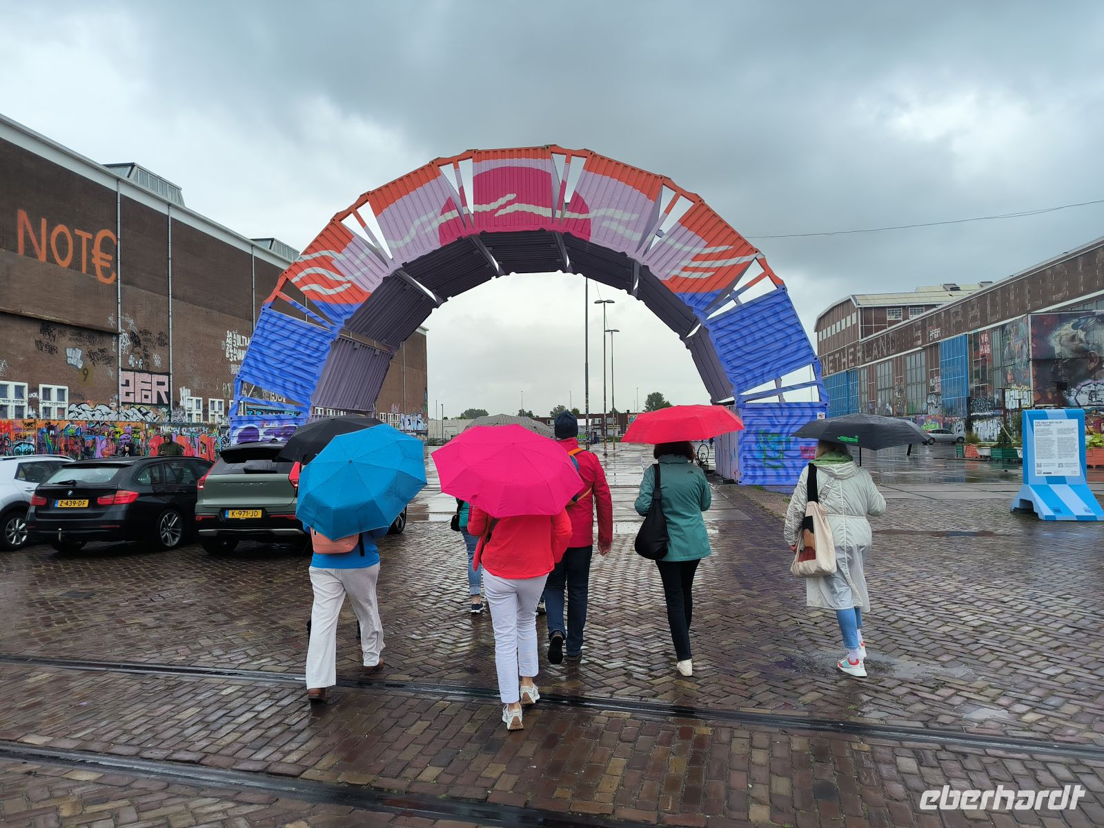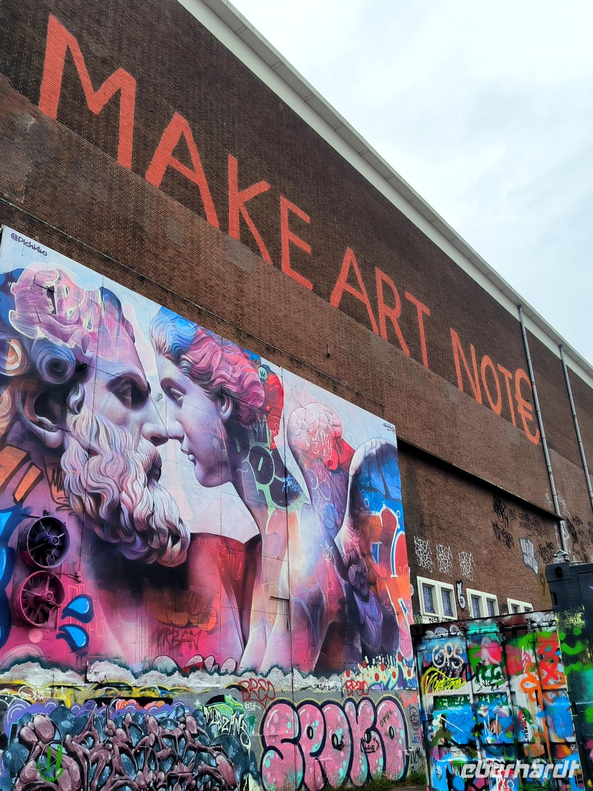 Heute meint es der Wettergott nicht so gut mit uns. Wir müssen erst einen heftigen Platzregen abwarten, bevor wir das Hotel verlassen und in die Innenstadt fahren. Unser Ziel heißt „NDSM“ - Nederlandsche Dok en Scheepsbouw Maatschappij. Das ehemalige niederländische Schiffbauunternehmen bestand von 1946 bis 1979. Die Werft am Ufer des Flusses IJ hat sich in den letzten Jahren zu einem enormen kulturellen Hotspot mit einer lebendigen Künstlergemeinschaft, Ateliers, einem StreetArt-Museum sowie einer ständig wachsenden Vielfalt an Bars und Restaurants entwickelt. Am frühen Vormittag ist es noch recht still, aber unzählige Straßenkunst-Motive draußen und drinnen sorgen trotz Regen für viel Farbe.