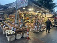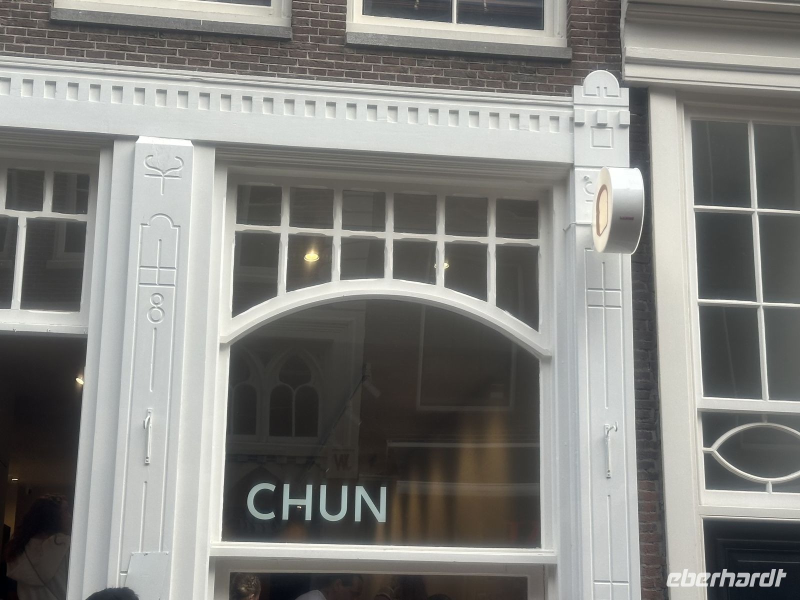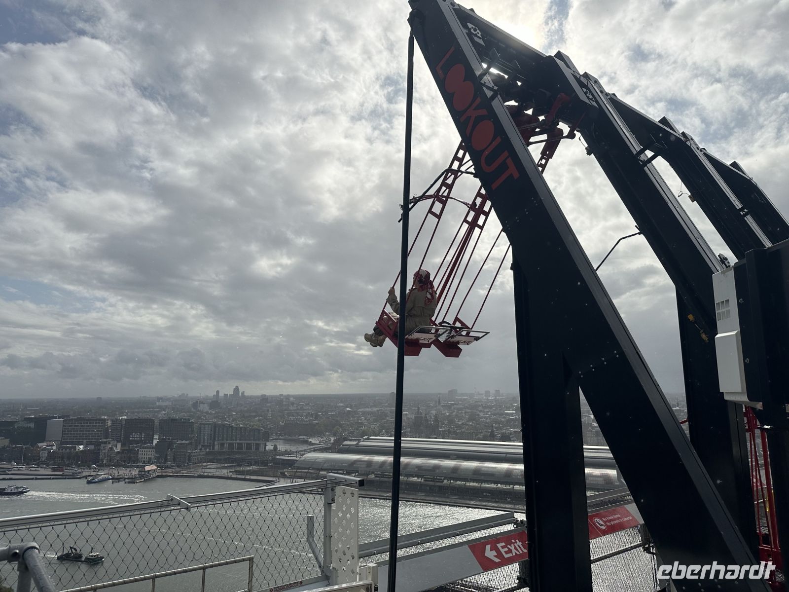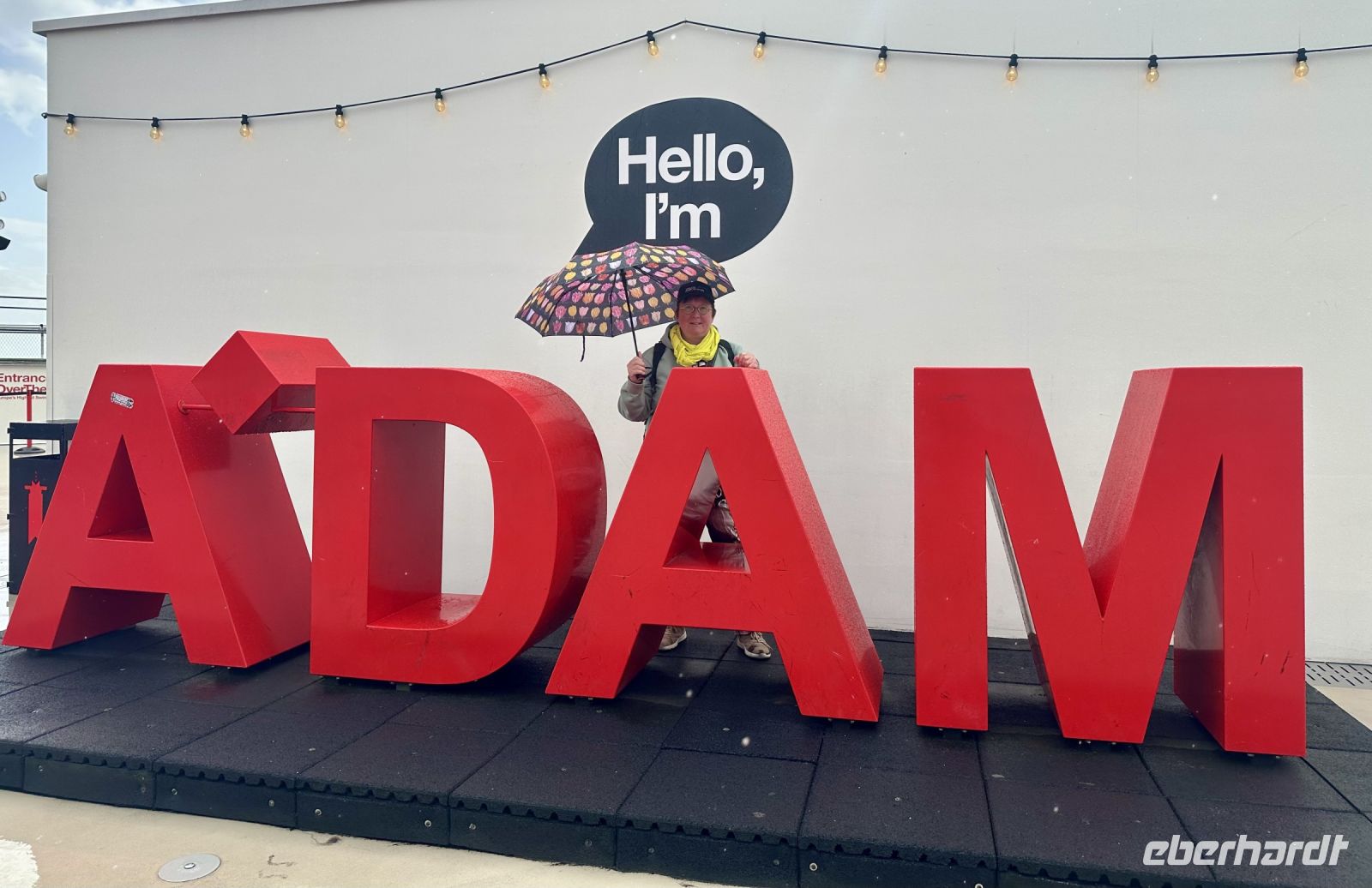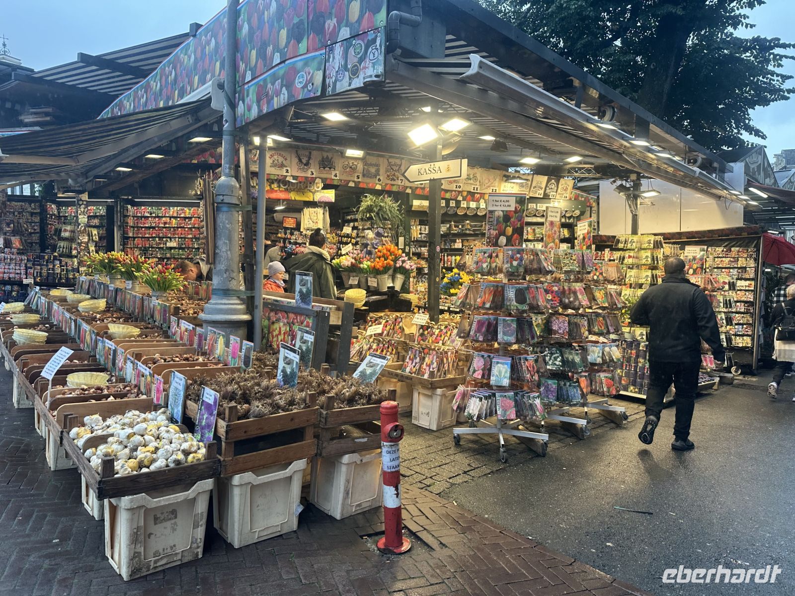 Die Van Stapele Koekmakerij, auf Deutsch - Van Stapele Keksladen, befindet sich kurz ums Eck von unserem Hotel. In den letzten Tagen konnten wir, mit großer Überraschung, beobachten, dass sich hier Schlangen von Menschen anstellen, warum auch immer. Heute haben wir das Privileg zu erfahren, was es hier Besonderes gibt. Denn Eberhardt TRAVEL hat für uns eine Reservierung vorgenommen und wir müssen die berühmten Kekse (ohne Anstehen) nur abholen und verkosten. Die köstlichen Schokoladenkekse sind frisch und warm und gefüllt. Lecker. Tatsächlich. Mit Mathilde stürzen wir uns nun wiederum in das Leben von Amsterdam. Zuerst besuchen wir den Blumenmarkt, auf dem man keine Blumenzwiebeln kaufen sollte, da es ein Markt für Touristen ist, die keine Ahnung haben. Hübsch anzusehen ist es allemal. Heute haben wir Pech mit dem Wetter. Es regnet fast ohne Unterlass. Tapfer folgen wir Mathilde durch die Stadt, denn sie weiß überall interessante Dinge zu erzählen. Und wenn es sehr schlimm wird, stellen wir uns unter. Mathilde bringt uns bis zum Adam Tower, zu dem wir die kostenlose Fähre benutzen. Doch hier heißt es, Abschied nehmen. Danke Mathilde! Für die Begleitung an drei Tagen in Amsterdam! Es war schön mit Dir!