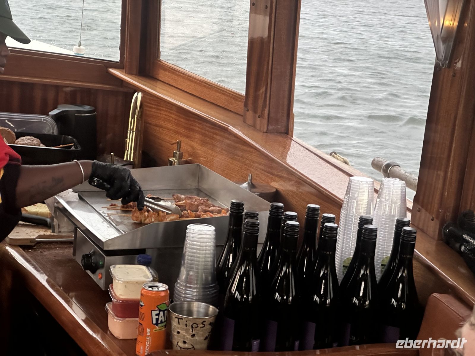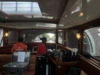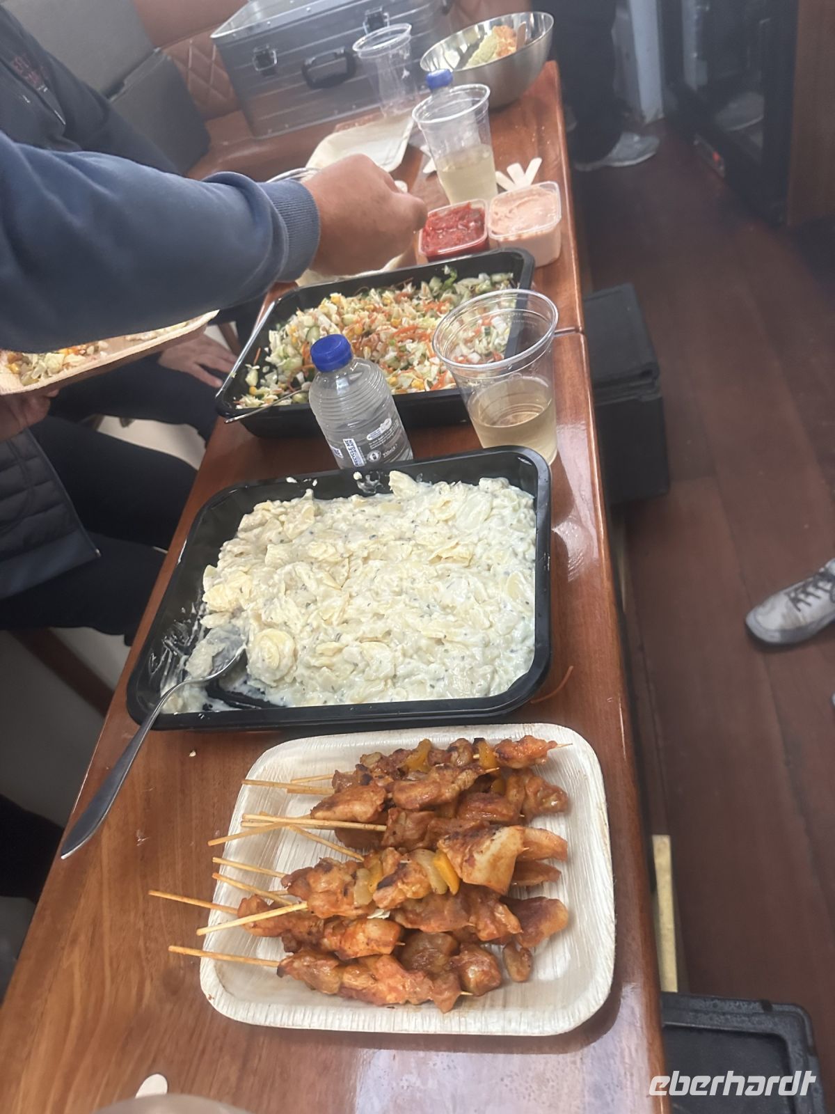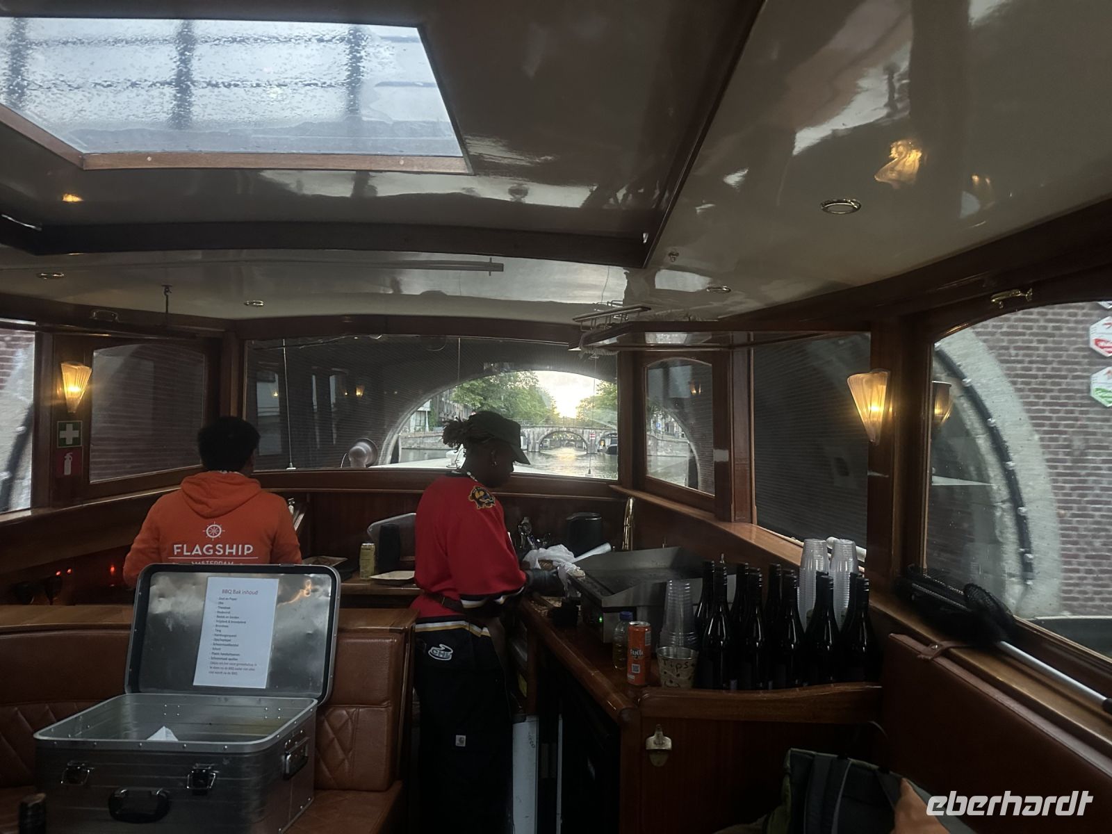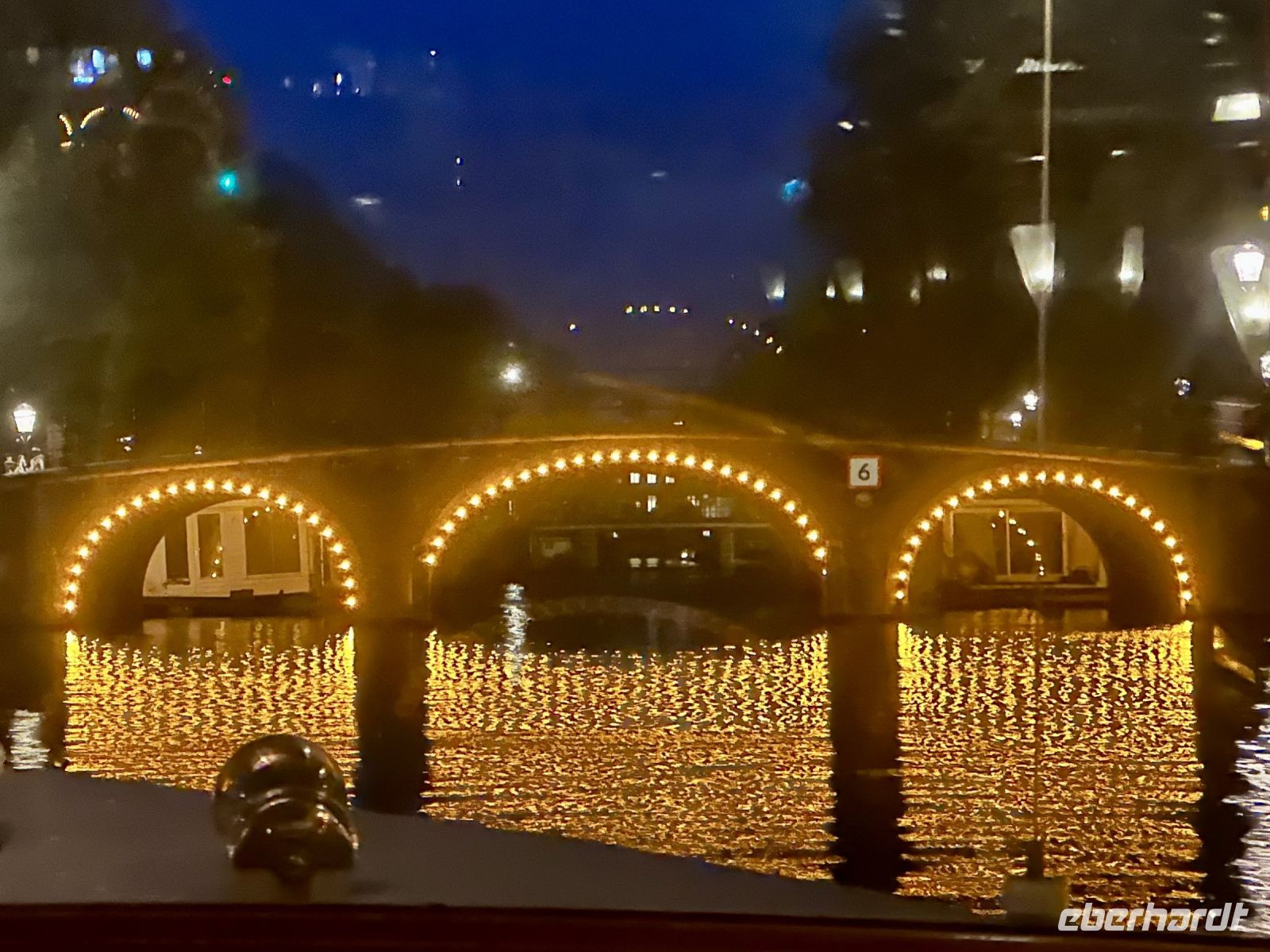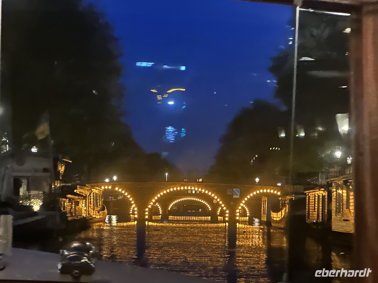 Wir fahren auf den Adam Tower, von dem wir einen fantastischen Blick auf die Stadt haben. Das Drehrestaurant dreht sich nicht, aber schön ist es trotzdem. Außerdem ergibt es sich, die Amsterdamer Spezialität Bitterballen zu kosten. Gemeinsam steigen wir bis auf das Dach, möchten aber die Sky-Schaukel nicht ausprobieren. Mit der Fähre und der Straßenbahn fahren wir zurück Richtung Hotel. Hier kehren wir ein ins Café Hoppe und stoßen mit einem Genever auf unsere schöne Reise an. Nun bleiben noch zwei Stunden bevor wir uns zum Abendessen wieder treffen. Mit der Straßenbahn geht es wiederum zum Hauptbahnhof und von hier aus zu Fuß zum Chinesischen Teehaus. Nach einer kurzen Wartezeit und Ausschauhalten nach unserem Boot, gehen wir an Bord. Wir werden freundlich begrüßt und schon geht es los. Getränke stehen nach Wunsch zur Verfügung - Bier, Wein, Wasser, Cola und noch mehr. Wir machen es uns gemütlich und unser Smutje fängt an zu grillen. Es duftet und die Bude wird blau. Wir reißen die Fenster auf und genießen, was uns serviert wird. Satay-Spießchen, Bouletten, scharfe Würstchen und Steak. Mehr als eine Stunde lassen wir es uns schmecken. Dann sind alle satt. Inzwischen ist es dunkel und wir durchqueren die beleuchteten Brücken über den Grachten von Amsterdam. Ein wunderschöner Abend beendet eine wundervolle Reise.