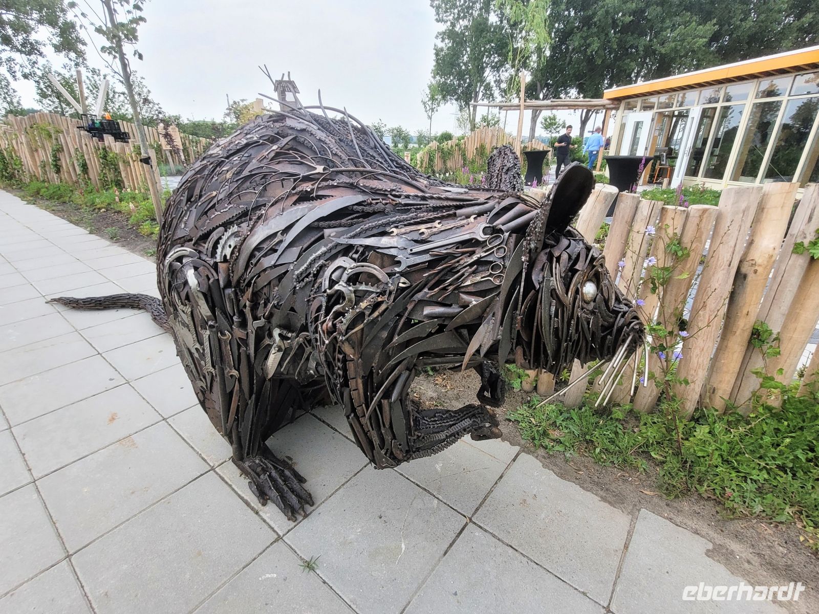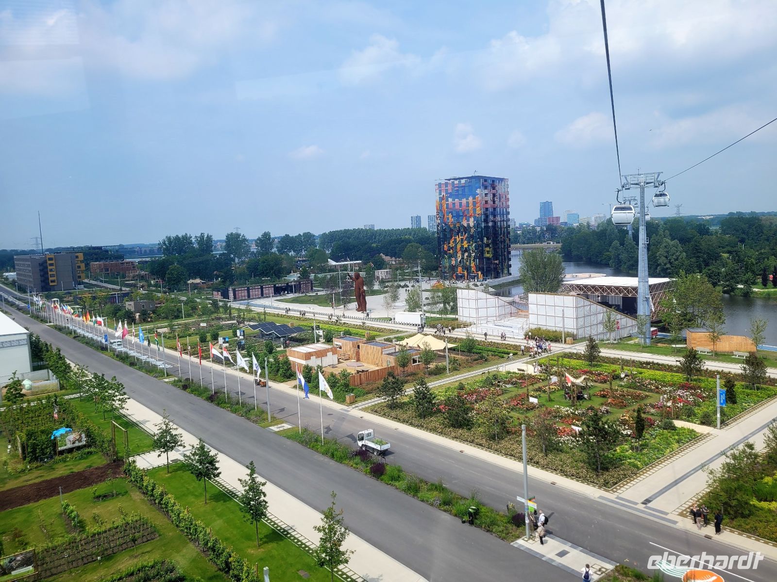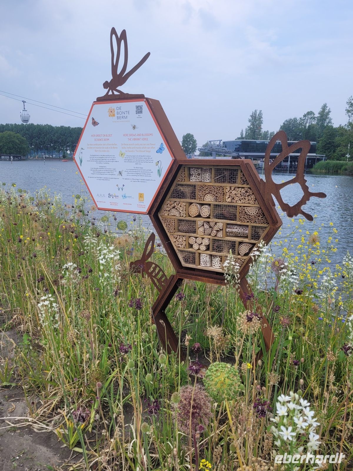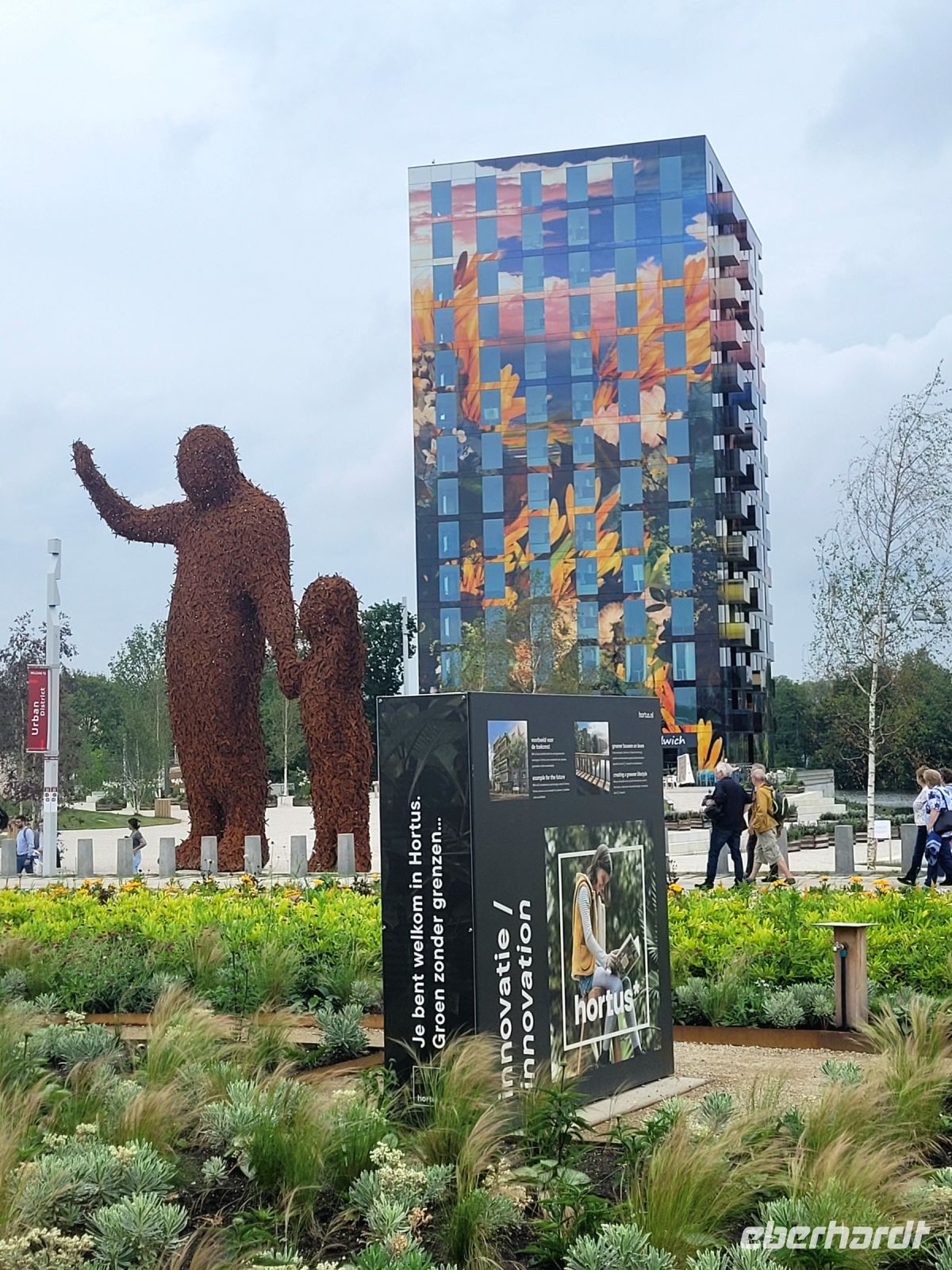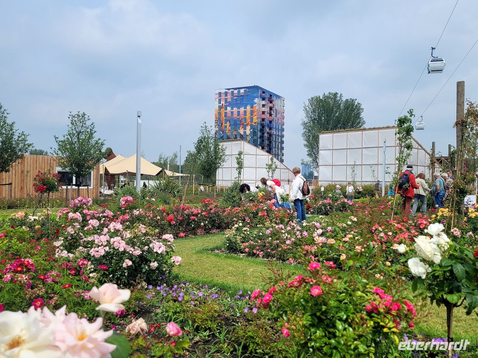 Seit dem 14. April 2022 ist Almere für sechs Monate lang Schauplatz für die Internationale Gartenbauausstellung. Thema: „Growing Green Cities“, d.h. die Städte unterhaltsamer, lebenswerter, nachhaltiger und freundlicher zu machen. Z.B. bienenfreundliche Pflanzen, Dachgärten, begrünte Fassaden unter Berücksichtigung einheimischer Materialien. Die Themengebiete sind nach Ländern, wie Niederlande- Deutschland- Belgien- Frankreich- Bangladesch- China- Indien- Katar- Italien- Schweiz etc. aufgegliedert. Das Gelände befindet sich südlich von Almere, hier soll einmal ein neues und natürlich „grünes“ Stadtviertel entstehen. Almere liegt ganz im Südwesten der Provinz Flevoland, unter dem Meeresspiegel, auf Land, das dem Meer durch jahrzehntelange harte Arbeit abgetrotzt wurde. Im Pavillon der Provinz Flevoland können wir eine virtuelle Fahrt mit dem Heißluftballon erleben. Von der Gondel aus der Seilbahn lässt sich das Gelände aus luftiger Höhe erkunden. So kehren wir am Abend zwar mit vielen Eindrücken, kreativen Ideen und Fotos im Gepäck ins Hotel zurück.