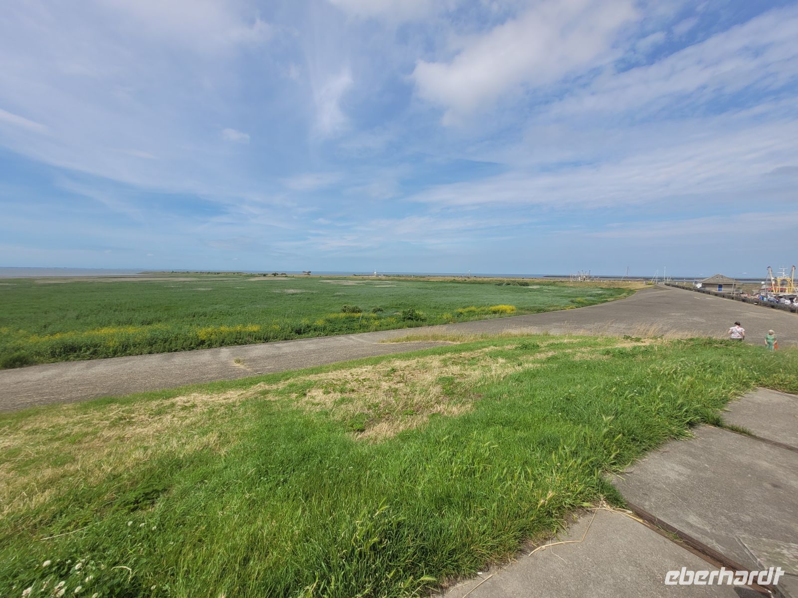 Vom Fischerhafen in Den Oever schauen wir uns das mächtige Bauwerk, den Windradpark und das Wattenmeer an. Langsam bekommen wir Kaffeedurst.