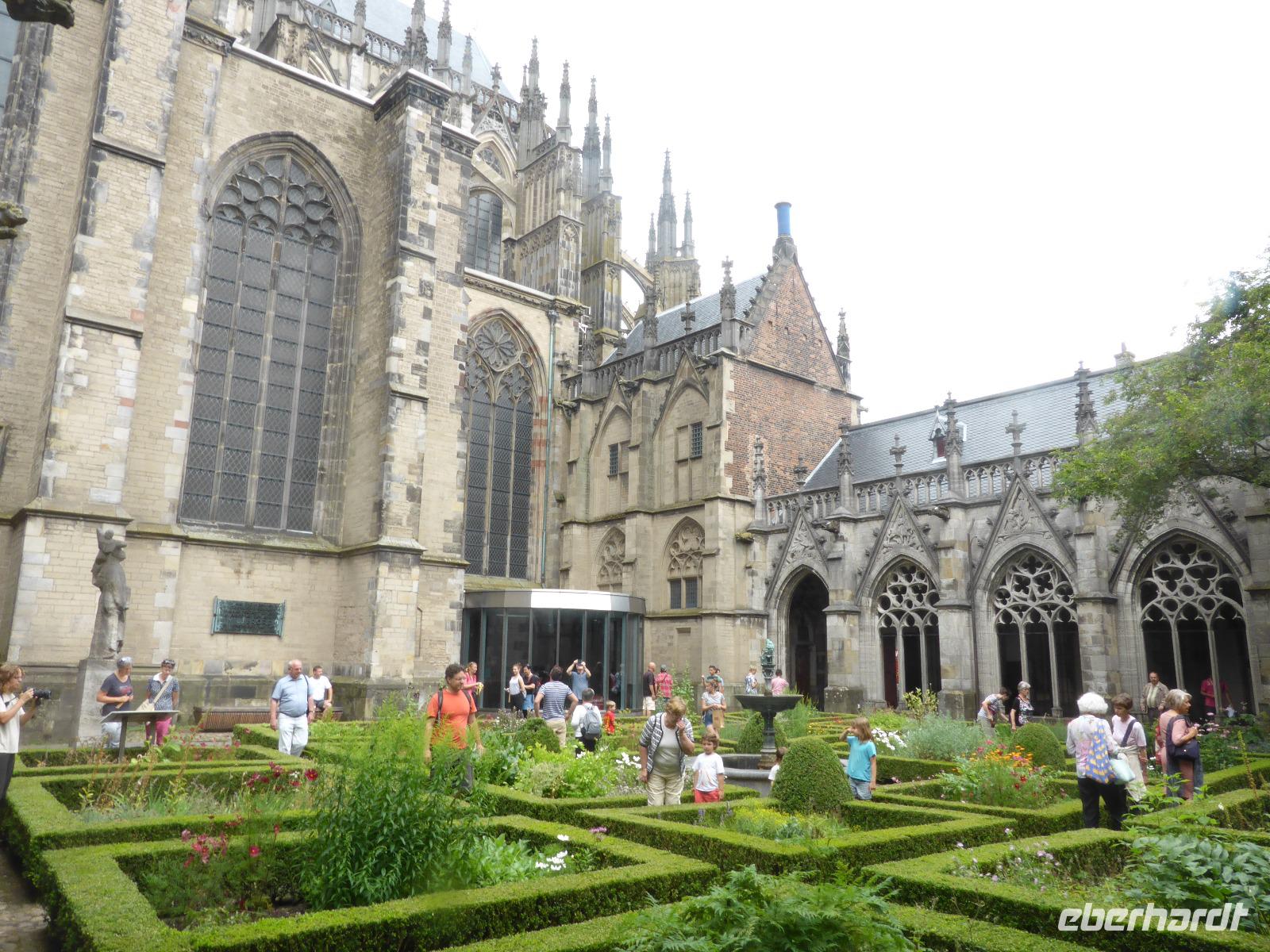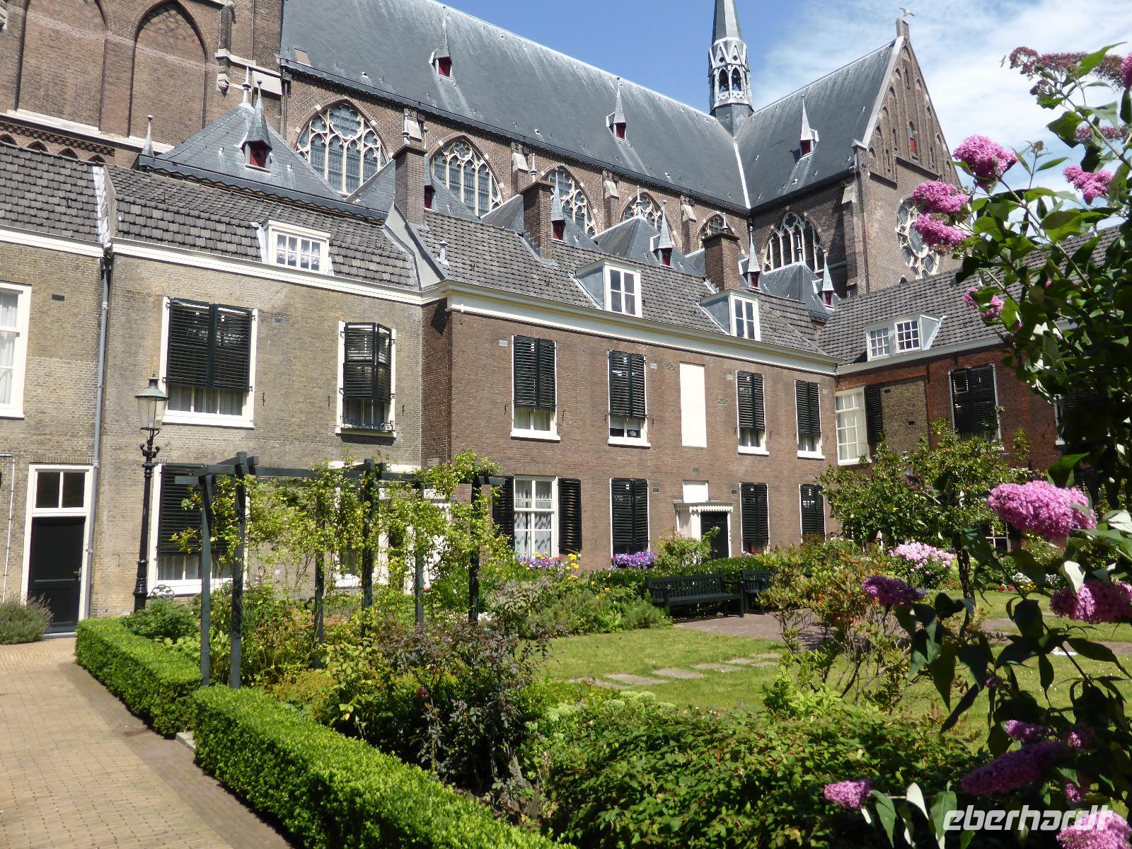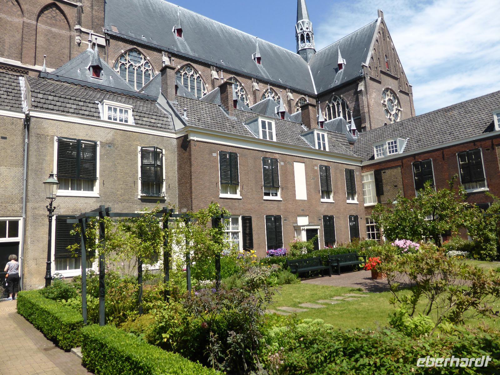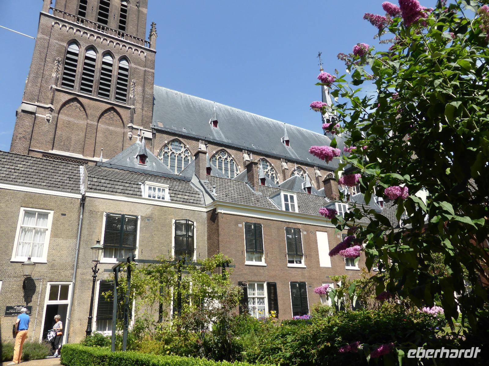 Am Nachmittag besuchten wir die historische Stadt Utrecht. Utrecht geht auf eine römische Gründung zurück und ist damit eine ältesten Städte der Niederlande. Entlang der Oude Gracht, einem Teil des Kromme Rijn erreichten wir den Domplatz. Das besondere an dieser Gracht ist, dass der Wasserspiegel so tief liegt, dass in den Kaimauern Lagerräume, Cafés und Sitzmöglichkeiten zu finden sind. Der Domturm ist mit 112 m der höchste Kirchturm der Niederlande. Er war einst mit dem Langhaus mit dem noch existierenden Chor verbunden. Bei einem Gewittersturm 1674 stürzte das Langhaus ein und wurde nie wieder aufgebaut. Leider war der Dom aufgrund einer Veranstaltung geschlossen, sodass wir die Gräber der deutschen Kaiser Konrad II. und Heinrich IV nicht besichtigen konnten. Entlang der Gracht vorbei am Rathaus erreichten wir die beiden Stadtpalais Oudaen (Brauerei) und Haus Drakenburg. Hier verabschiedeten sich die meisten Gäste. Eine kleine Gruppe setzte den Rundgang fort und kam in der St. Janskerk in den Genuss einer sehr interessanten Führung.
