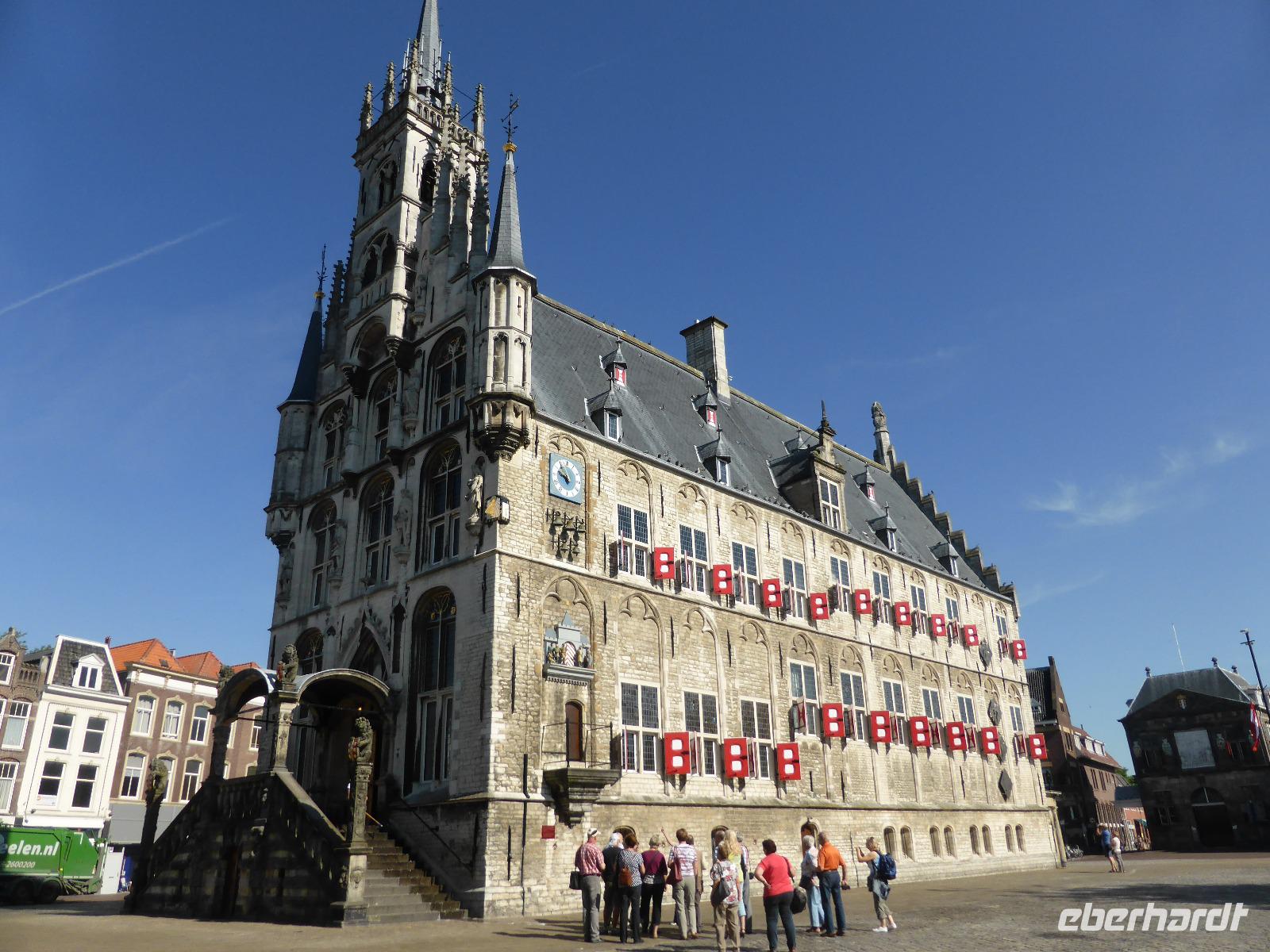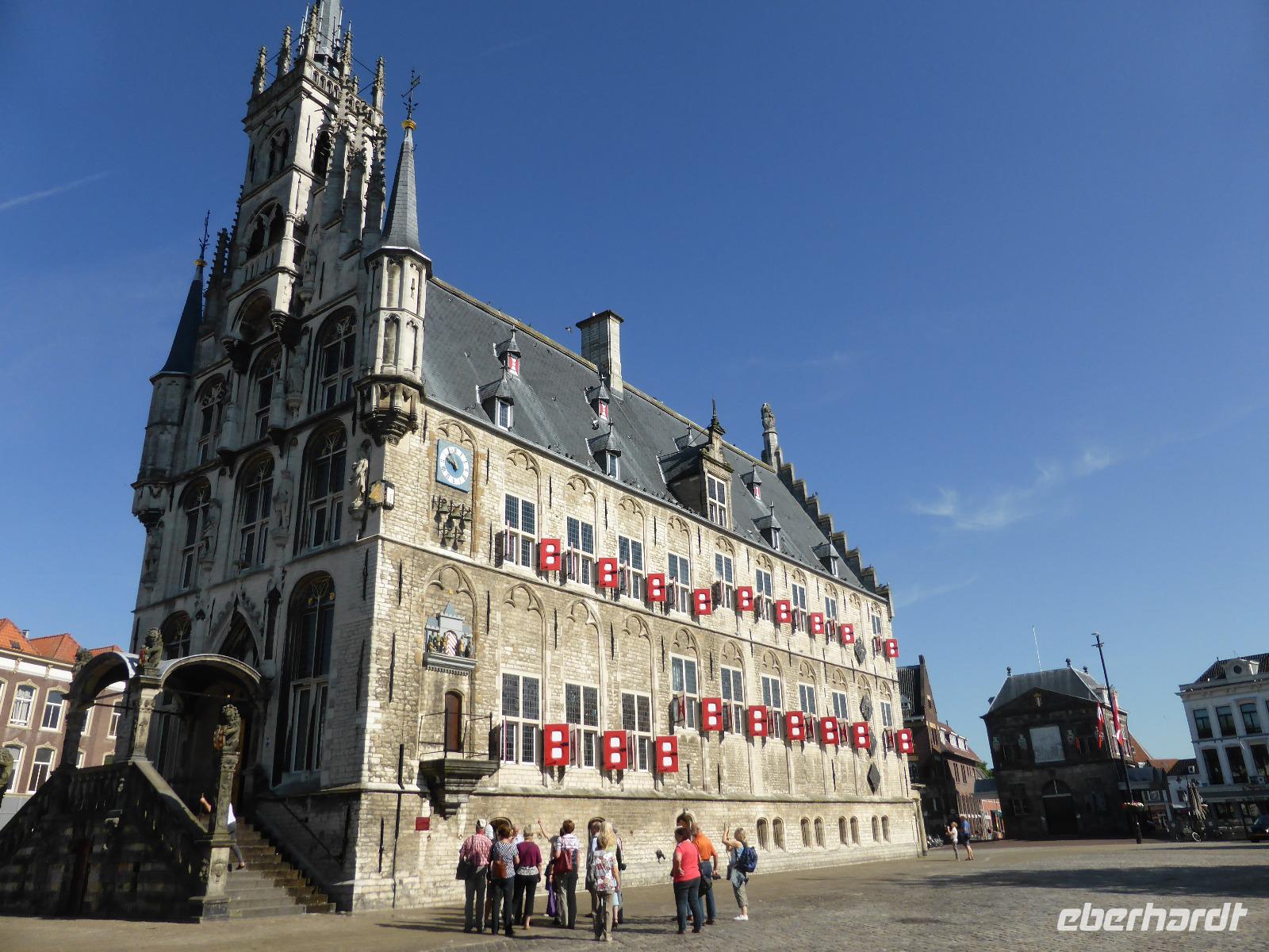 Gestärkt vom reichhaltigen Frühstücksbuffet begaben wir uns auf den Stadtrundgang in Gouda. Die alte Käsestadt Gouda gab uns einen ersten Eindruck einer holländischen Idylle, malerische Gassen, historische Bauten sowie schöne Grachten. Wir spazierten entlang des Torfmarktes zum spätgotischen Rathaus auf dem weiträumigen dreieckigen Marktplatz. Am Marktplatz konnten wir ebenfalls noch die Stadtwaage, ein typisches Beispiel niederländischer Renaissancebaukunst bewundern. Im Steinrelief über dem Eingang ist das Wiegen der Käselaibe dargestellt.
