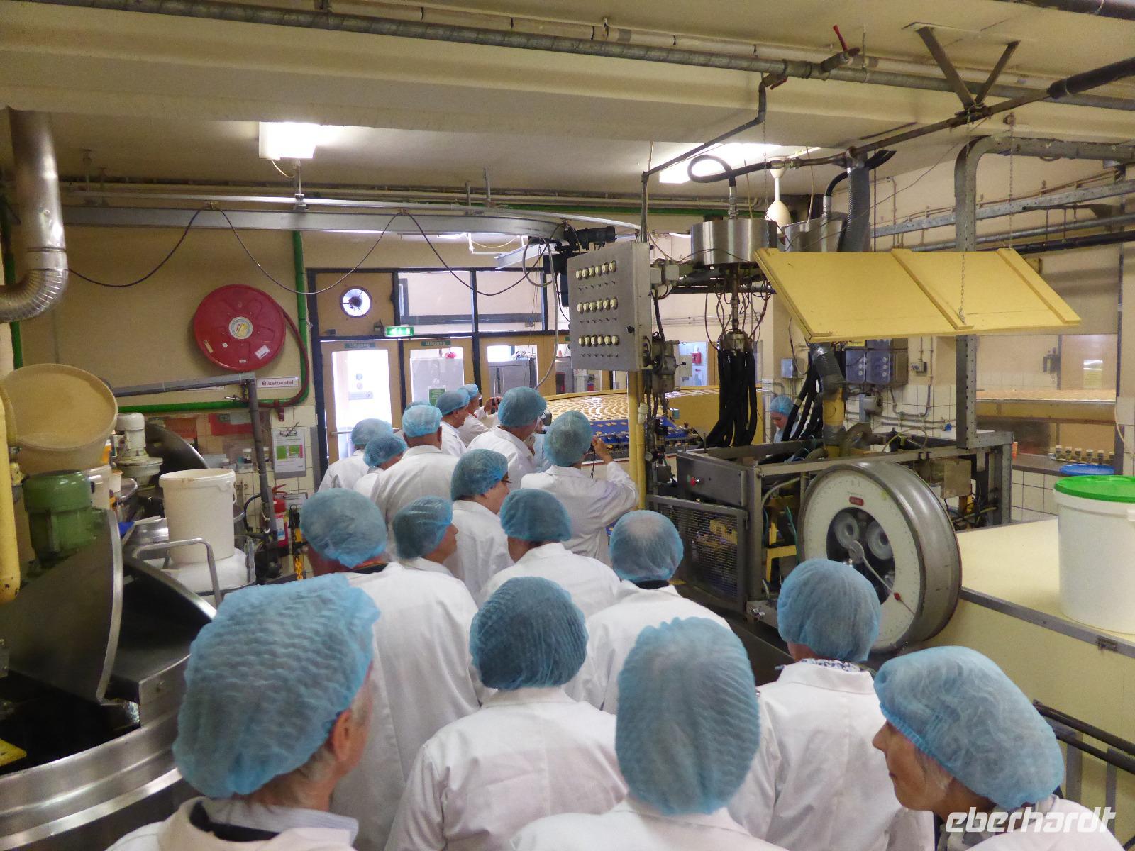Nach der Stadtbesichtigung stand der Besuch der ältesten Sirupwaffelfabrik von Gouda - Punselie´s - auf dem Programm. Bei Kaffee und Sirupwaffeln konnten wir erstmal kurz verschnaufen, bevor es zur Besichtigung der Fabrik ging. Diese Fabrik wurde 1643 gegründet und ist noch heute im Familienbesitz. Zuerst wurden wir „schick" angezogen mit weißem Kittel und Schutzhaube. Anschließend erklärte uns Bob die einzelnen Arbeitsschritte von der Teigherstellung, über das Backen bis hin zum Verpacken. Natürlich konnten wir auch Kosten vom Teig bis hin zur Waffel.