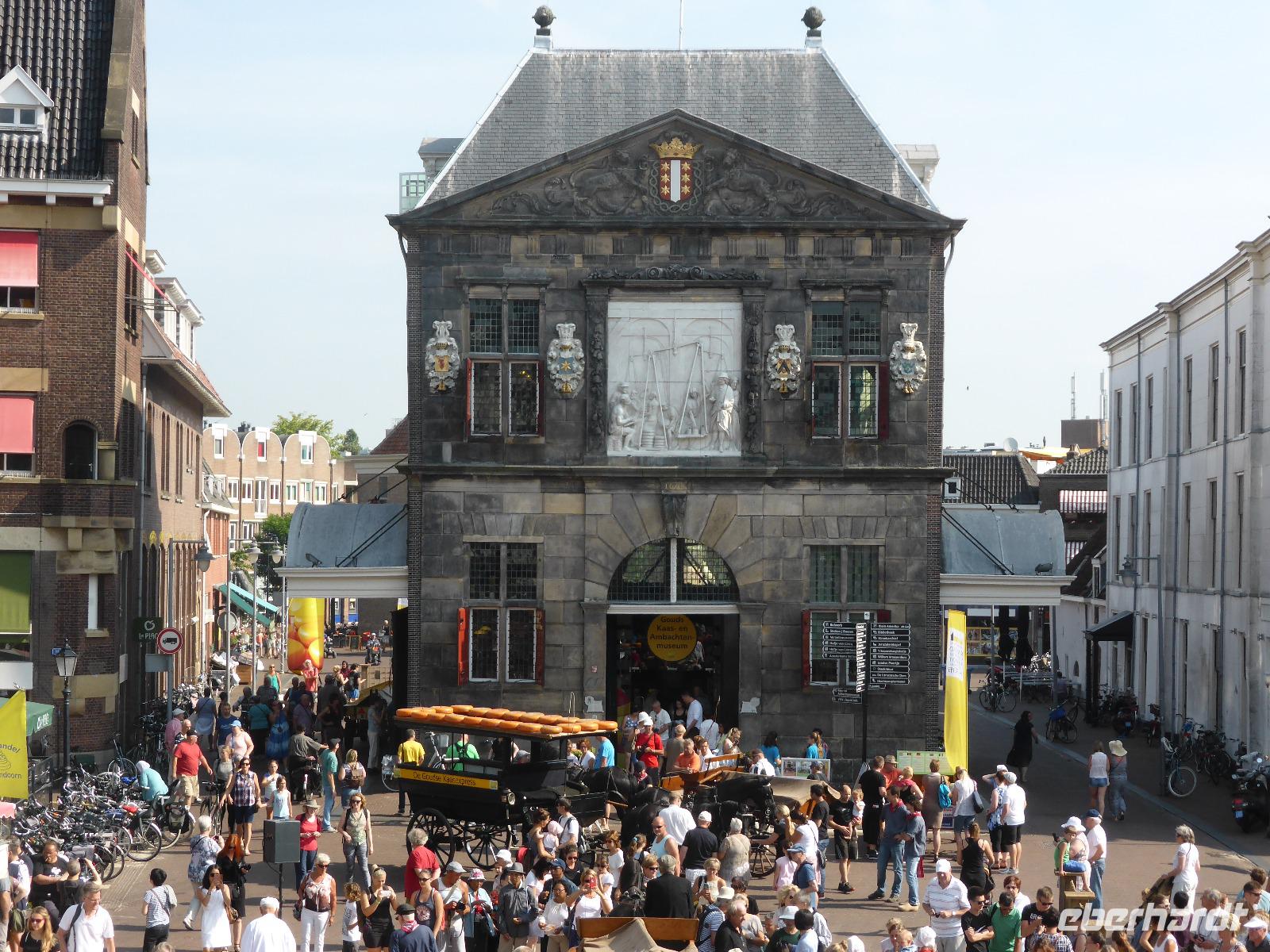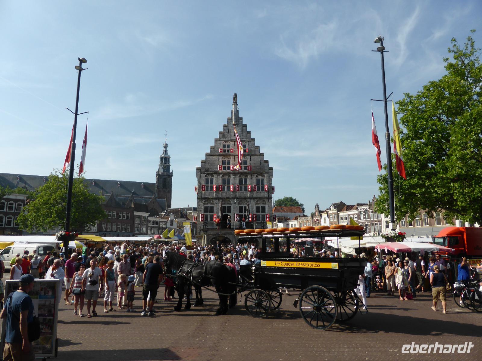 Der heutige Morgen stand ganz im Zeichen des Käsemarktes in Gouda. Pünktlich zur Eröffnung trafen wir am Markt ein. Zwischen Rathaus und Stadtwaage lagen bereits die 10 - 15 kg schweren Käselaibe. Nach dem Einläuten wurde die Qualität geprüft, mit Händeschlägen lautstark zwischen Käsehändler und Bauer gefeilscht und natürlich auch verkauft.