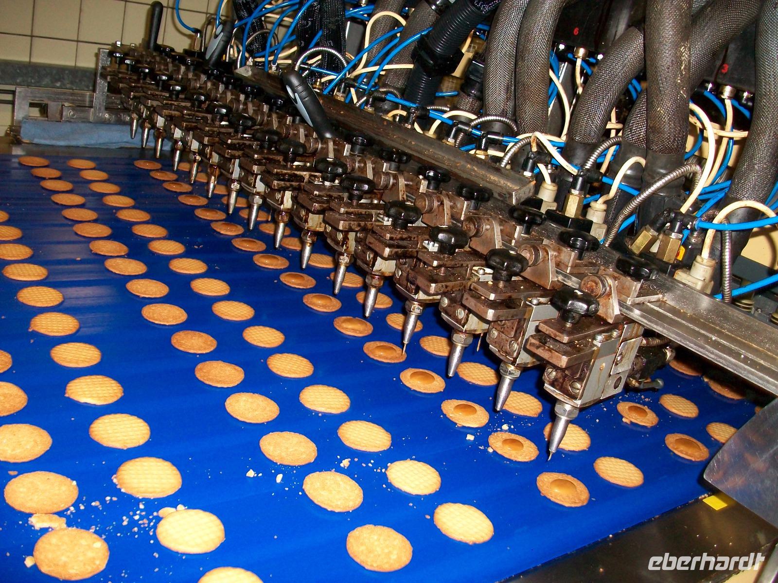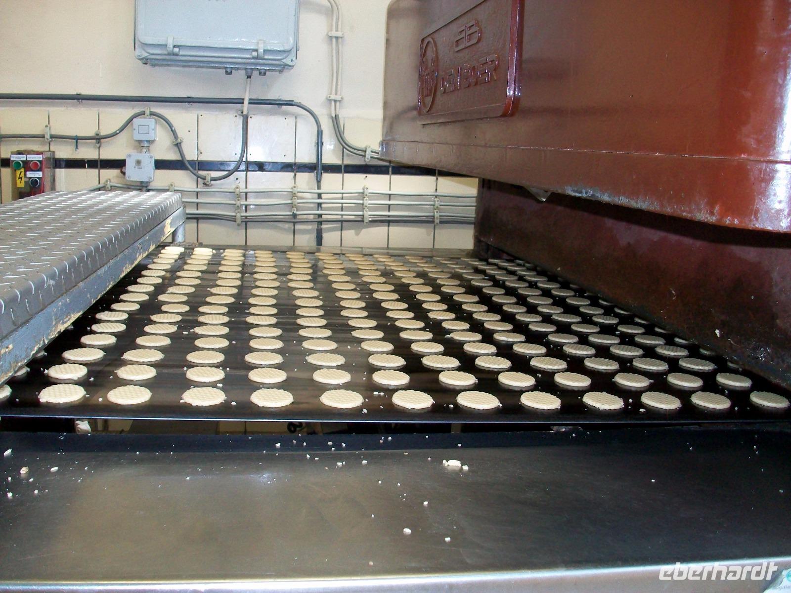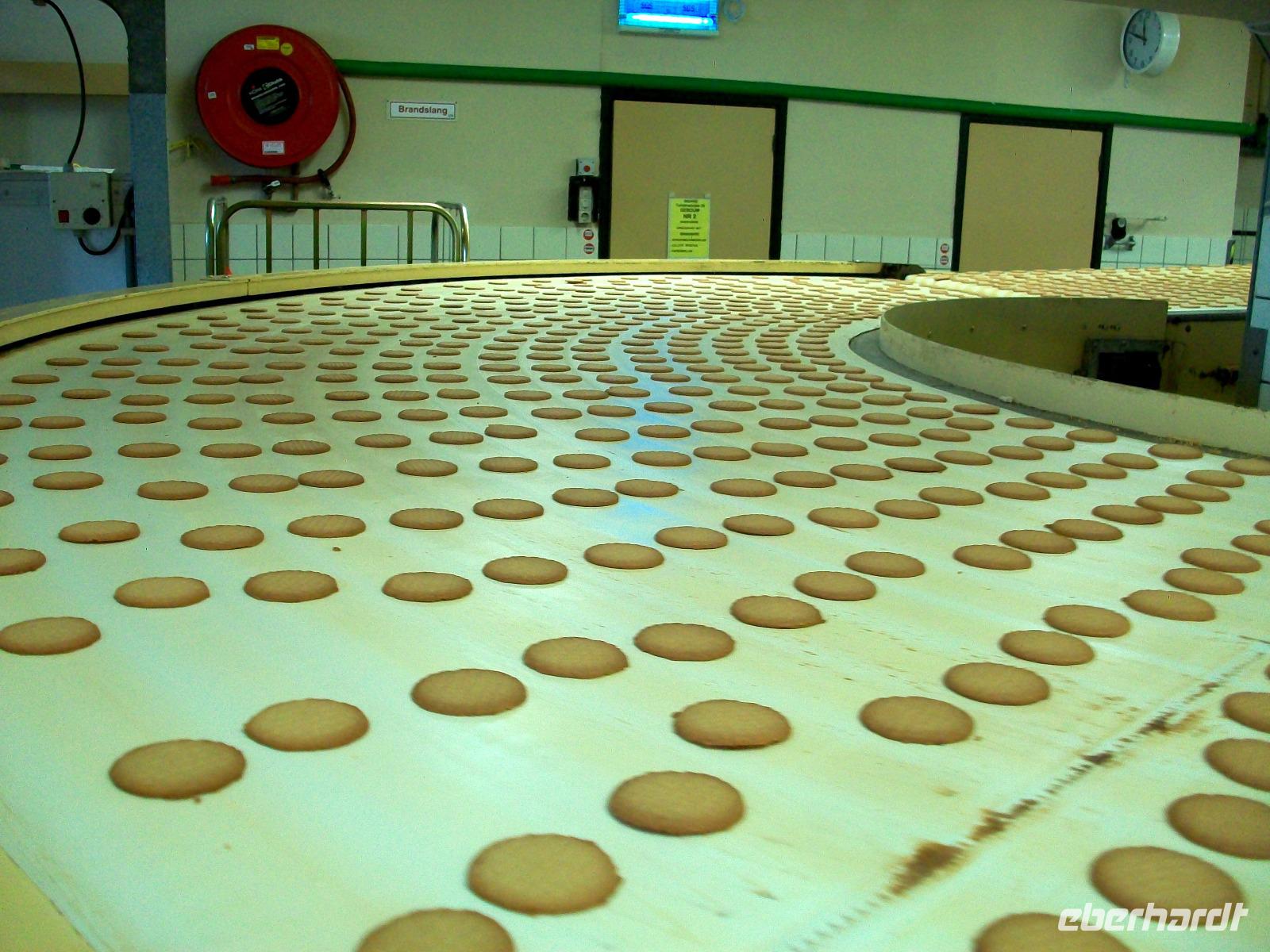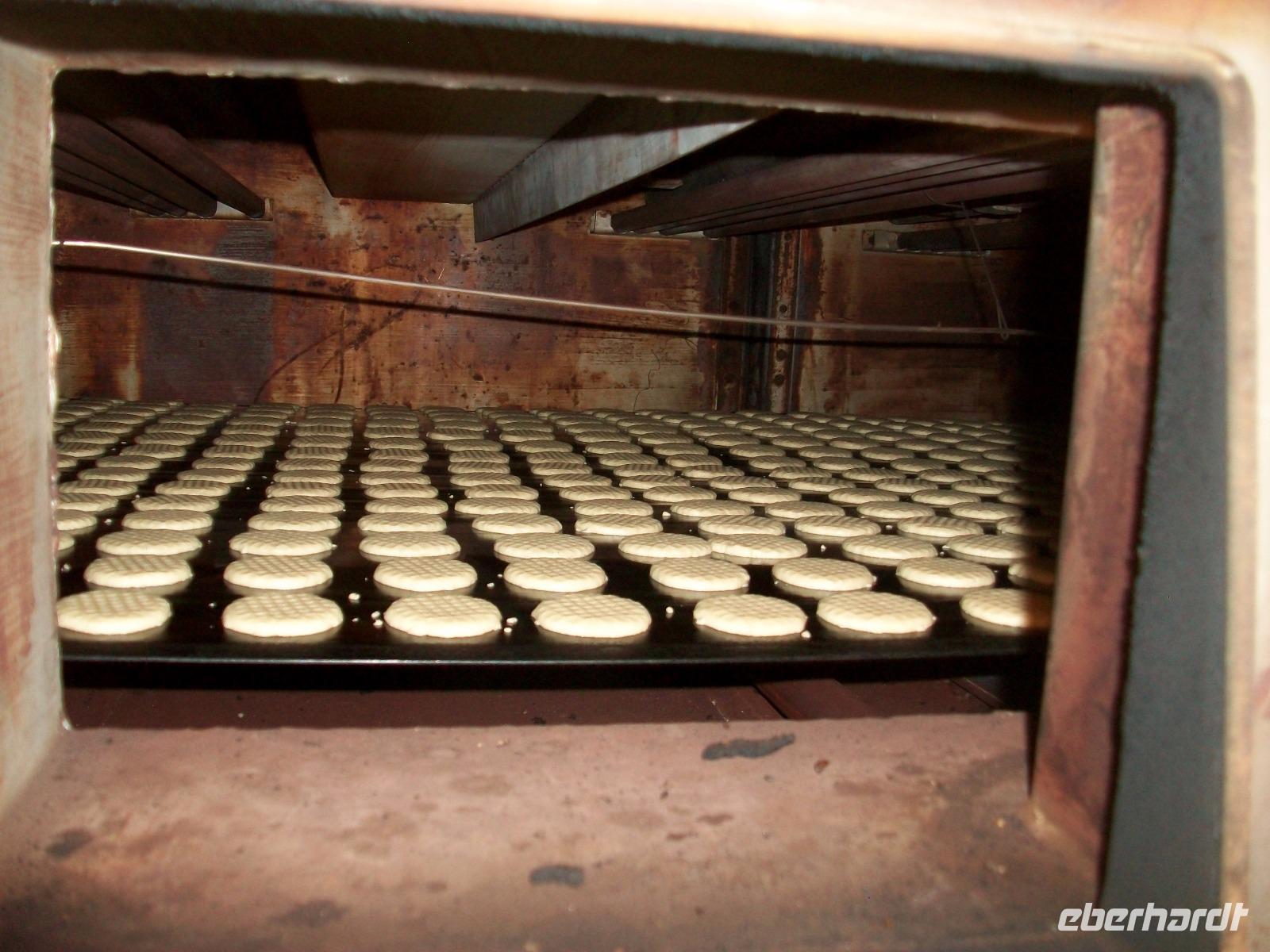 Etwas abseits wird hier eine Spezialität hergestellt: die berühmte Sirupwaffel. Zunächst werden wir zu einer Tasse Kaffee eingeladen und natürlich dürfen wir von dieser süßen Köstlichkeit auch kosten. Dann geht es in den Betreib der die Waffeln herstellt; wir bekommen alle weiße Kittel an und sehen nun aus wie die Bäcker! Auf einer langen Backstraße entsteht die Waffel; erst wird der Teig portioniert, später ausgestanzt, gebacken zum Schluss kommt ein Klecks Karamelsirup, Marke Geheimrezept, darauf. Abschließend wird verpackt - fertig.