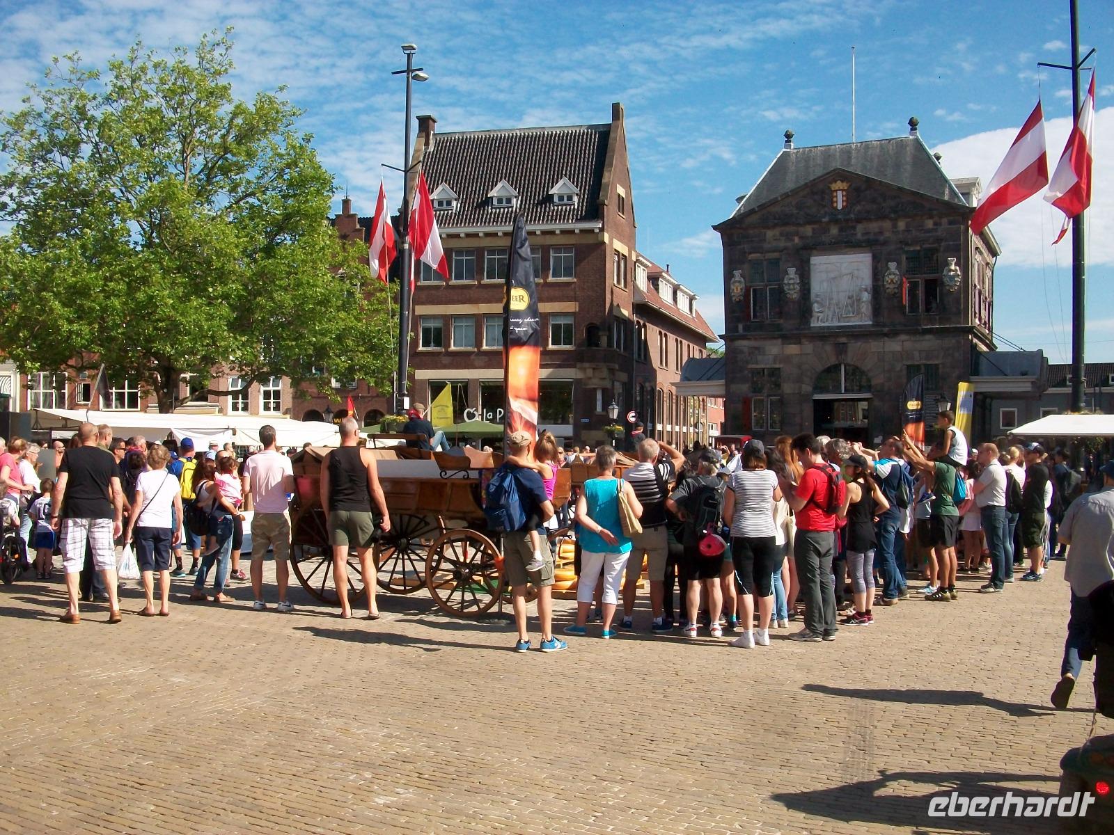 6.7.2017. Als ich am Morgen aus dem Fenster schaue ziehen dichte Nebelschleier über die Grachten der Stadt. Eine Stunde später sind sie verschwunden und die Sonne gewinnt die Oberhand. Heute Vormittag steht ein besonderes Spektakel an, es ist Käsemarkt in der Stadt und das lassen wir uns natürlich nicht entgehen. Gegen zehn beginnt das Schauspiel und wir werden Zeuge wie auf dem Markt große Laibe aus Käse aufgestapelt sind und Anbieter und Kaufleute in historischer Kleidung mit Handschlag den Kauf tätigen. Danach geht es zur Stadtwaage um das genaue Gewicht zu ermitteln; eine interessante Erfahrung die wir in der Käsestadt Gouda machen konnten.
