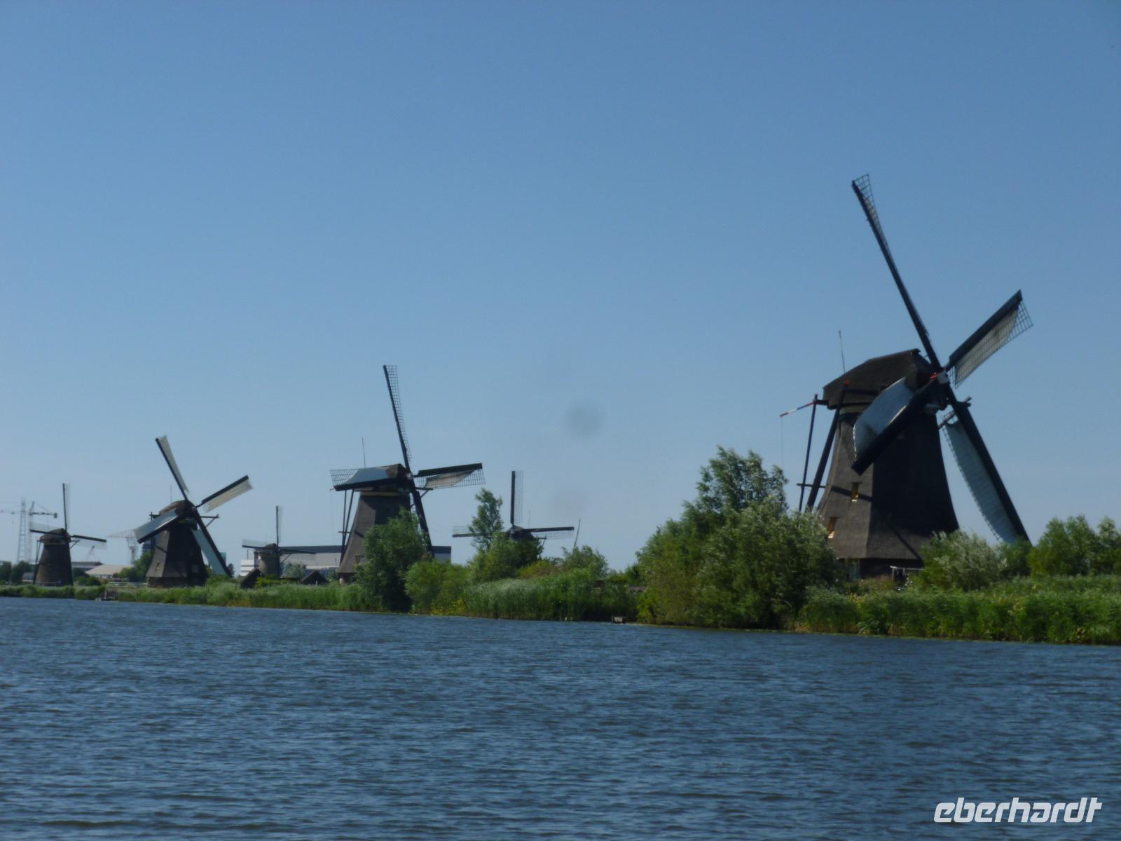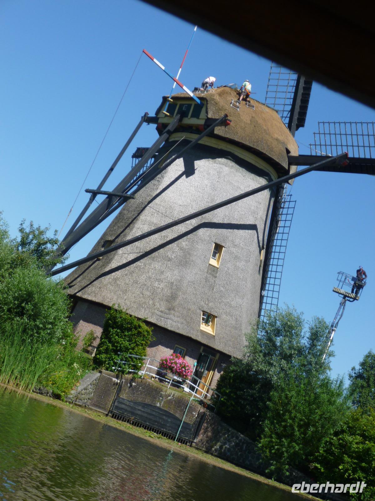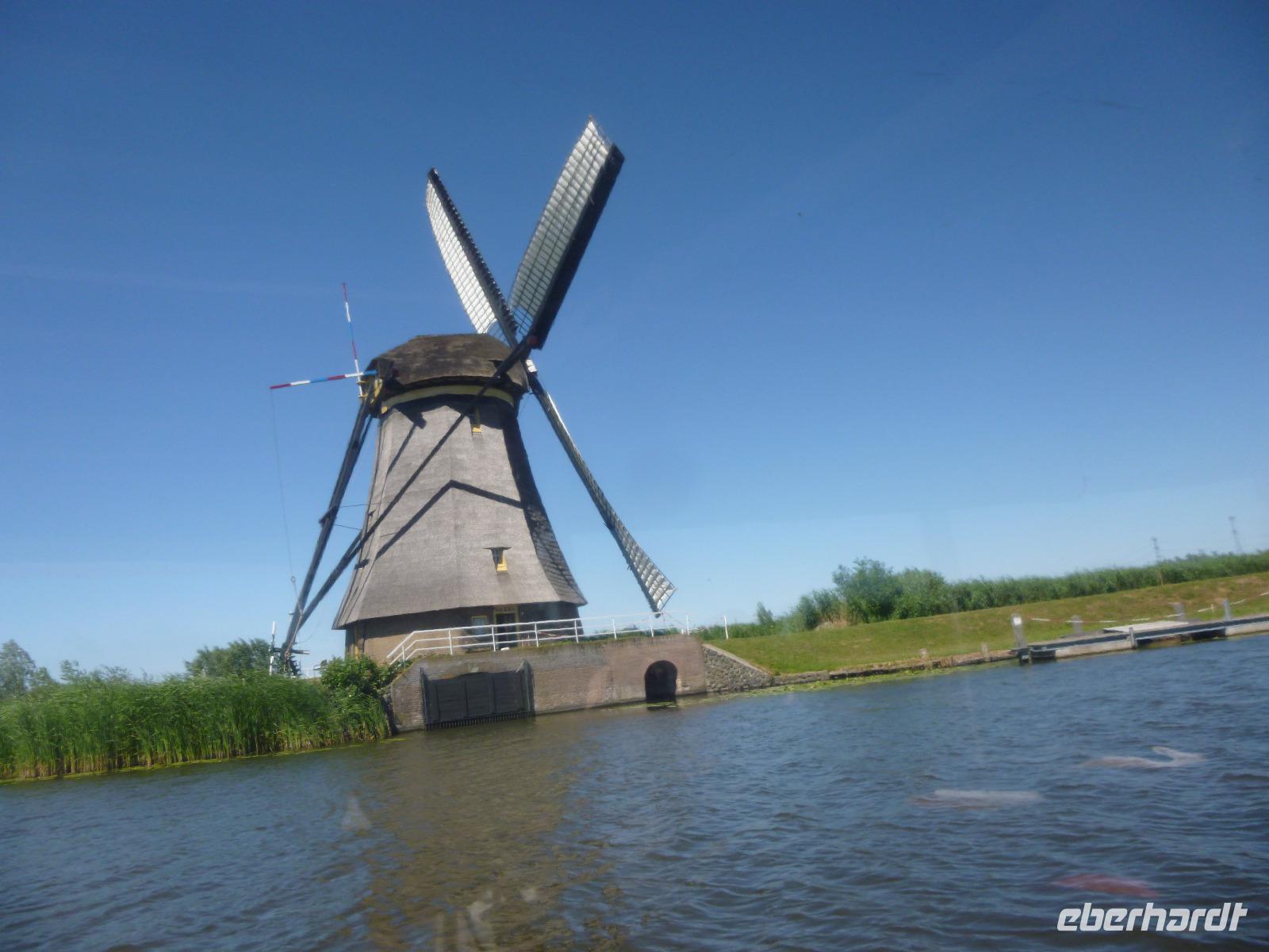 Bei einer Bootsfahrt sahen wir: nur bei der sogenannten „Blokker"-Mühle ist das Schaufelrad außen sichtbar. Auch sind nur die Kappen der Holländermühlen drehbar.