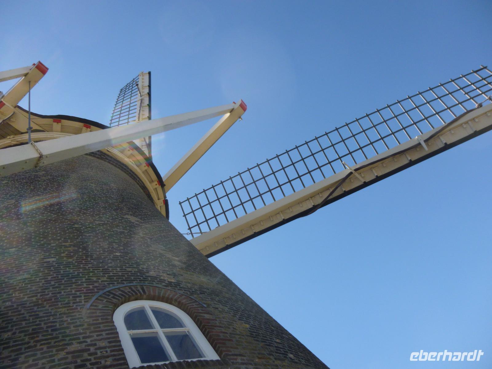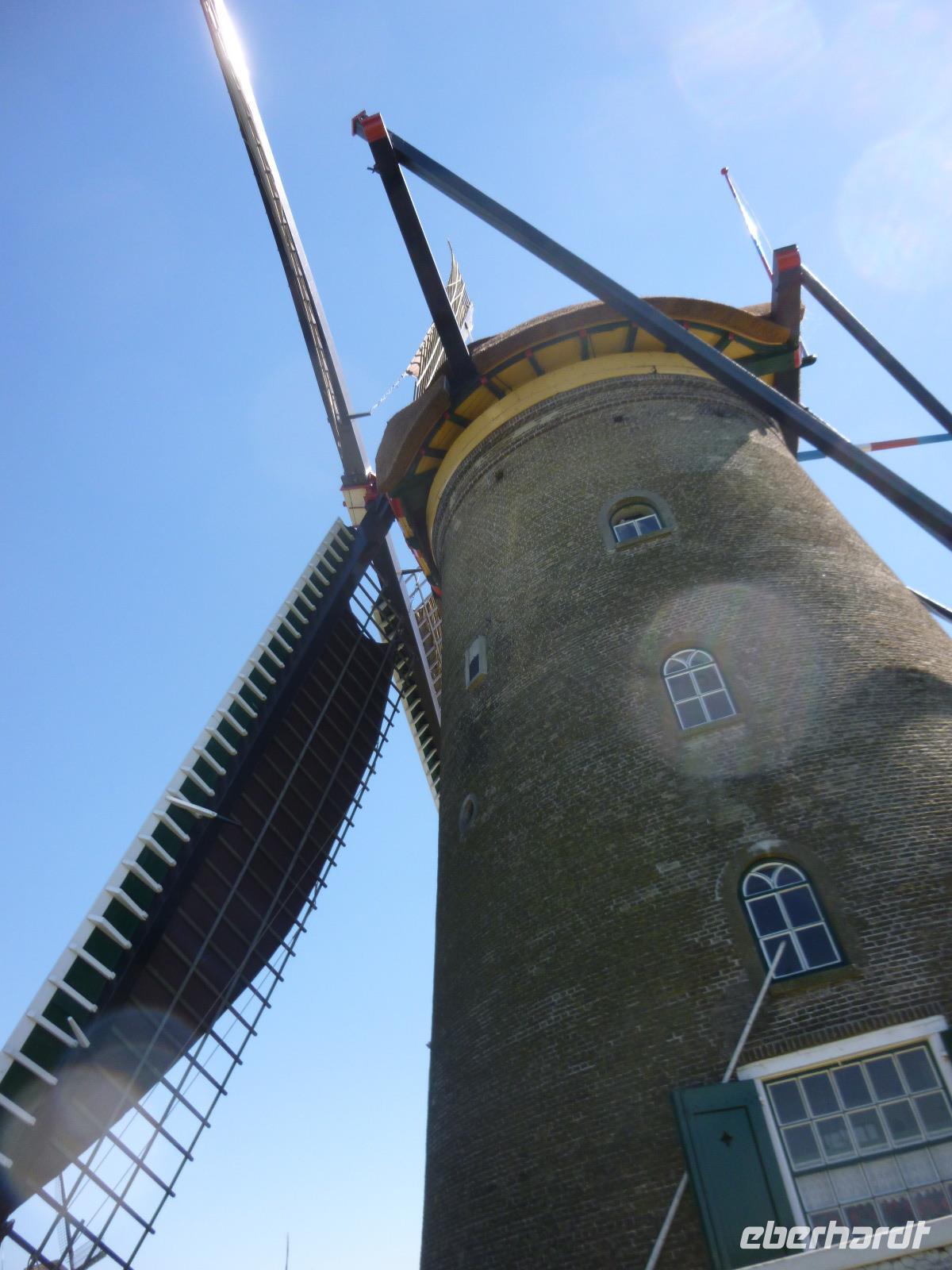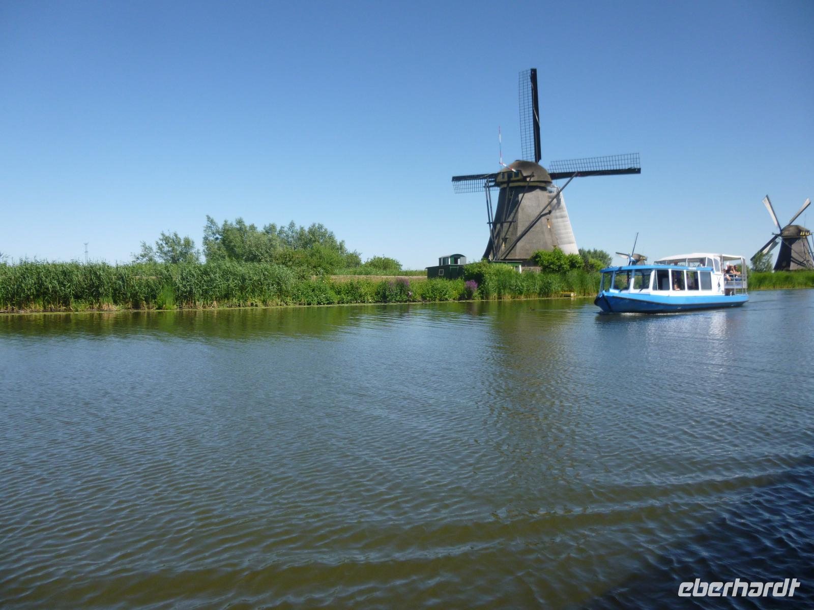 Bei einer Bootsfahrt sahen wir: nur bei der sogenannten „Blokker"-Mühle ist das Schaufelrad außen sichtbar. Auch sind nur die Kappen der Holländermühlen drehbar.