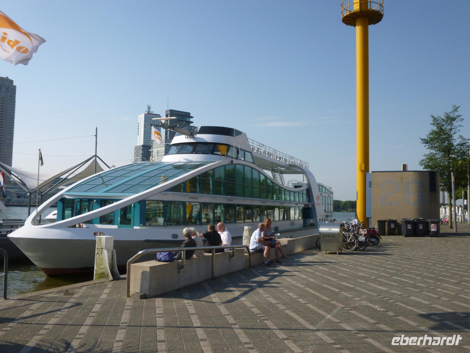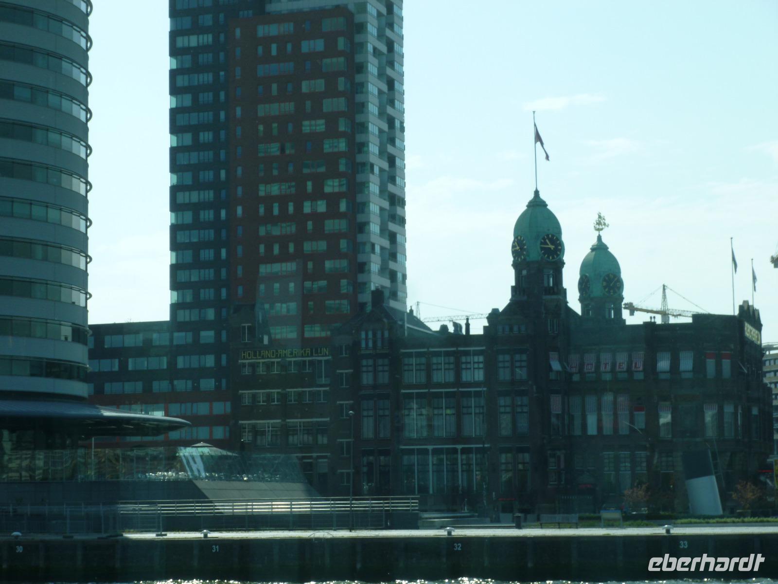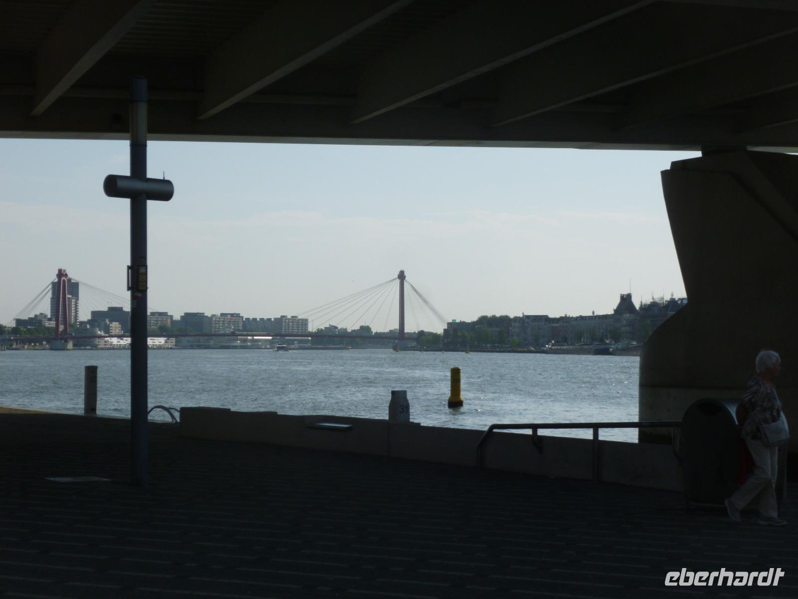 Rotterdam war nach dem zweiten Weltkrieg komplett zerstört: von unserem Spido-Schiff sahen wir deshalb rings um die Erasmusbrücke moderne Bauten. Einige davon sind berühmt, wie die Kubus-Häuser von Blom im entfernteren Overblaak, an denen wir vorher entlang fuhren.