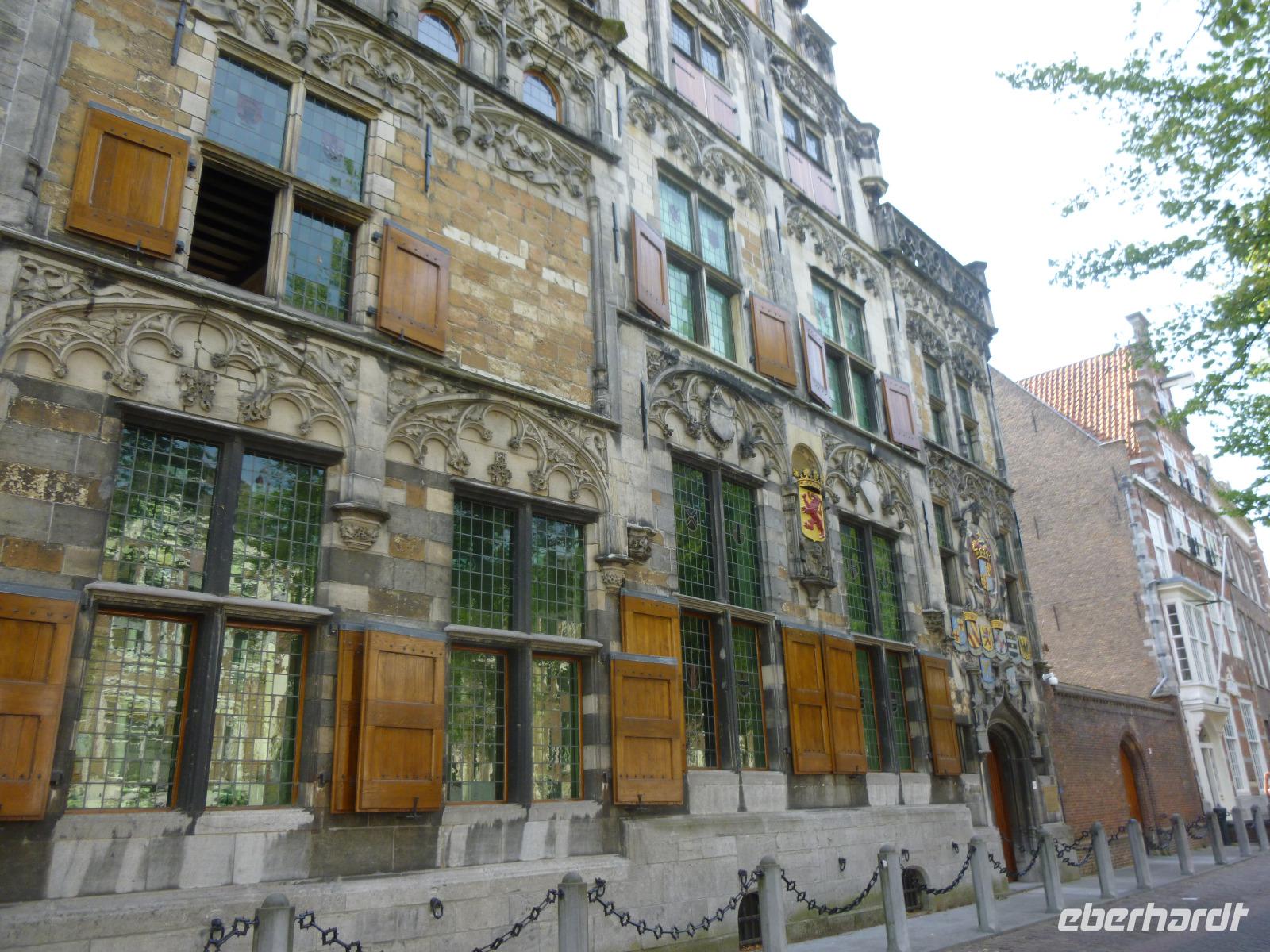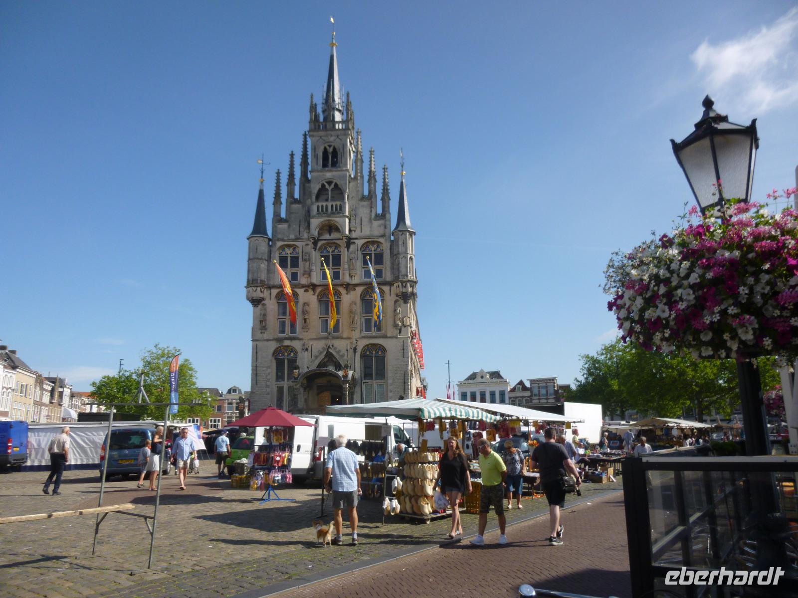 Der Name Gouda steht heutzutage als Synonym für den Käse und die Stadt - schicksalshaft sind beide verbunden. Besonders bekannt ist der traditionelle Käsemarkt am Donnerstag auf dem Markt, wo einst der Käse gewogen wurde sowie im alten Waaghaus der Stadt (heute Museum) zu sehen ist. Für uns war auch das historische Rathaus mit dem Glockenspiel (Überreichung der Stadtrechte) und die St. Janskerk aus dem 15./16. Jahrhundert mit ihren herrlichen Kirchenglasfenstern am Markt sehenswert, bevor wir die bekannte traditionelle Sirupwaffelmanufaktur Punselie besuchten: informativ und lecker!