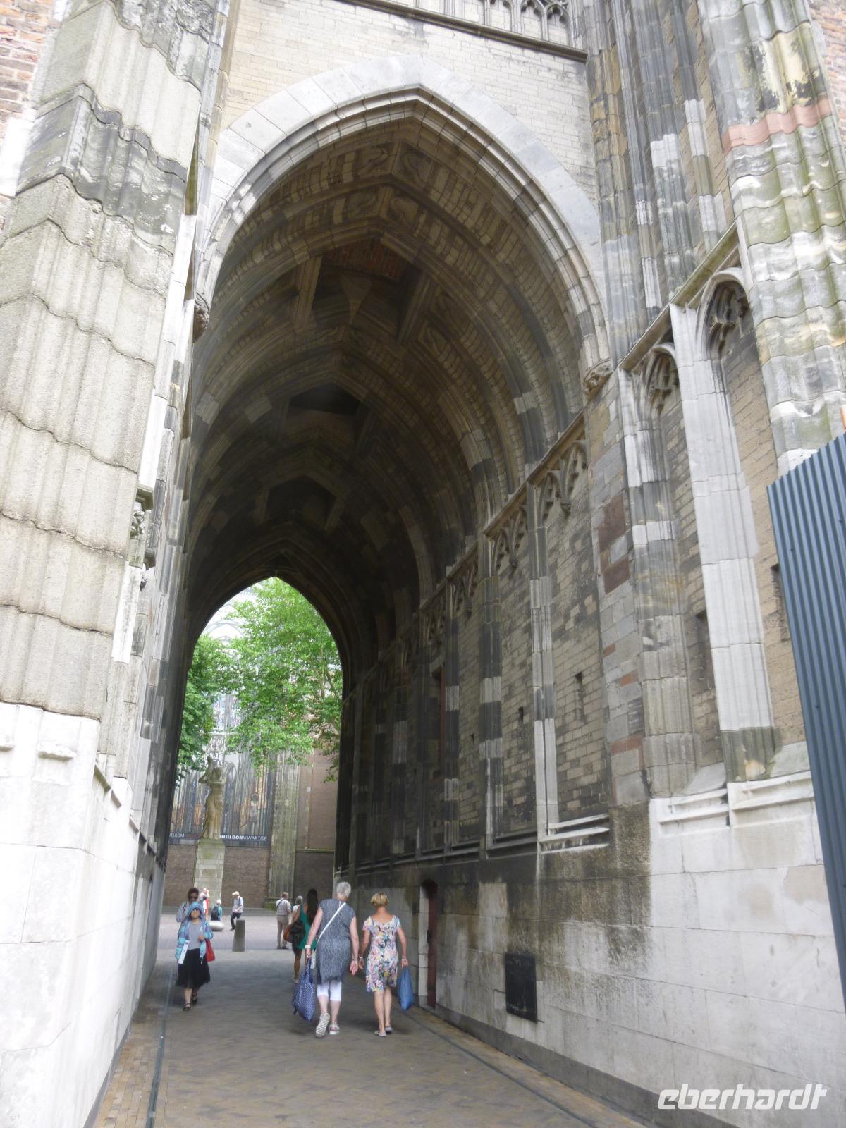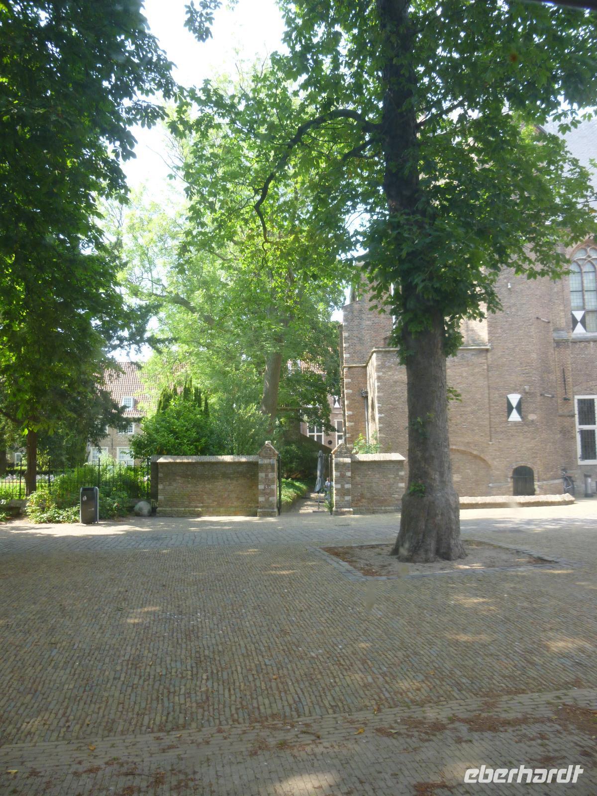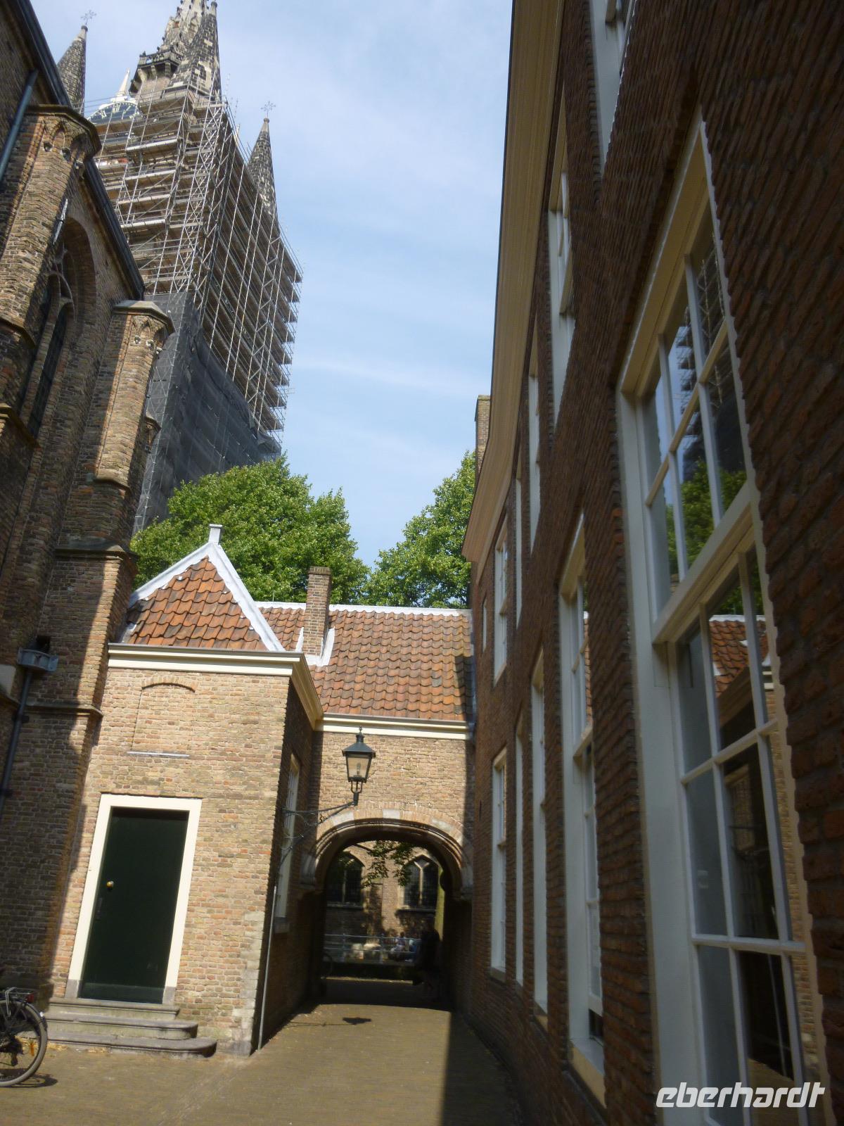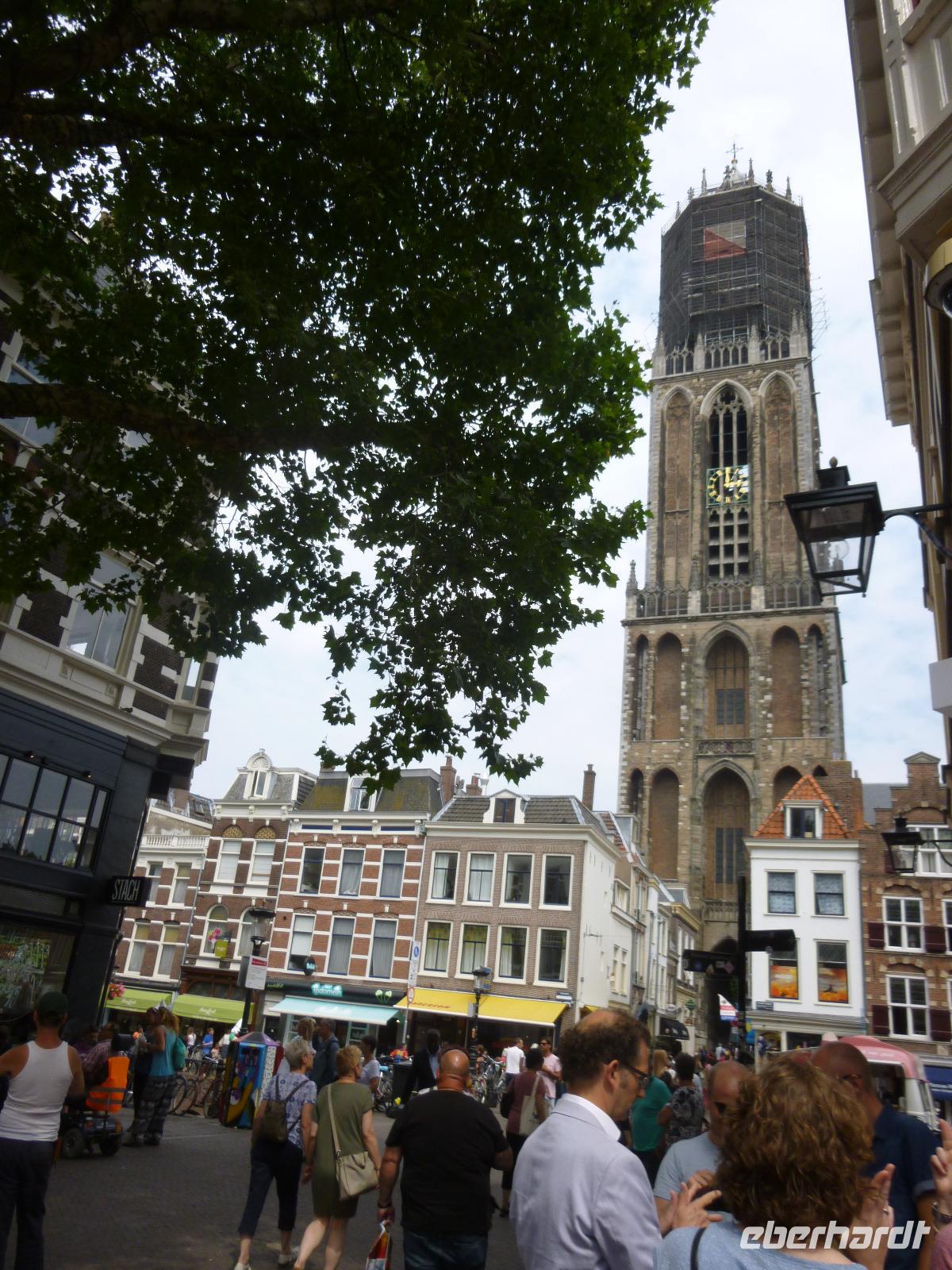Zum Domplatz Utrecht gelangten wir über den Mariaplatz und standen staunend vor dem höchsten Kirchturm der Niederlande, nachdem wir zuvor im Amersfoorter Liebfrauenkirchturm bereits den Mittelpunkt der Niederlande entdeckt hatten. Beide sind jetzt nur noch in örtlich geführten Gruppen besteigbar und der Domturm wurde gerade saniert. Wir entdeckten auf unserem Rundgang zahlreiche ältere Strukturen auf dem Domplatzpflaster, darunter auch die des römischen Kastells. Hinter dem Dom könnte man noch in einigen Gasthauskellern die Räume der einstigen Kaiserpgfalz entdecken, denn zwei deutsche Kaiser (Konrad II. und Heinrich IV.) starben dort und ihre Eingeweide wurden im Dom bestattet (die Knochen im Dom zu Speyer).