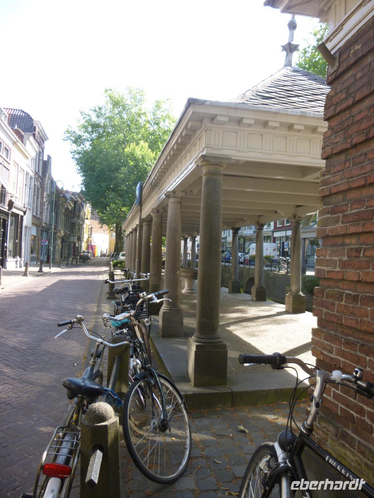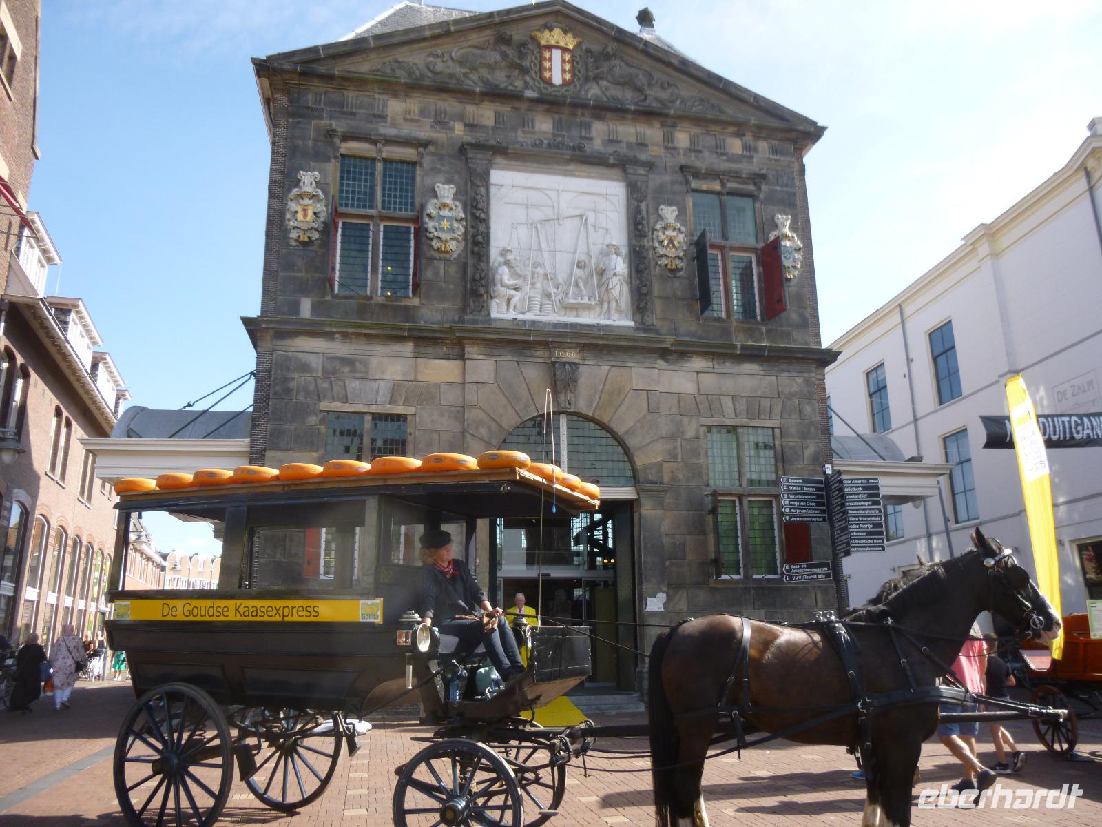 Gelegen im fruchtbaren Polderland an der Gouwe, entwickelte sich ab 17. Jahrhundert die Käseproduktion, die Tuchherstellung ersetzend. Auf dem Goudaer Käsemarkt entdeckten wir bis zu 40 kg schwere Laibe, die von Käseträgern in alten Gildetrachten auf hölzernen Traggestellen über den Platz transportiert wurden. Nach lautstarkem Feilschen fanden sie dann ihre Besitzer. Während wir den Käse im Waaghaus verkosteten, wurden die Käselaibe dort gewogen nach alter Art. Ein Film informierte uns noch über die Herstellungsprozeß, bevor es wieder weiter ging in die alte Universitätsstadt Leiden.