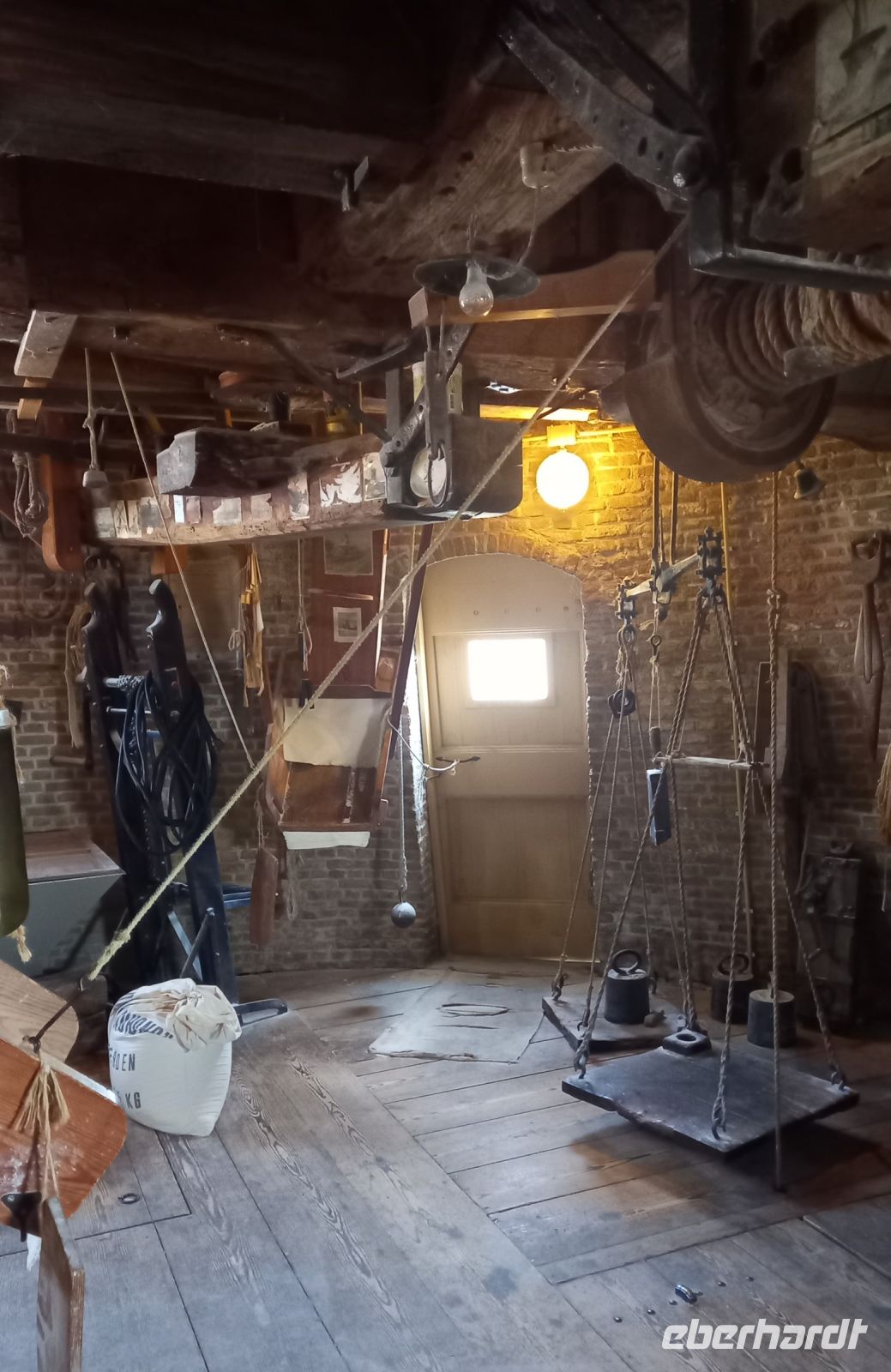 Nachdem alle noch ein wenig im Shop des Lagers eingekauft hatten, führte uns der Inhaber der Manufaktur noch durch die Stadt zum nächsten Programmpunkt: Die Besichtigung der über 200 Jahre alten Getreidemühle „Windhond“. Auf steilen Stiegen kletterten wir bis in die Spitze der Mühle und waren von der uralten, aber immer noch gut funktionierenden Getreidemahltechnik beeindruckt.