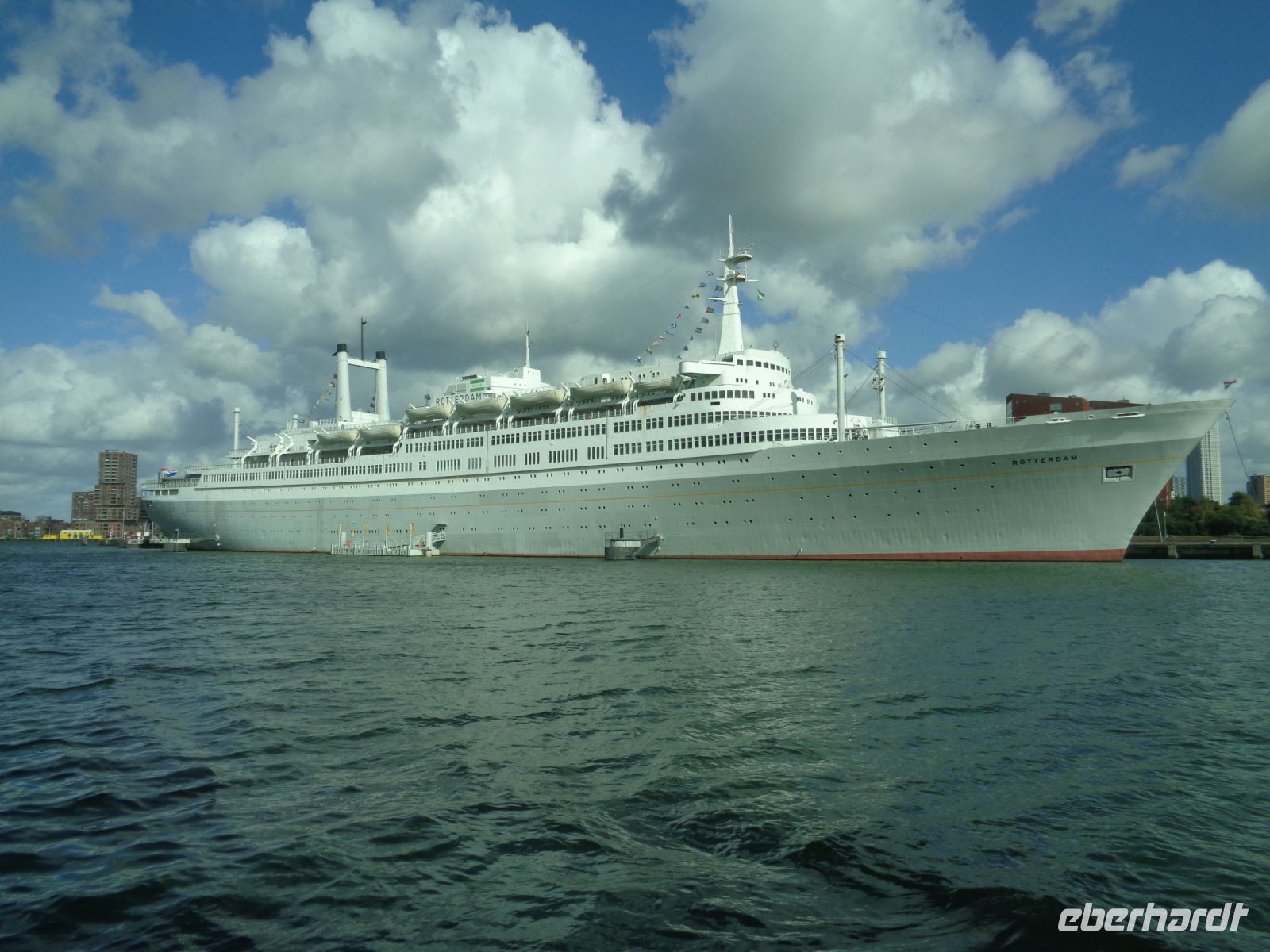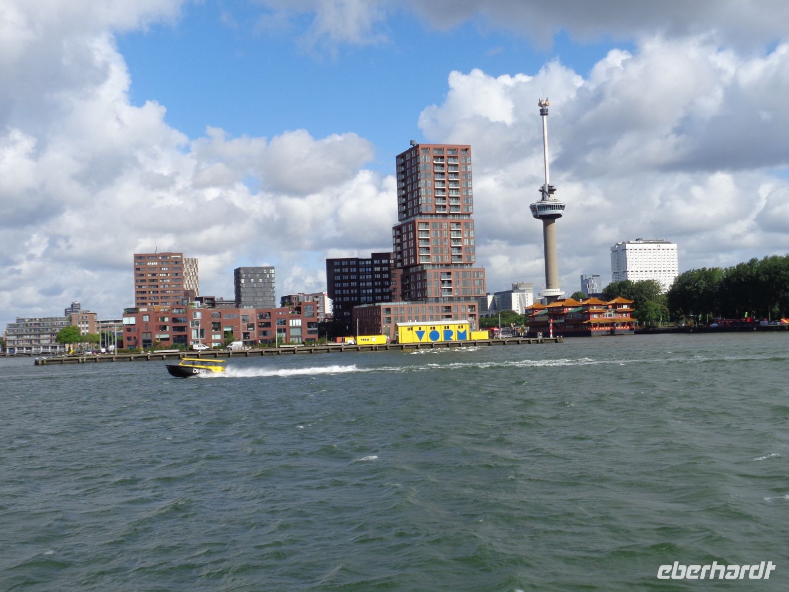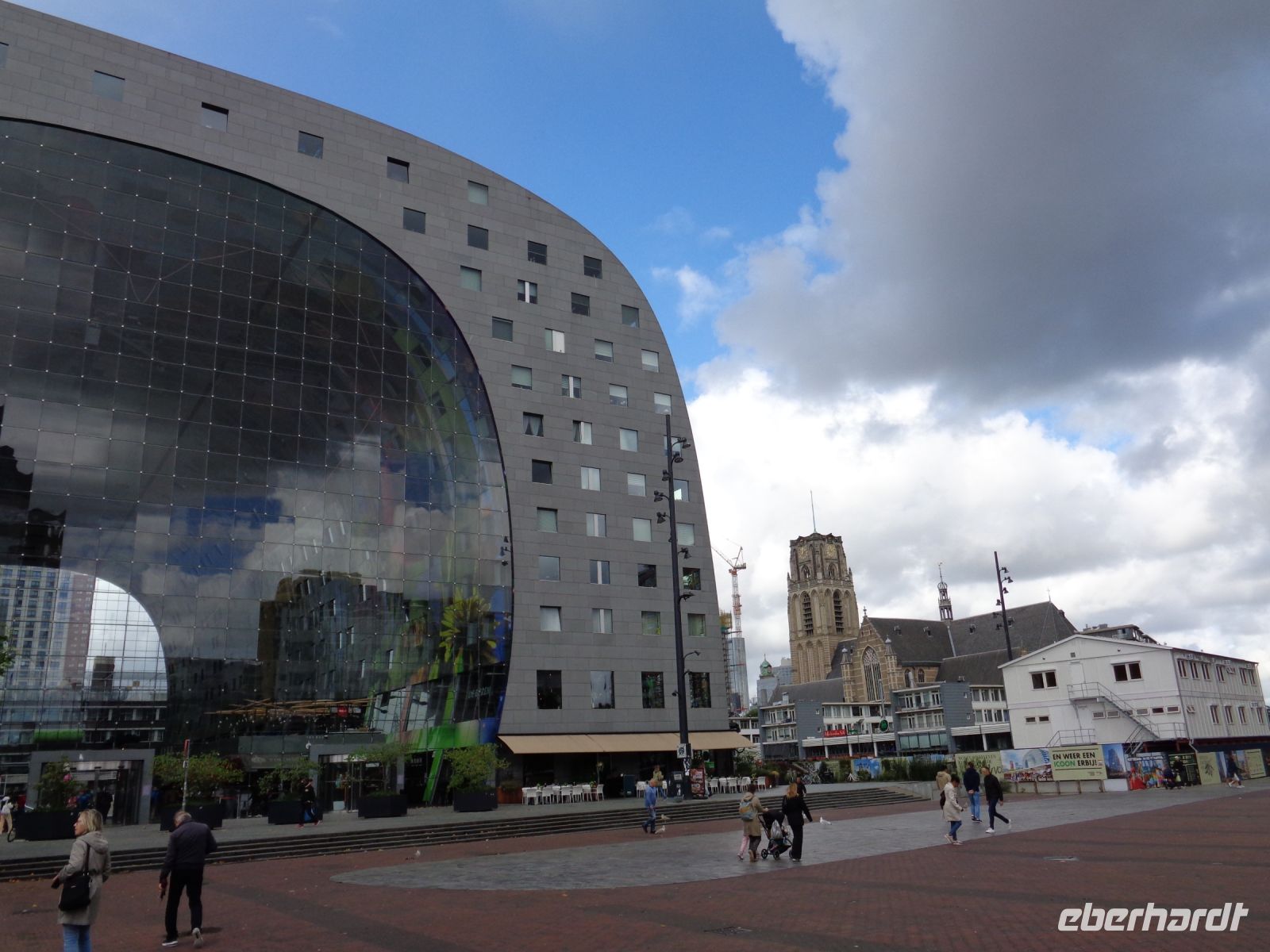An Gouda vorbei geht es heute nach Rotterdam, denn die traditionsreiche Hafenrundfahrt durch den größten europäischen Seehafen darf auch bei dieser Reise nicht fehlen. Seit über 100 Jahren zeigt die Firma „Spido“ mit ihren Schiffen Touristen und Einheimischen auf verschiedenen Touren den sich ständig verändernden Hafen entlang der Nieuwe Maas. Wir sehen die Jenever-Brennerei von Schiedam, eines deren Produkte wir bereits nach dem sättigenden Pfannkuchen gekostet haben, die Kühlhäuser im Eemhaven und die Containerschiffe am Quai des Prinsess-Margriet-Hafens. Das auf mobile Schwimmkräne spezialisierte Wasserbauunternehmen HEBO löscht aus China angekommene Binnenschiffkaskos. Der Handel scheint wieder in Schwung gekommen zu sein. Zurück an Land schauen wir uns das im zweiten Weltkrieg vollkommen zerstörte und komplett neu aufgebaute Stadtzentrum an, mit seiner Markthalle, dem Hochhaus in Bleistiftform und den Kubus-Häusern. Im Kontrast dazu steht die St.-Laurentius-Kirche als einzig übrig gebliebener Zeuge alter Zeiten.