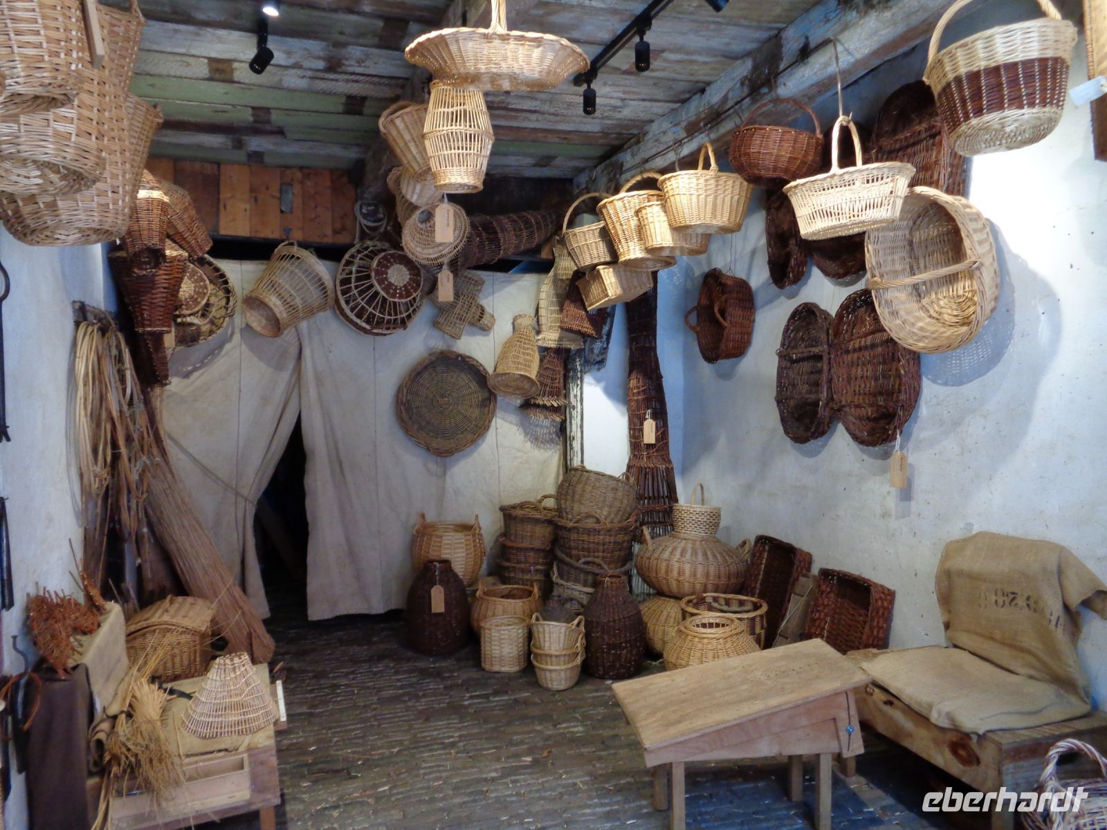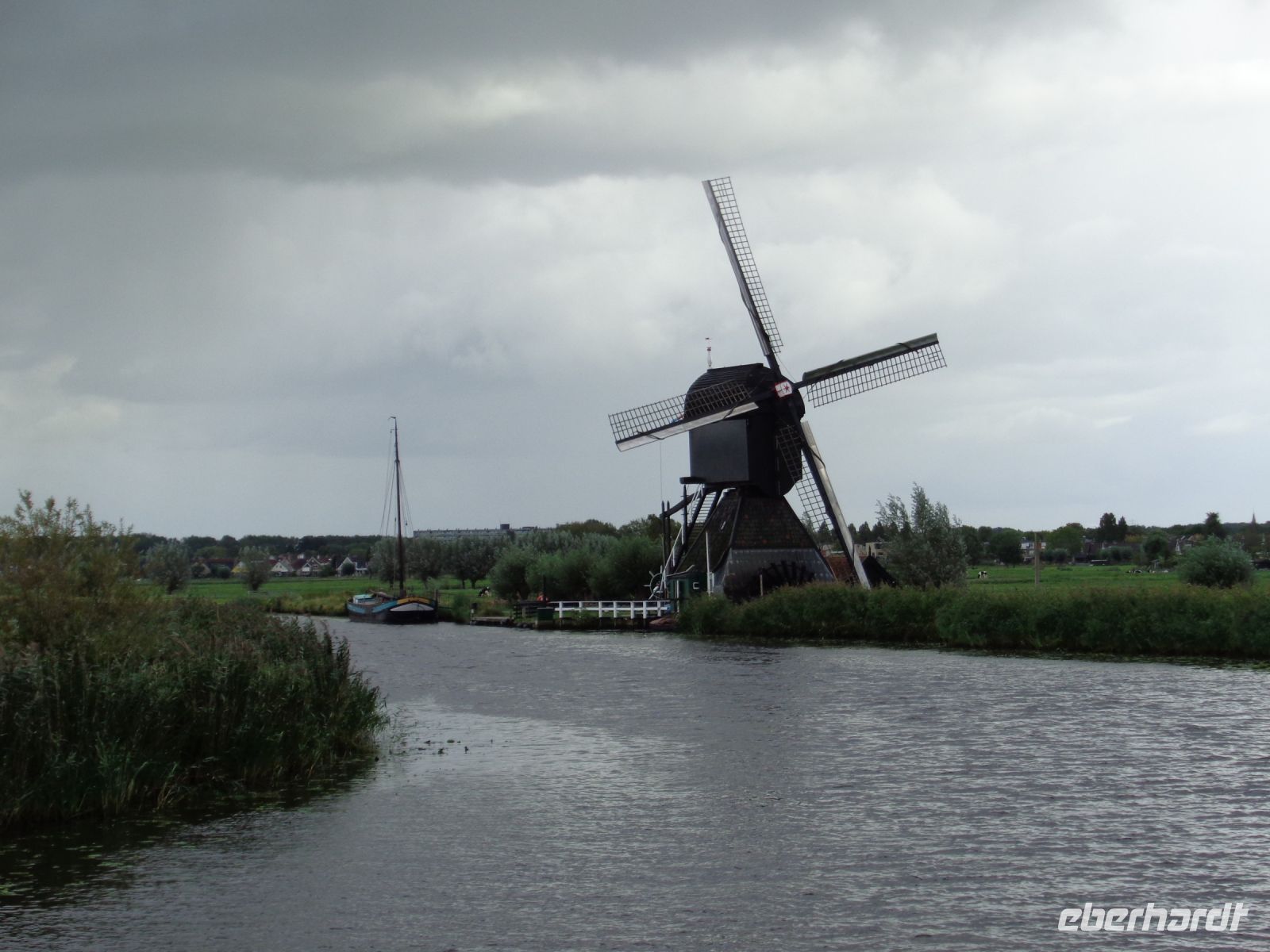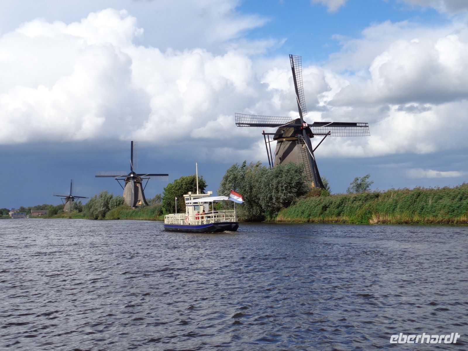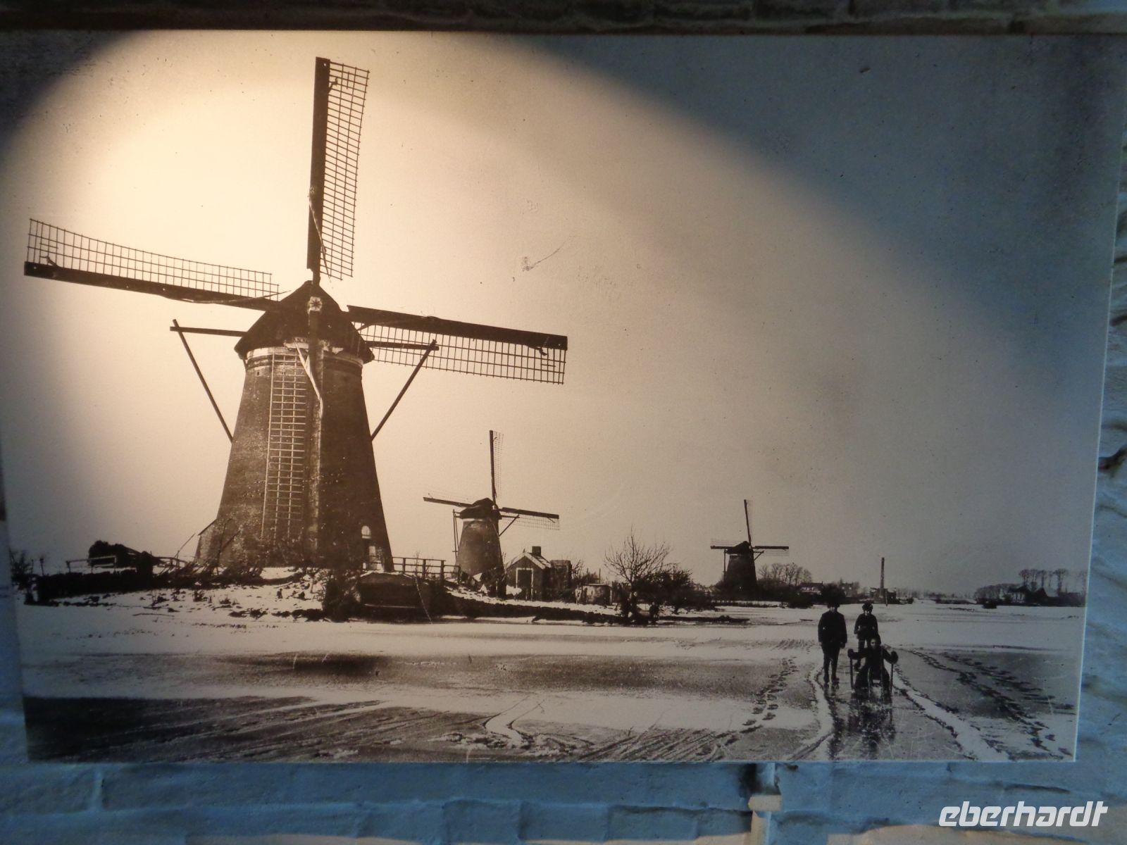 Nachmittags fahren wir nach Kinderdijk und lassen uns die Entstehung der fruchtbaren Polderlandschaft erklären. 19 Windmühlen aus dem 17. und 18 Jh. sind hier erhalten geblieben. Zwar wurden sie im den 1950-er Jahren außer Dienst gestellt, aber sie funktionieren noch alle und könnten im Notfall Wasser aus den Poldern von Ablasserwaard in höher gelegene Kanäle befördern. Heute pumpen das mit Diesel betriebene Pumpwerk J. U. Smit und das elektrische Pumpwerk G. N. Kok das Wasser aus den Poldern in den Rhein. Mit dem Boot fahren wir ganz nahe an den ganzjährig bewohnten Mühlen vorbei. Auf dem Nederwaard stehen die schweren Mühlen aus Stein und auf der Oberwaard die etwas später gebauten, leichteren Mühlen aus Holz mit Rietverkleidung. Zwischen den Mühlen stehen kleine Steinhäuschen, die einst als Küche und Aufenthaltsraum dienten, weil es aufgrund der Brandgefahr auch im Winter nicht erlaubt war in der Mühle ein Feuer zu entfachen. Wie eng die Wohnverhältnisse der Müllerfamilien früher wirklich waren, können wir beim Besuch der fürs Publikum geöffneten Museumsmühle erfahren. Sogar ins Kinderbett dürfen wir uns legen, nur kurz, denn wirklich bequem ist es nicht, im Gegensatz zu unserem Hotelbett, zu dem wir heute beizeiten wieder zurückkehren, denn Kofferpacken ist angesagt.