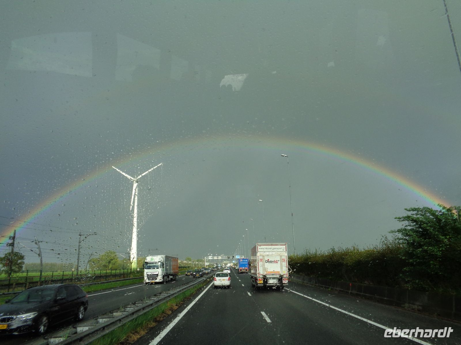 Das Frühstück wird für uns heute extra zeitig gerichtet. Der Weg nach Dresden ist lang und um alle Ausstiegsstationen gemäß Fahrplan anfahren zu können und gleichzeitig genügend Zeit für Pausen zu haben, starten wir unsere Heimreise bereits um acht Uhr. Ein letztes Mal passieren wir das markante, mehrstöckige Autobahnkreuz vor Den Haag, das wir bereits liebevoll Achterbahn nennen. Gefühlt sind wir auf jeder Spur einmal gefahren. Wir winken Delft, Gouda, Woerden sowie Utrecht und erreichen hinter Arnheim wieder deutsches Staatsgebiet. Zwischen Emmerich und Rees ist die Autobahn wegen Bauarbeiten gesperrt und wir müssen auf die Landstraße ausweichen. Aber bald sind wir wieder auf vertrauter Strecke und kommen ohne weitere Verzögerungen durchs Ruhrgebiet nach Kassel. Entlang des sich noch im Bau befindenden Anschlussstücks der A44 fahren wir noch einmal ein Stückchen Landstraße, bevor wir in Eisenach erneut auf die A4 gelangen. In Chemnitz ist Ingos Fahrzeit abgelaufen und Matthias übernimmt wieder das Steuer. Nach einem sonnigen Tag weint jetzt der Himmel, als wäre er mit uns traurig, dass eine schöne, wenn auch von kurzfristigen Änderungen geplagte Reise, zu Ende geht. Wir haben das Beste daraus gemacht und auch das Wetter war fast immer auf unserer Seite. Behalten Sie die Niederlande in guter Erinnerung.