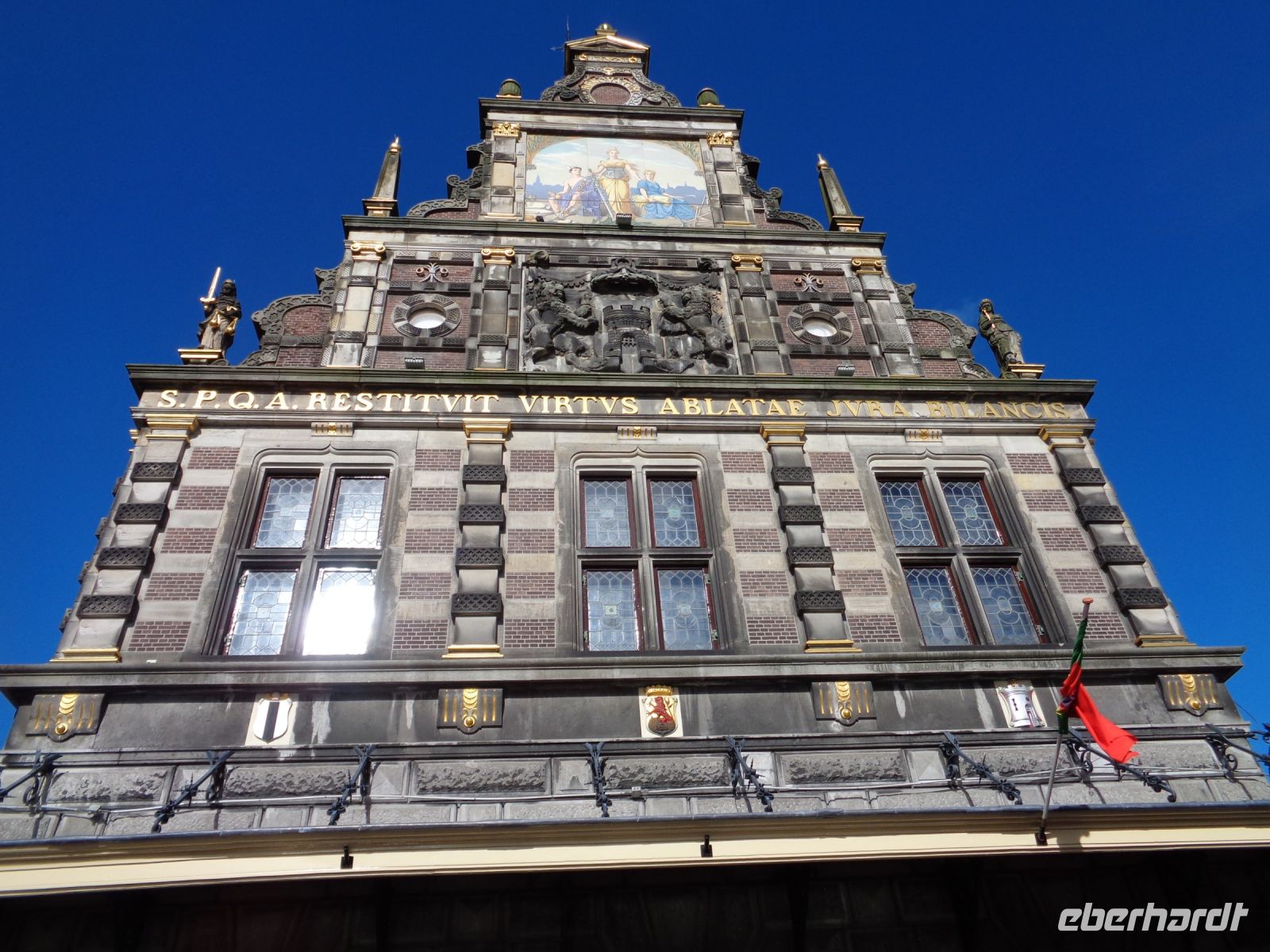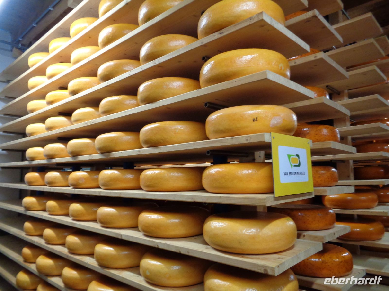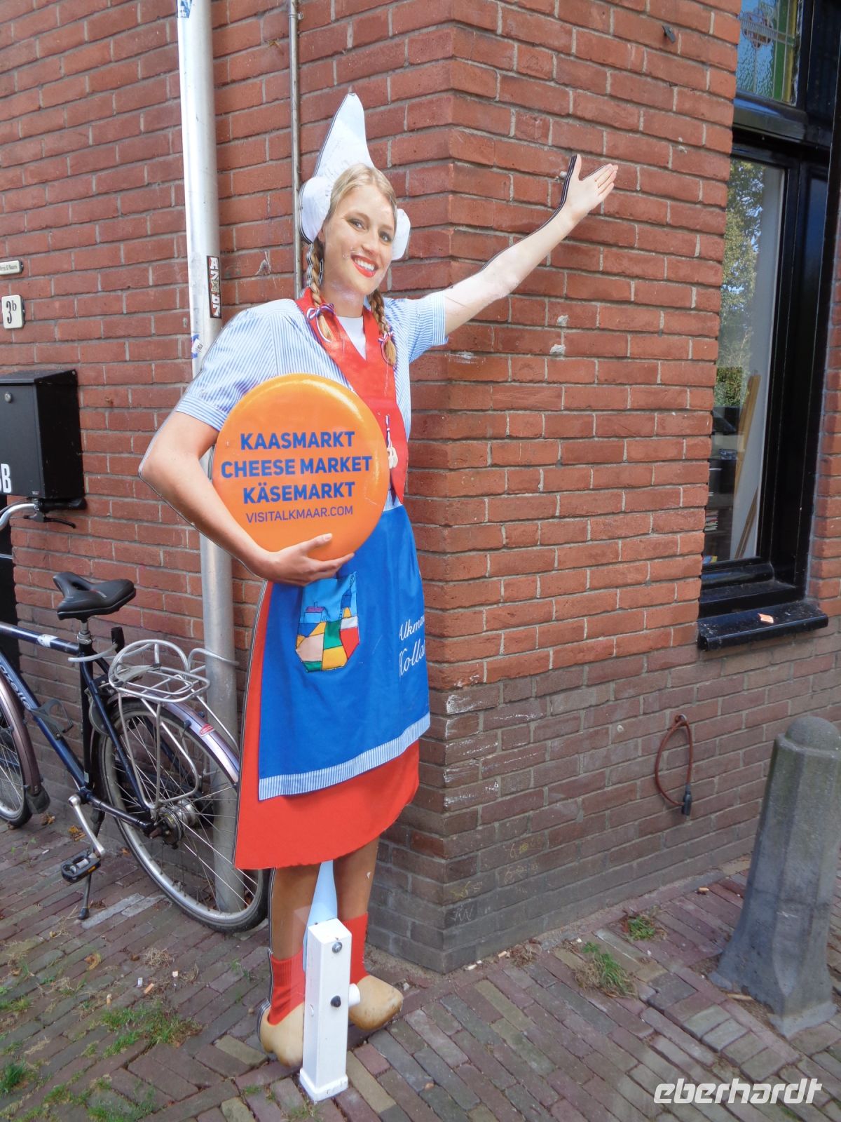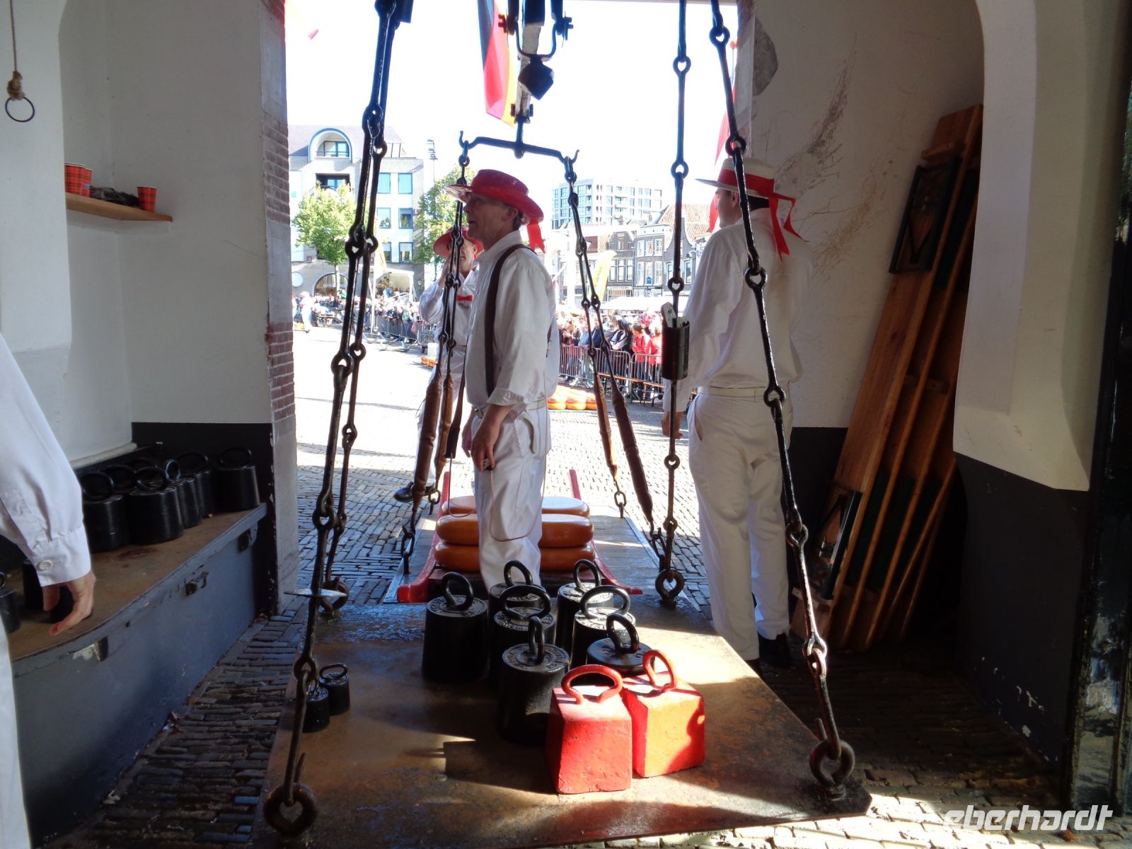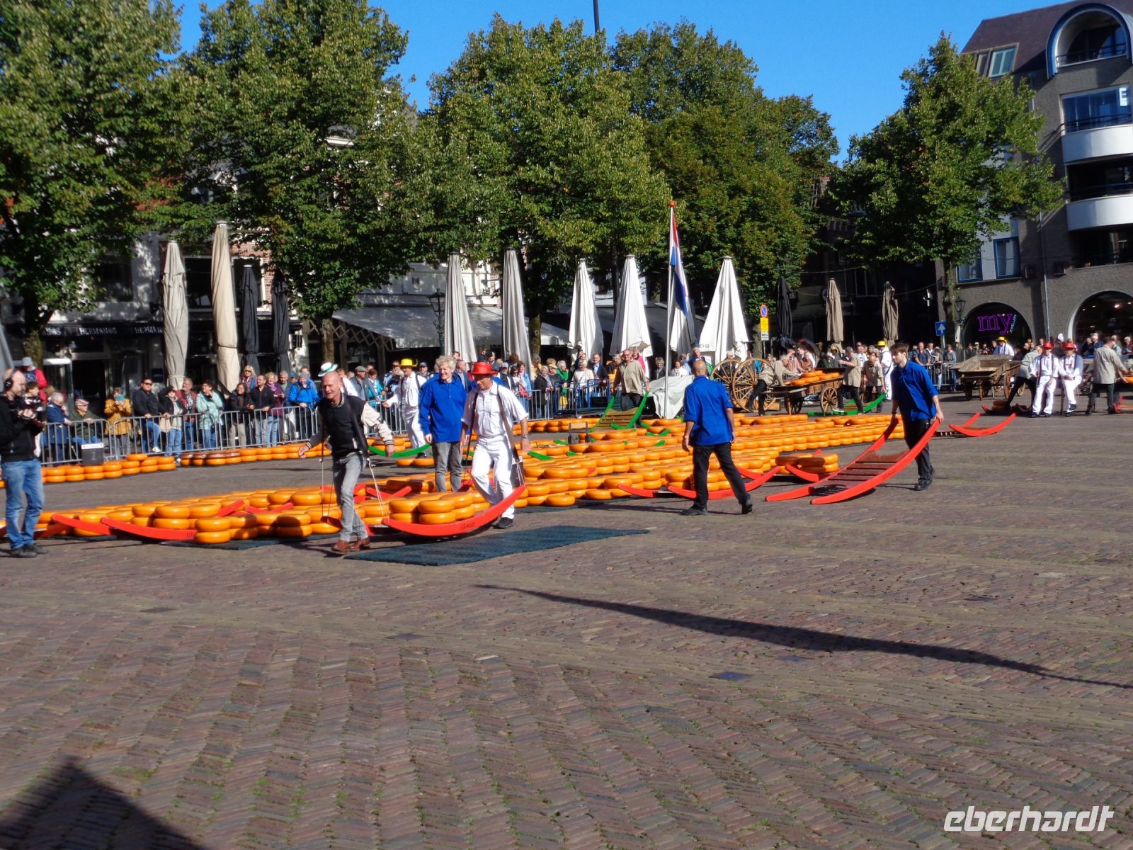 Einen Käsemarkt muss man in den Niederlanden unbedingt erlebt haben und weil im September dieses Spektakel nur noch in Alkmaar stattfindet, fahren wir heute wieder nach Nordholland. Seit 1365 steht in Alkmaar eine Käsewaage und während des Goldenen Zeitalters im 17. Jh. waren es sogar deren vier. 1593 wurde die Gilde der Käseträger gegründet. Bis heute ist der Käsemarkt in Alkmaar der größte des Landes. 2.400 Käselaibe werden von Ende März bis Ende September wöchentlich auf dem Platz vor der Käsewaage aufgestellt. Um 10 Uhr eröffnet das Läuten der Käseglocke den Markt und nachdem die Inspektoren den Käse für gut befunden haben, beginnt das Feilschen um den Preis. Ist man sich einig geworden, folgt auf den Handschlag der Gang zur Waage. Die Käseträger transportieren den Käse zu zweit im „Käseträgerdribbelschritt“ auf speziellen Holztragen. Der „Tasman“ wiegt den Käse und bestimmt den definitiven Preis. Dann wird das „gelbe Gold“ zurück auf den Platz gebracht und von sogenannten „Einwerfern“ zum Weitertransport auf Holzkarren verladen. Alkmaar lädt mit seinen vielfältigen Geschäften zudem zum Bummeln ein und wer gerne auf dem Wasser unterwegs ist, kann auch hier eine Grachtenfahrt buchen. Aber Achtung: Die Brücken sind sehr niedrig. Sich immer wieder bücken ist daher ein Muss.