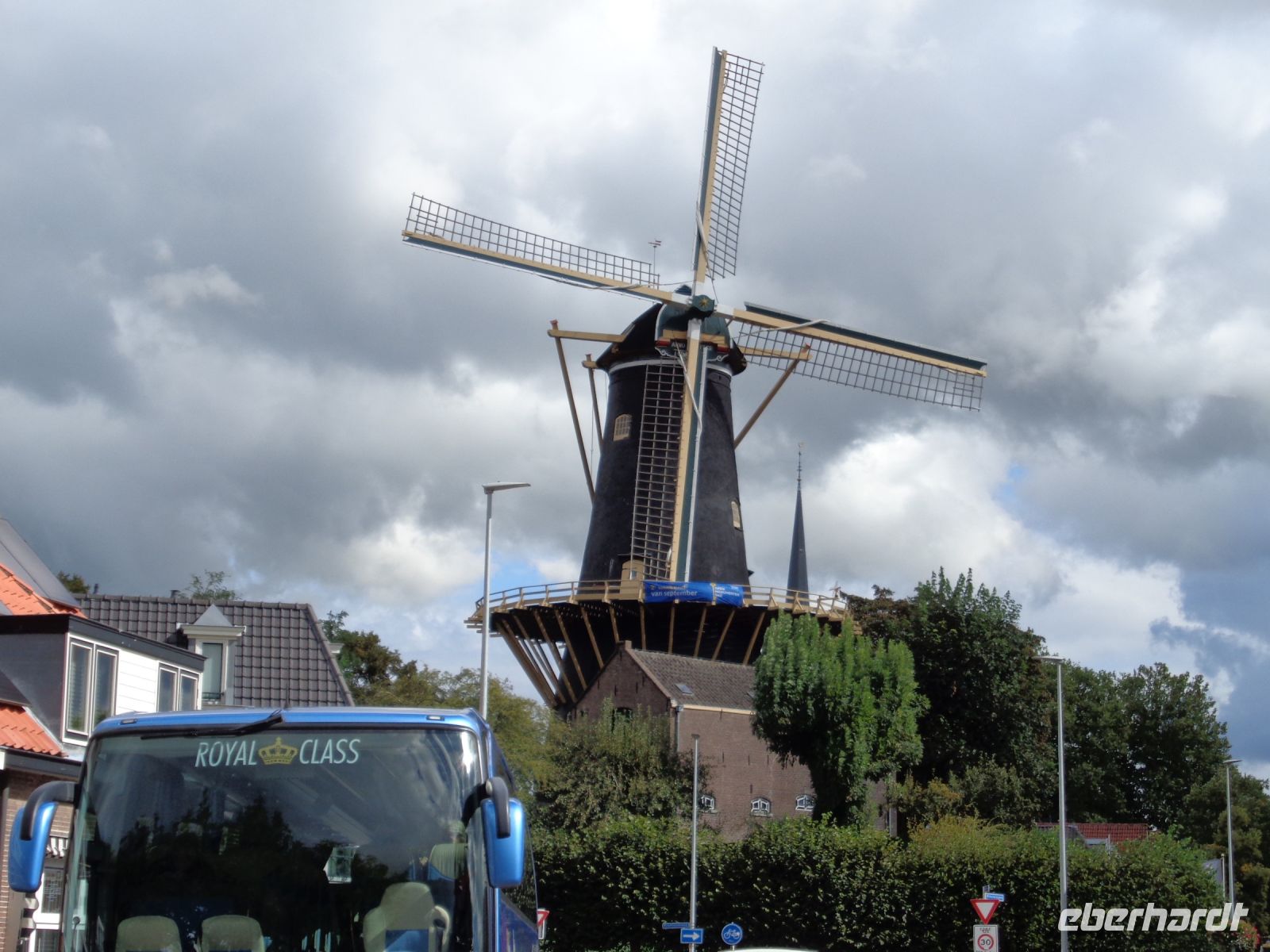 Wir verlassen Mijdrecht und werden heute Abend unser zweites Hotel am Den Hager Nordseestrand von Kijkduin erreichen. Zuerst machen wir aber Halt in Woerden, einer kleinen Festungsstadt am Alten Rhein. Hier im Zentrum des Grünen Herzens der Niederlande trifft die Stadt auf das Landleben. Wir besichtigen das einzige für Besucher zugängliche Käselagerhaus der Niederlande. Gästeführerin Ria erzählt uns alles Wichtige rund um die Herstellung und Lagerung von Käse. Dann spaziert sie mit uns durch die Stadt, zeigt uns am Markt die Käseglocke und lässt uns einen Blick in den Schlosshof werfen. An der Getreidemühle „De Windhond“ übergibt sie die Gruppe an Müller Hans, der mit uns bis fast in den Dachstuhl hochsteigt. Er erklärt die Mechanik der Mühle mit der immer noch wöchentlich Getreide gemahlen wird. Von der Galerie aus haben wir eine schöne Aussicht auf Woerden und Hans zeigt uns, wie die Flügel der Mühle in den Wind gestellt werden. Als Müller muss man kräftig, beweglich und vor allem schwindelfrei sein. Nach einem Bummel durch die übersichtliche Innenstadt brechen wir frisch verpflegt nach Den Haag auf. Dort wartet schon Mathilde auf uns. Aufgrund der instabilen Wettervorhersage unternehmen wir eine Stadtrundfahrt im Bus. Wir machen einen Fotostopp am internationalen Gerichtshof und fahren dann nach Scheveningen, dem Fischerhafen und Seebad von Den Haag. Vorbei an den Wohnungen von Expats und Diplomaten gelangen wir wieder ins Zentrum und machen doch noch einen kleinen Spaziergang vom „Kneuterdijk“ entlang der Baumallee „Lange Voorhout“, vorbei am Escher-Museum zum „Platz“, auf dem eine Statue des uns bereits sehr vertrauten Willem I. steht. Zum Glück hat Ingo in der Nähe einen Parkplatz gefunden und so ist es nach der Kaffeepause nicht weit bis zum Bus, der uns endlich ans Meer bringt. Wir beziehen unsere Zimmer in NH Hotel Altantic und spazieren dann dem Strand entlang zum wohlverdienten Abendessen im Restaurant „Suiderstrand“. Der Regen plätschert laut aufs Dach und tropft in den Wintergarten, aber bevor wir das Lokal verlassen müssen, ziehen die Wolken von dannen und auf dem Rückweg ins Hotel können wir sogar die Sterne sehen.