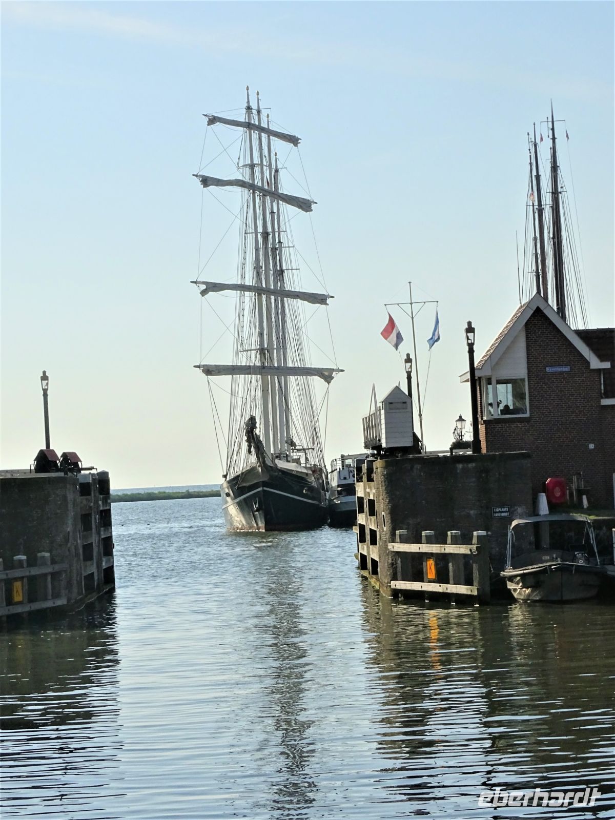 Gleich nach dem Frühstück legte die MS Aurora ab, um nach kurzer Fahrt das Städtchen Hoorn zu erreichen. Bei der Passage vom Ijsselmeer ins Marker Meer erlebten wir die Durchfahrt der einzigen Schleuse zwischen den beiden Meeren. Der Höhenunterschied ist nicht groß, aber mit