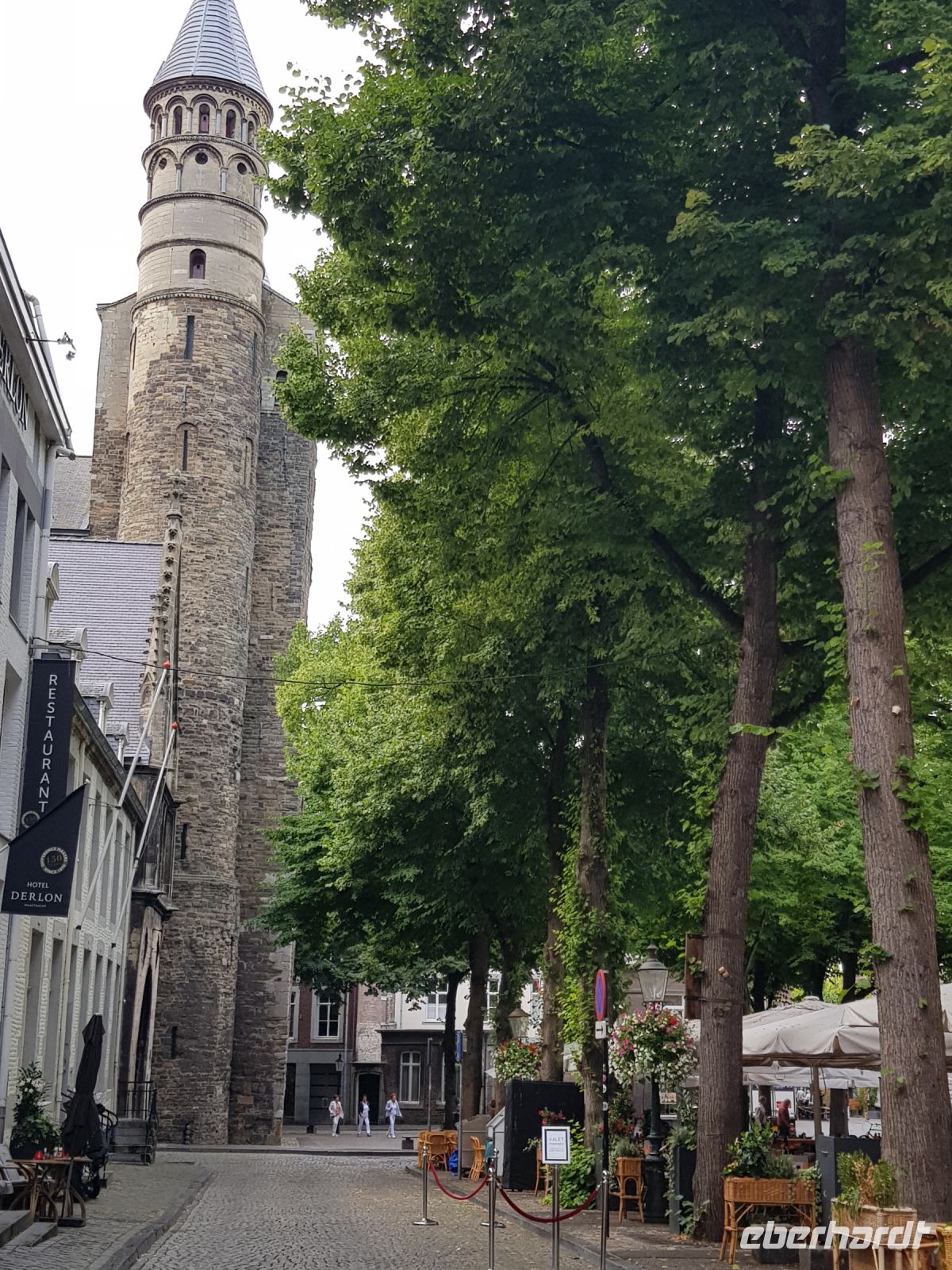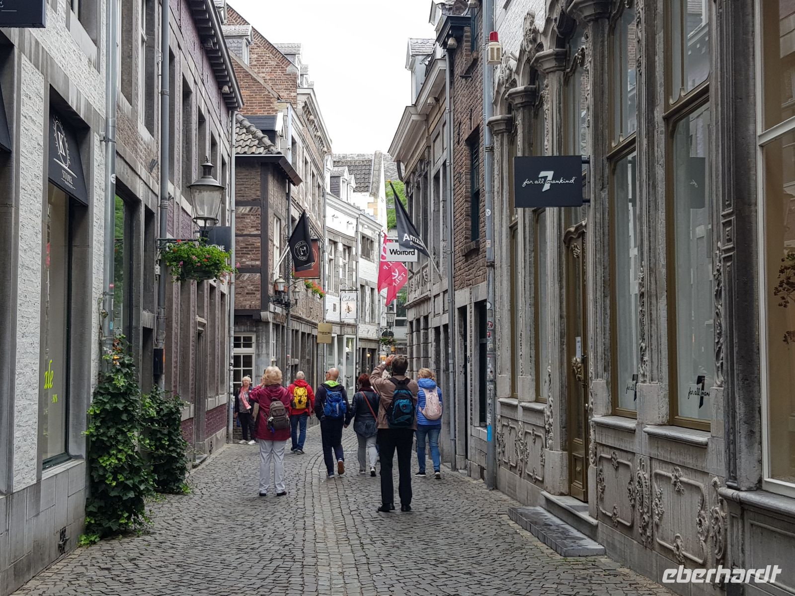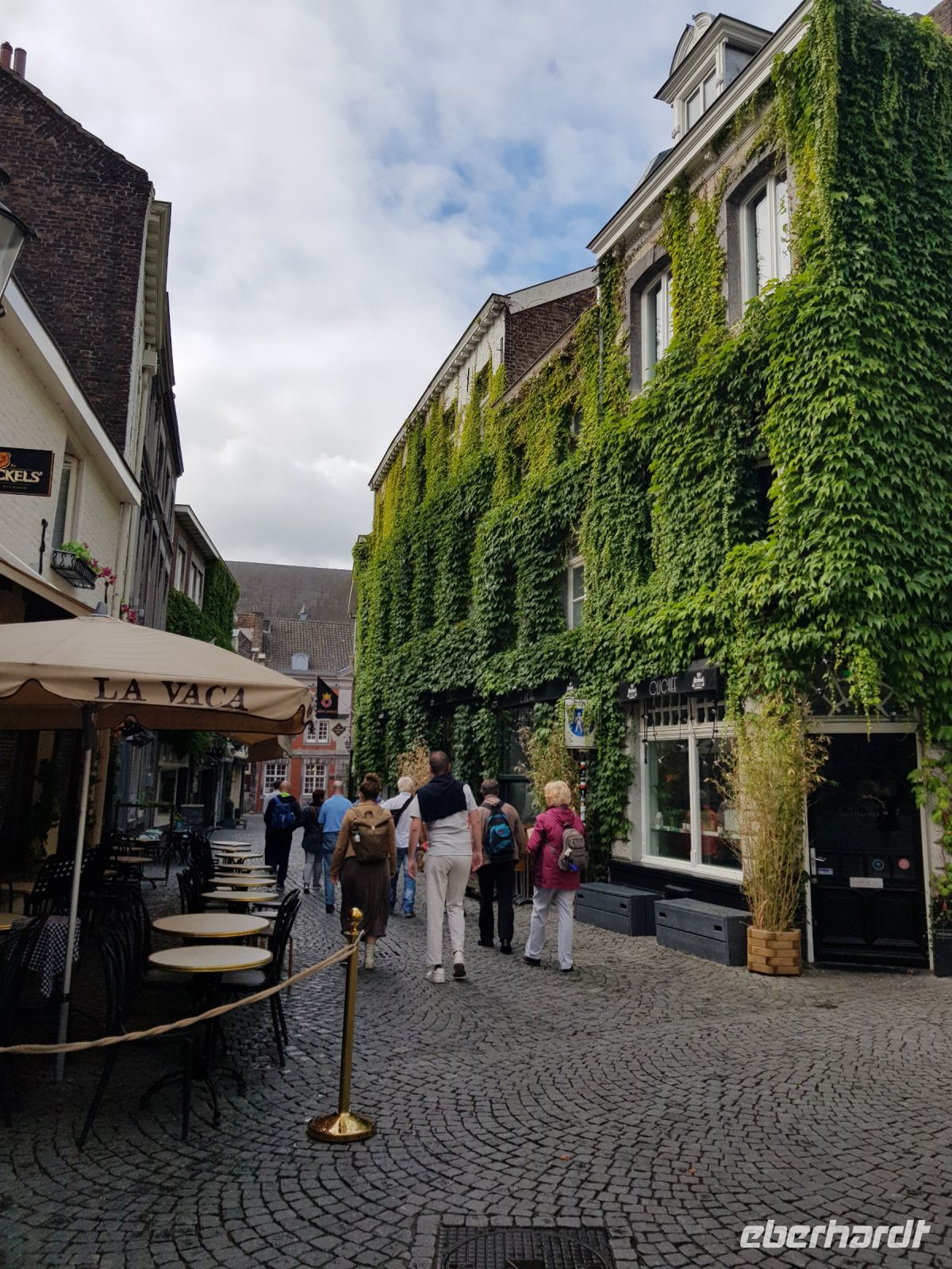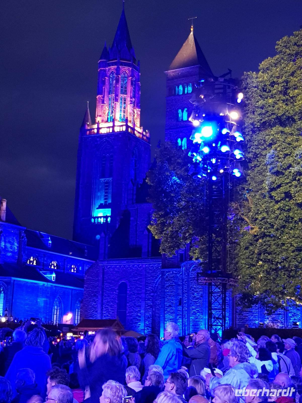 Ab 07:00 Uhr können wir frühstücken, 08:30 Uhr starten wir mit dem Bus zur Stadtführung in Maastrich ( Der Treffpunkt ist leicht zu finden , ein roter Stern ). Unsere Gruppe wird gedrittelt und auf geht es zur Stadtführung hauptsächlich durch die historische Altstadt. Das besondere Flair der Stadt, die engen Gassen, überall werden Vorbereitungen für das heute zum 1. Mal nach 2 Jahren stattfindende Konzert getroffen, reißt uns mit. Die Stadtführer verstehen es, uns "Appetit" auf mehr zu machen, die Stadt in der Freizeit näher zu erkunden, das Flair vor dem Konzert zu geniessen. Alle freuen sich darauf. Die Stadtführung endet vor dem Schiffsanleger und weiter geht es mit dem Schiff zum Pietersberg. Das die nächste Haltestelle die Einzige ist und wir schon nach 17 min. von Bord gehen müssen, stellt sowohl das Personal als auch die meisten der Gäste vor logistische Herausforderungen. Also: Torte/Kuchen in die Serviette wickeln, auf die Hand nehmen, vom Cappuccino einen heissen Schluck nehmen, damit von Bord gehen...Selbst der Kapitän muss ein wenig warten, weil die Reiseleiterin schnell für alle Gäste bezahlen muss.