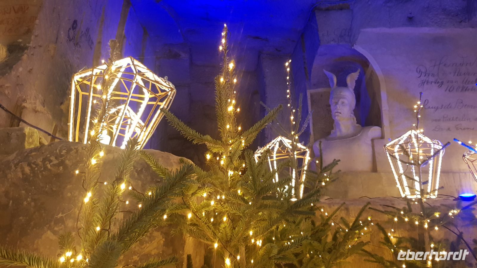 Nur einen Katzensprung von Maastricht entfernt liegt das Städtchen Valkenburg. Hoch über der Stadt thront die einzige Höhenburg der Niederlande, und darunter erstreckt sich ein faszinierendes unterirdisches System von Fluchtgängen und gewaltigen Kellern, die ursprünglich beim Abbau von Sedimentgestein entstanden. In diesen historischen Mergel-Grotten hat sich Europas einzigartiger und größter unterirdischer Weihnachtsmarkt etabliert, er begründet Valkenburgs Ruf als „Weihnachtsstadt der Niederlande“. In der gut besuchten "Gemeentegrot" befanden sich untertage ein schillernder Weihnachtsmarkt mit Lichtobjekten und einer erstaunlich vielseitigen Auswahl an handwerklichen und kulinarischen weihnachtlichen Marktständen, die es zu bestaunen galt.