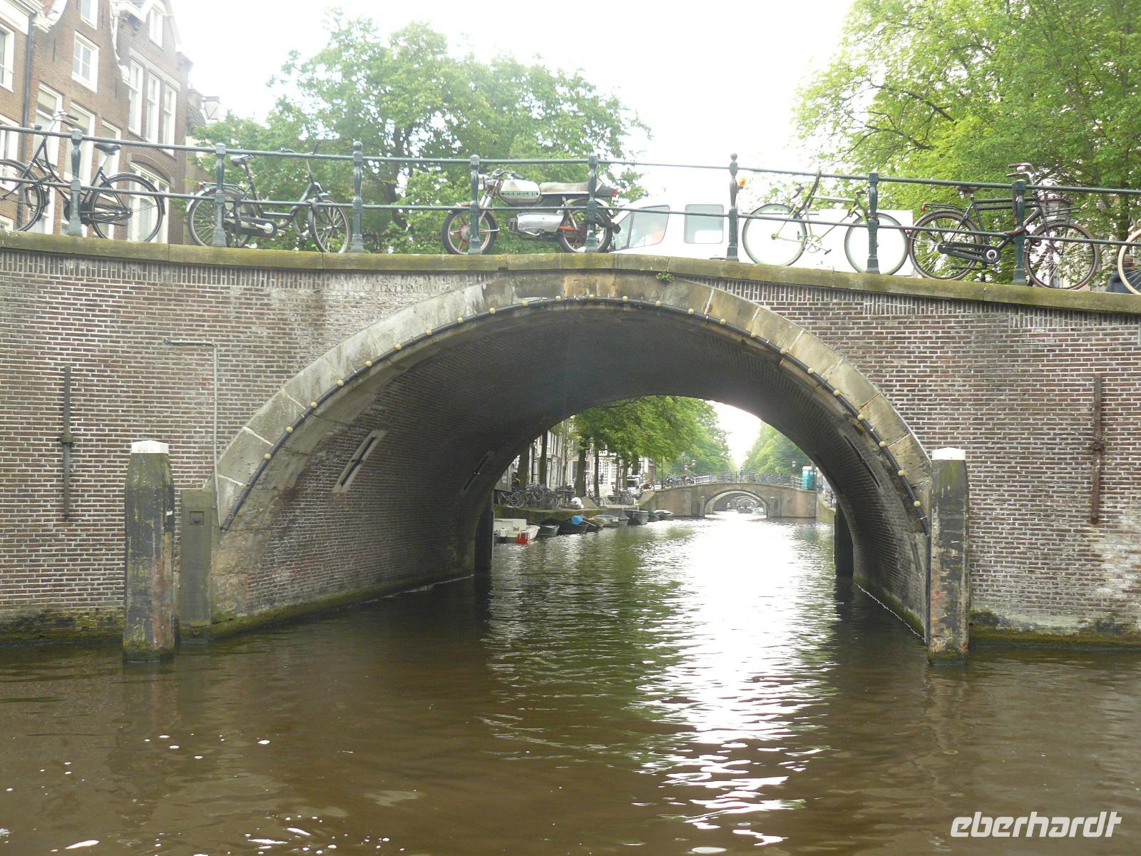 Die Wettervorhersage hatte uns schon vorgewarnt: ein Regentag begann! Bis zum Zug kamen wir noch problemlos. Auf Vorschlag der Reiseleiterin änderten wir das Programm ab. Wir vertauschten einfach die Reihenfolge, und zwar so, dass wir den Regennachmittag im trockenen Museum verbrachten. Fakultativ war der Besuch des Vincent-van-Gogh-Museums angedacht, und dieser Vorschlag wurde von 10 Gästen begeistert angenommen. 2 Gäste zogen das Reichsmuseum mit den Gemälden von Rembrandt vor. Aber auch das war trocken. Der Vormittag war noch freundlicher. Zwar erstrahlte der Himmel in mausgrau, doch der Regen war zunächst noch spärlich. Die Reiseleiterin führte die Gäste also durchs Zentrum der alten Seefahrermetropole zum Damplatz. Dann schlängelten wir uns zwischen klingelnden Fahrrädern hindurch zum Grachtengürtel. 4 Ringkanäle umgeben das Zentrum Amsterdams, die früher v.a. zur Entwässerung des sumpfigen Bodens dienten und auch als An- und Abreiseweg. Im 17. Jh., dem goldenen Zeitalter der Stadt, wurde dieses riesige Bauprojekt in Angriff genommen. Damals hatten die Kanäle auch noch eine andere Funktion: irgendwo musste ja das Abwasser und der Müll hin... Dankbar nahmen wir zur Kenntnis, dass die Niederländer heute ihr Abwasserproblem anders gelöst haben. Aber die unorthodoxe Müllentsorgung mancher Amsterdamer führt trotzdem dazu, dass jährlich 15.000 Fahrräder, tausende Einkaufswagen und hunderte Kühlschränke aus den Fluten gefischt werden müssen, sonst würden die Ausflugsboote bald stecken bleiben.