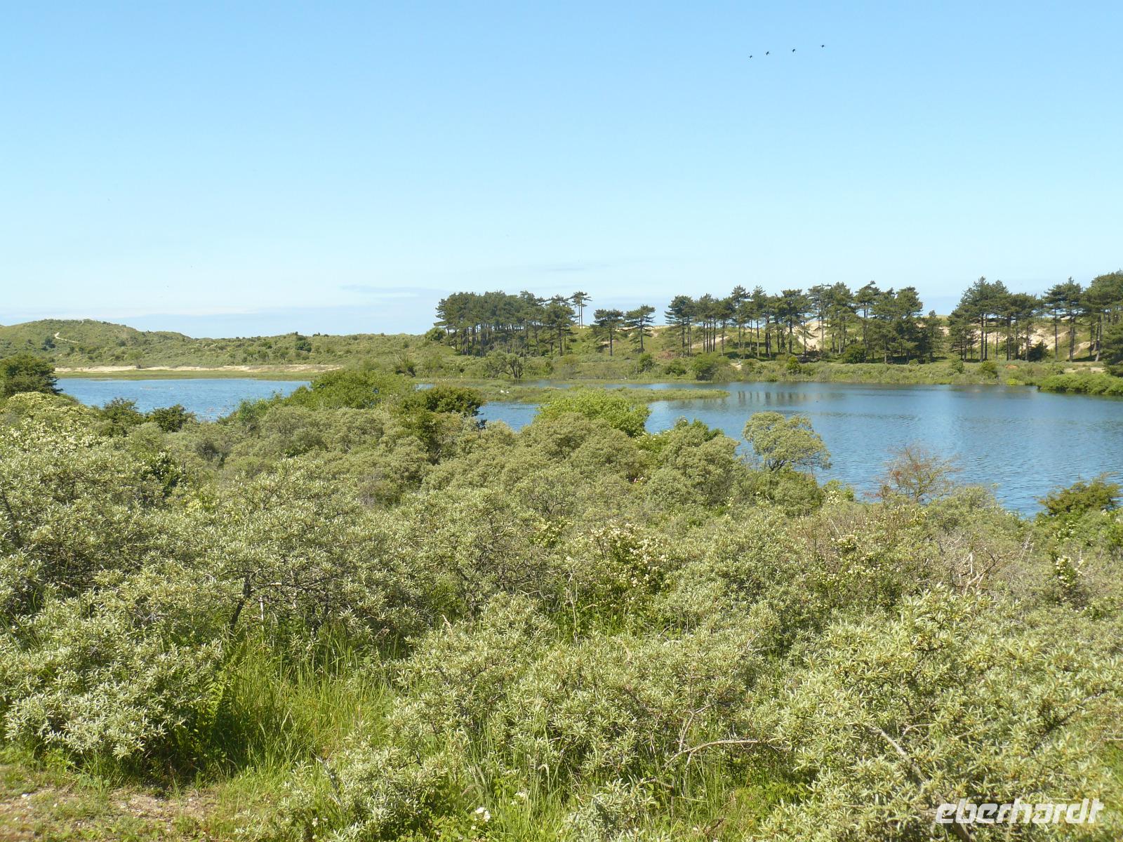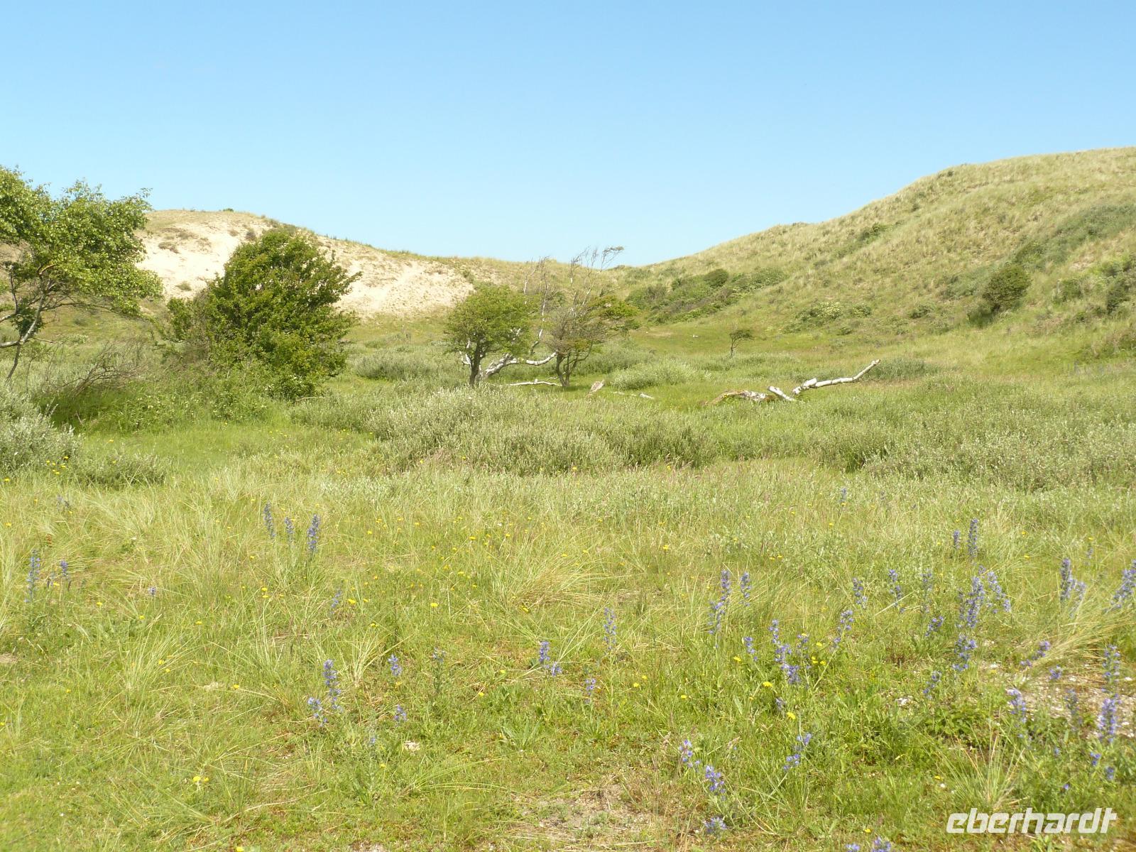 Nun hatten wir endlich Glück mit dem Wetter: die Sonne strahlte und es wurde kräftig warm. Nicht so heiß wie zeitgleich in Deutschland: dort schwitzten die Daheimgebliebenen bei 35 Grad. Wir konnten die Wärme noch genießen bei 26 Grad. Unser Weg führte uns durch die unter Naturschutz stehende, wunderschöne Dünenlandschaft, die teils bewaldet, teils mit Heide überzogen war. Um die Heide daran zu hindern, zu Wald zu werden, haben die Niederländer Highlander-Rinder aus Schottland und Wildpferde ausgesetzt. Wie benimmt man sich, wenn man auf eine große dicke Kuh trifft...? Die Reiseleiterin hielt lange Vorträge darüber - aber dann kam keine Kuh.